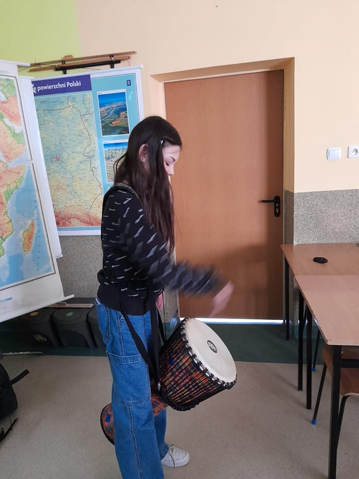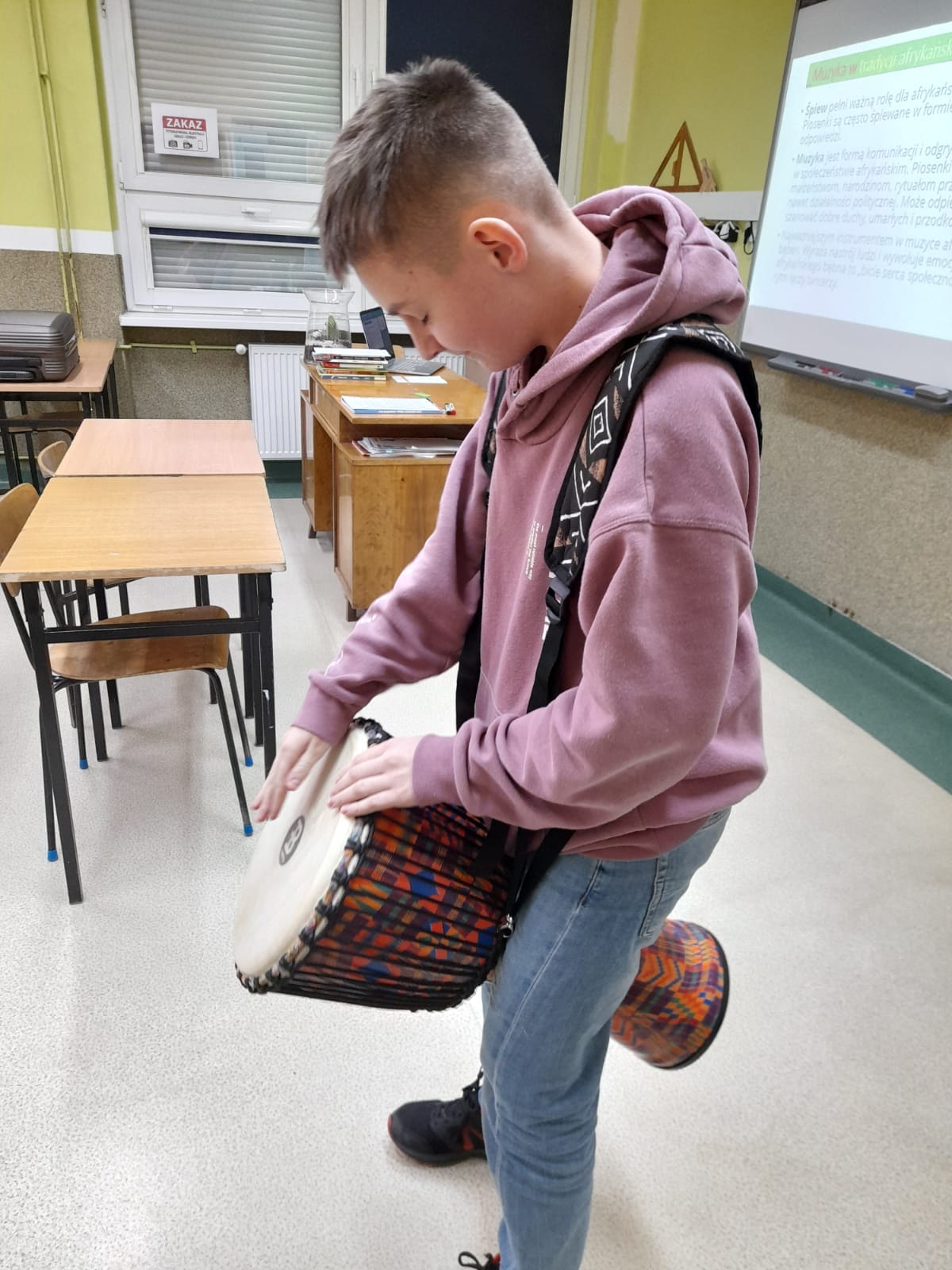W ramach geografii w klasie ósmej, tematy z działu Afryka, zostały urozmaicone lekcją żywej kultury. Uczniowie mogli "namacalnie" spróbować grać na djembe, poznali instrumenty etniczne. Każdy mógł aktywnie pozować z bębnem, a wykonanie fotografii ułatwił gimbal, pozyskany z programu #laboratoriaprzyszłości.