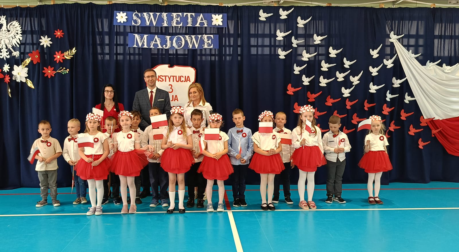 W naszym przedszkolu uroczyście obchodziliśmy majowe święta patriotyczne. Dzieci wzięły udział w apelu, podczas którego z dumą prezentowały się w barwach biało-czerwonych ![]()