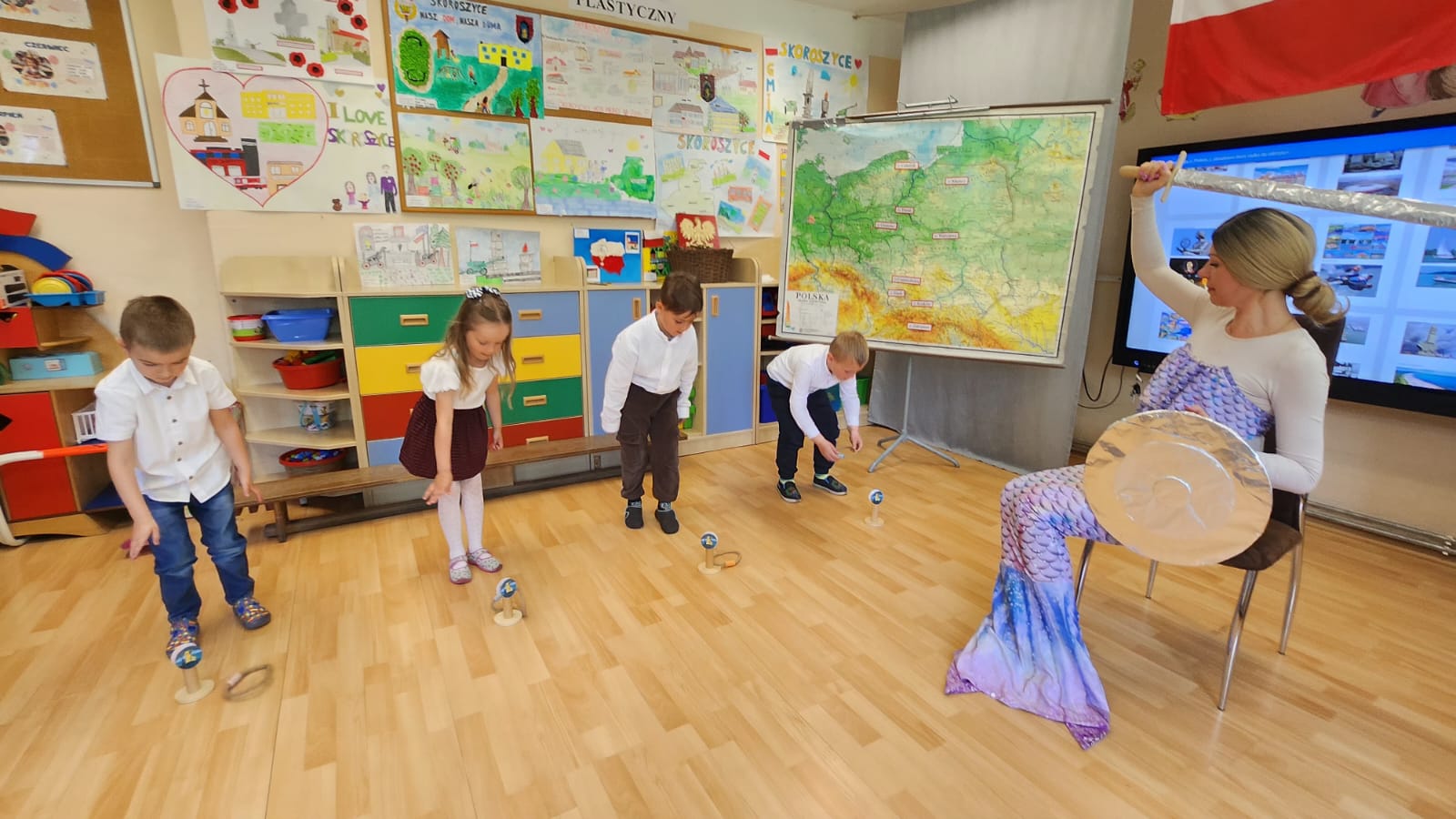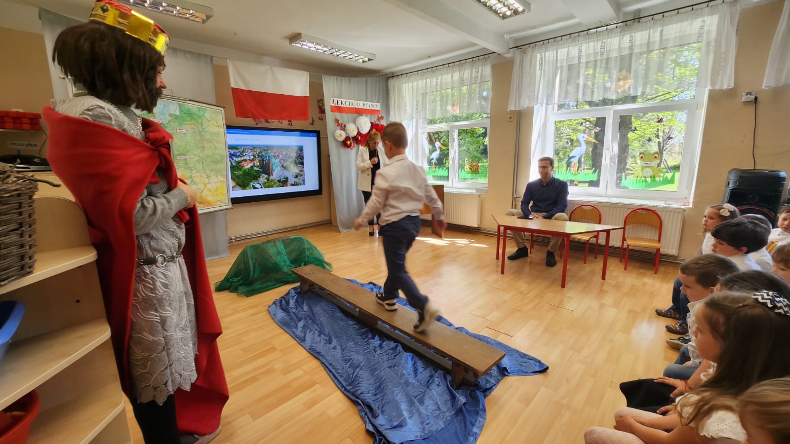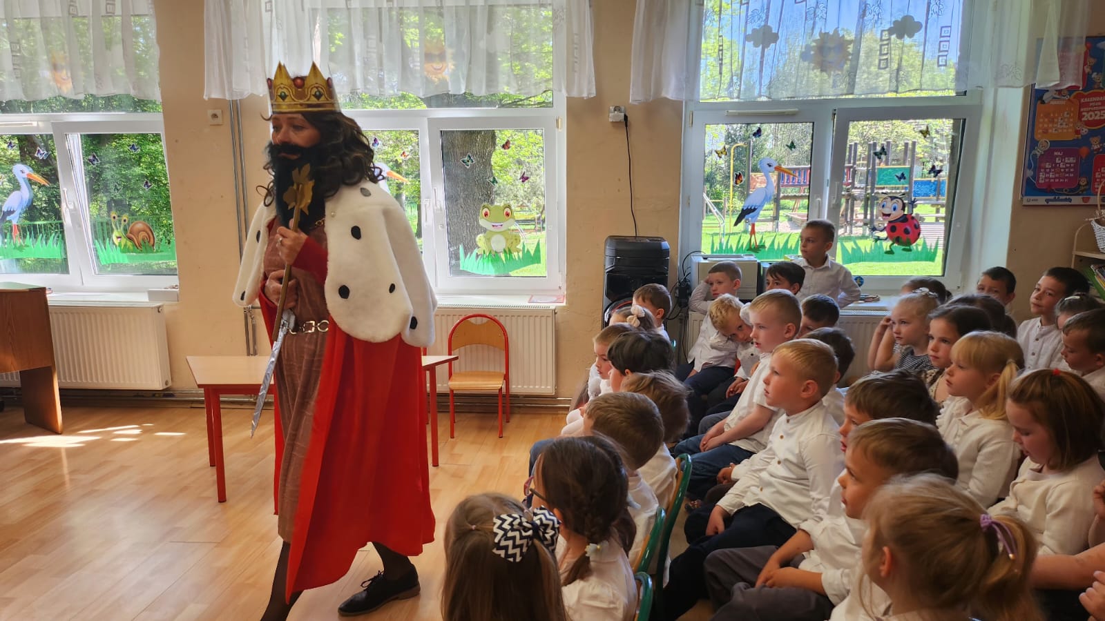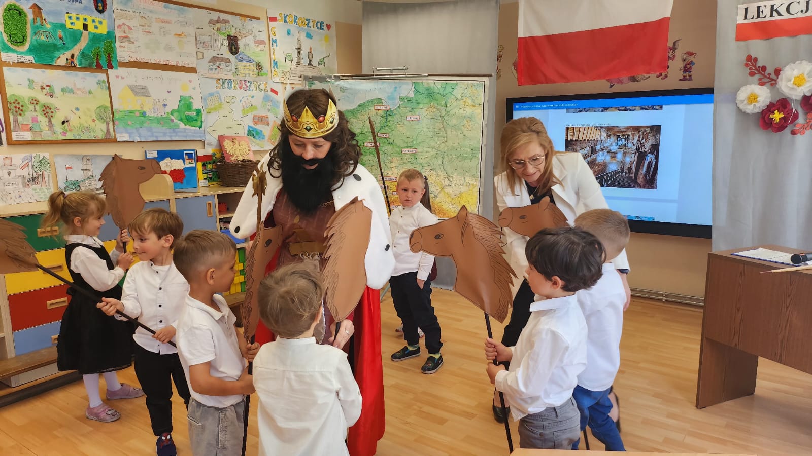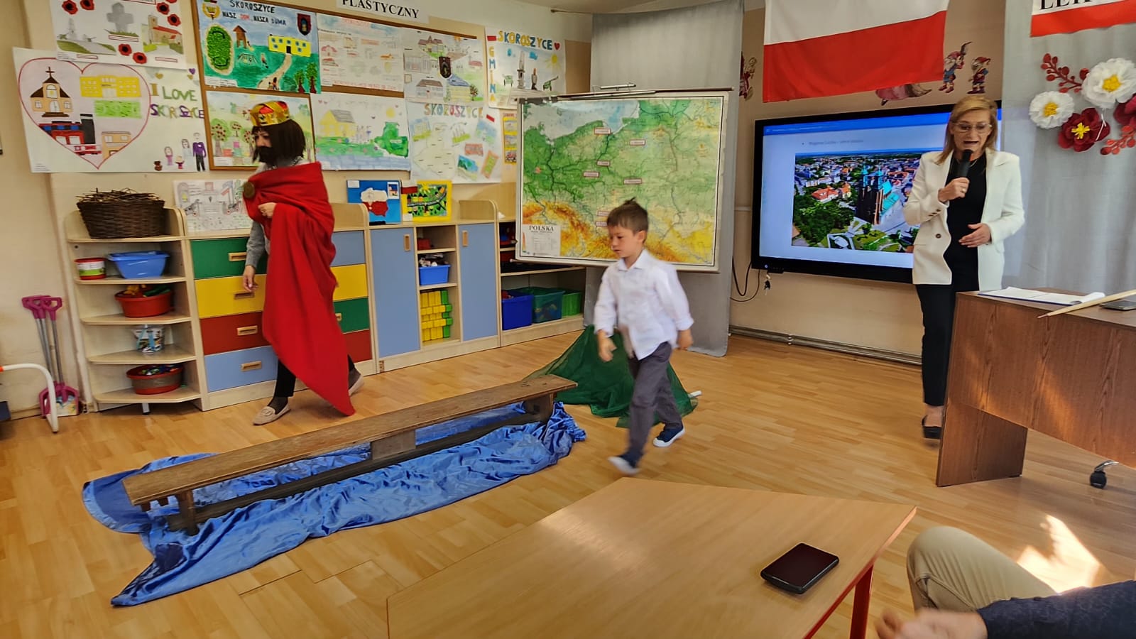 W ramach realizacji innowacji pedagogicznej „Kocham Cię, Polsko!” 29 kwietnia w naszym przedszkolu odbyło się wyjątkowe wydarzenie – przedstawienie pt. „Lekcja o Polsce” w wykonaniu nauczycieli, połączone z prezentacją multimedialną i aktywnościami ruchowymi dla dzieci.