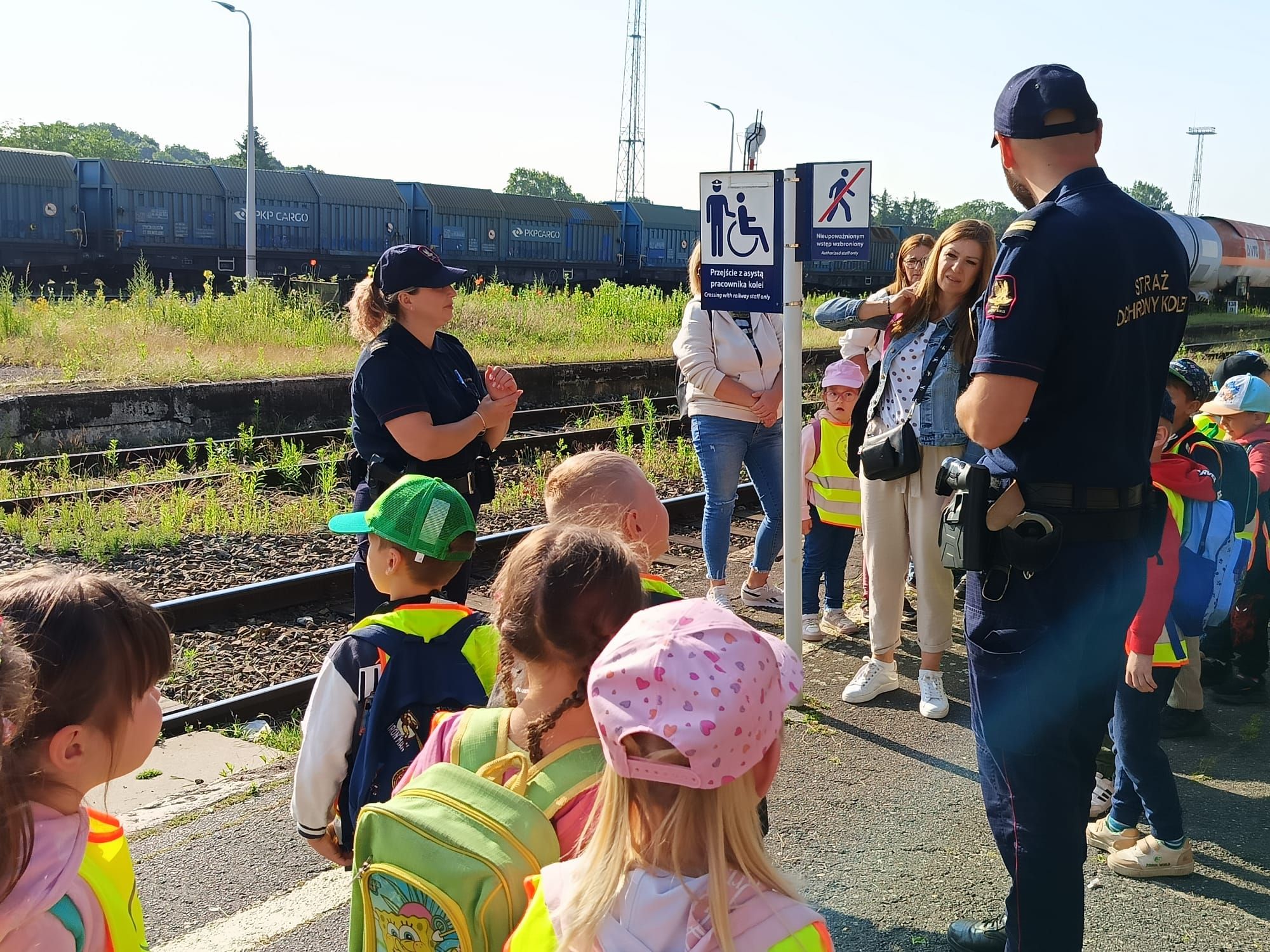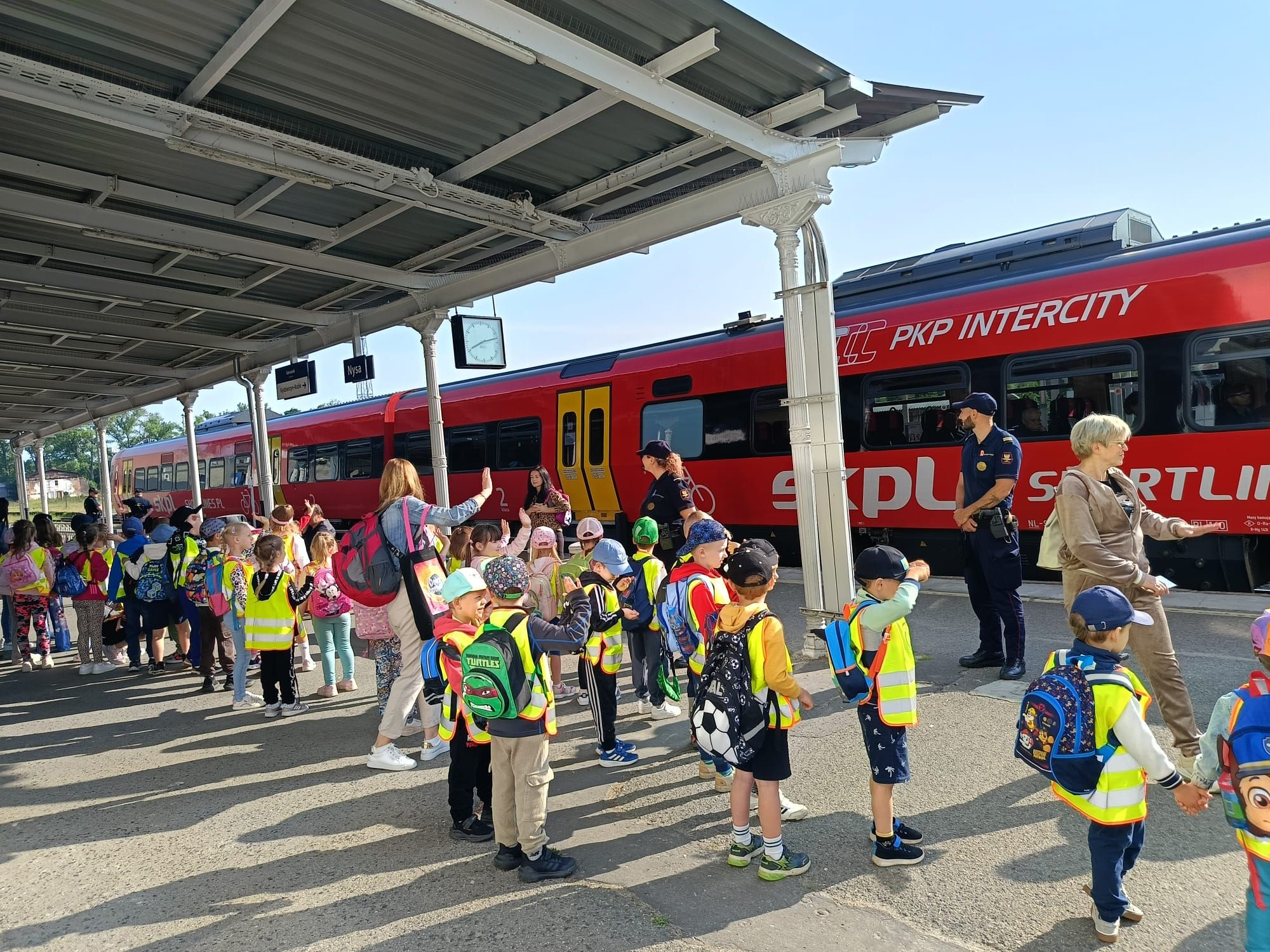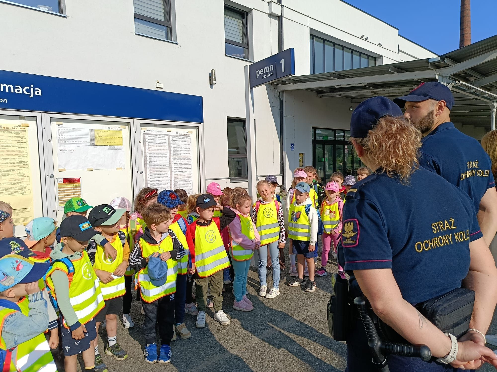 Już na dworcu PKP czekała na nas niespodzianka – spotkanie ze Strażnikami Ochrony Kolei , którzy w ciekawy sposób opowiedzieli dzieciom o swojej pracy oraz o zasadach bezpieczeństwa na dworcach i w pociągach .