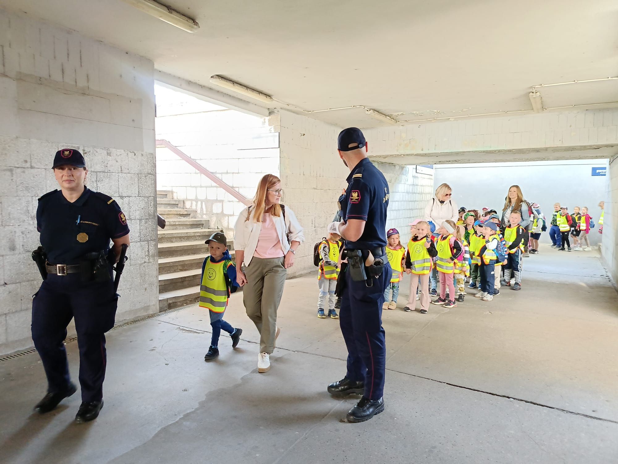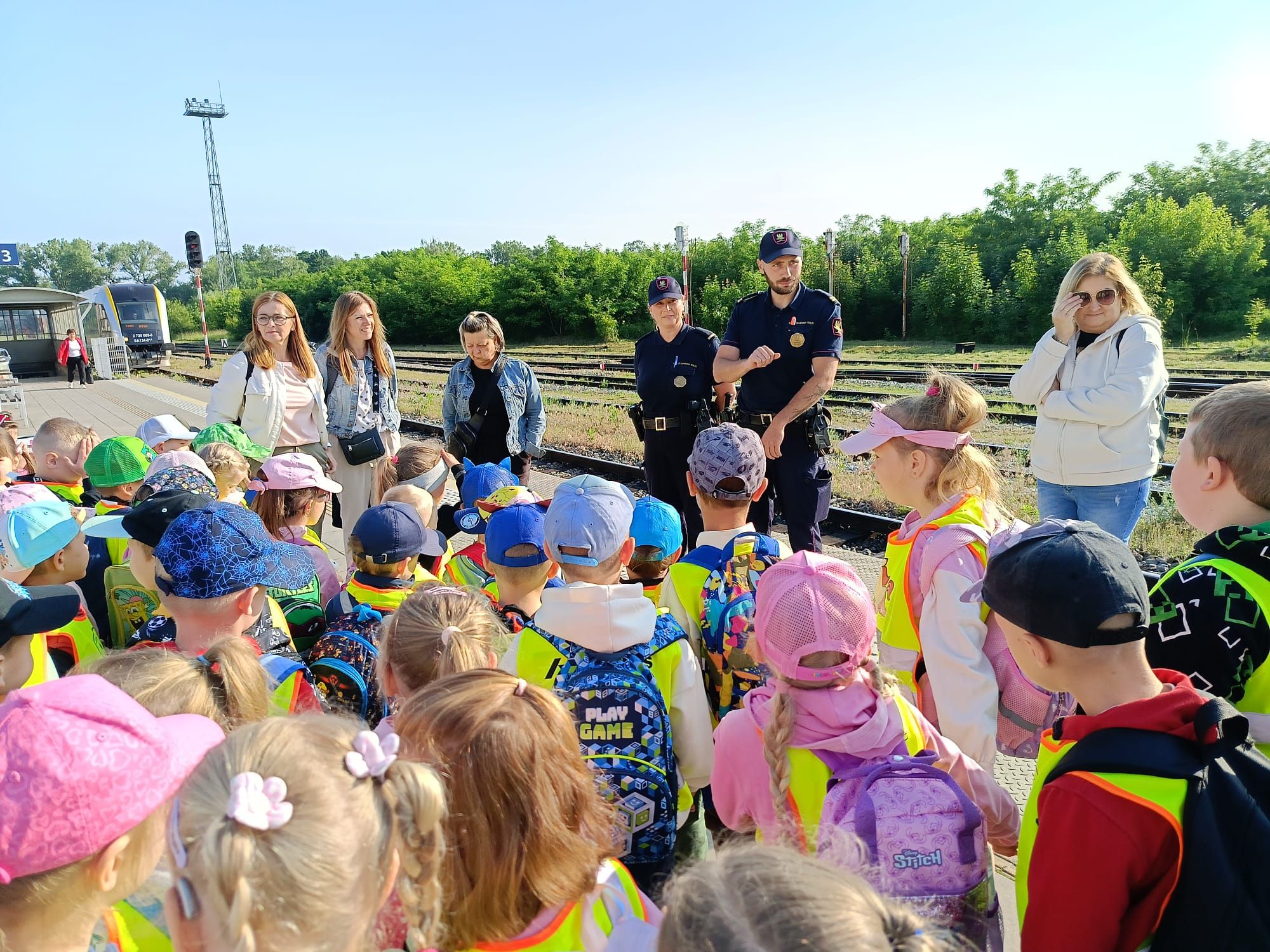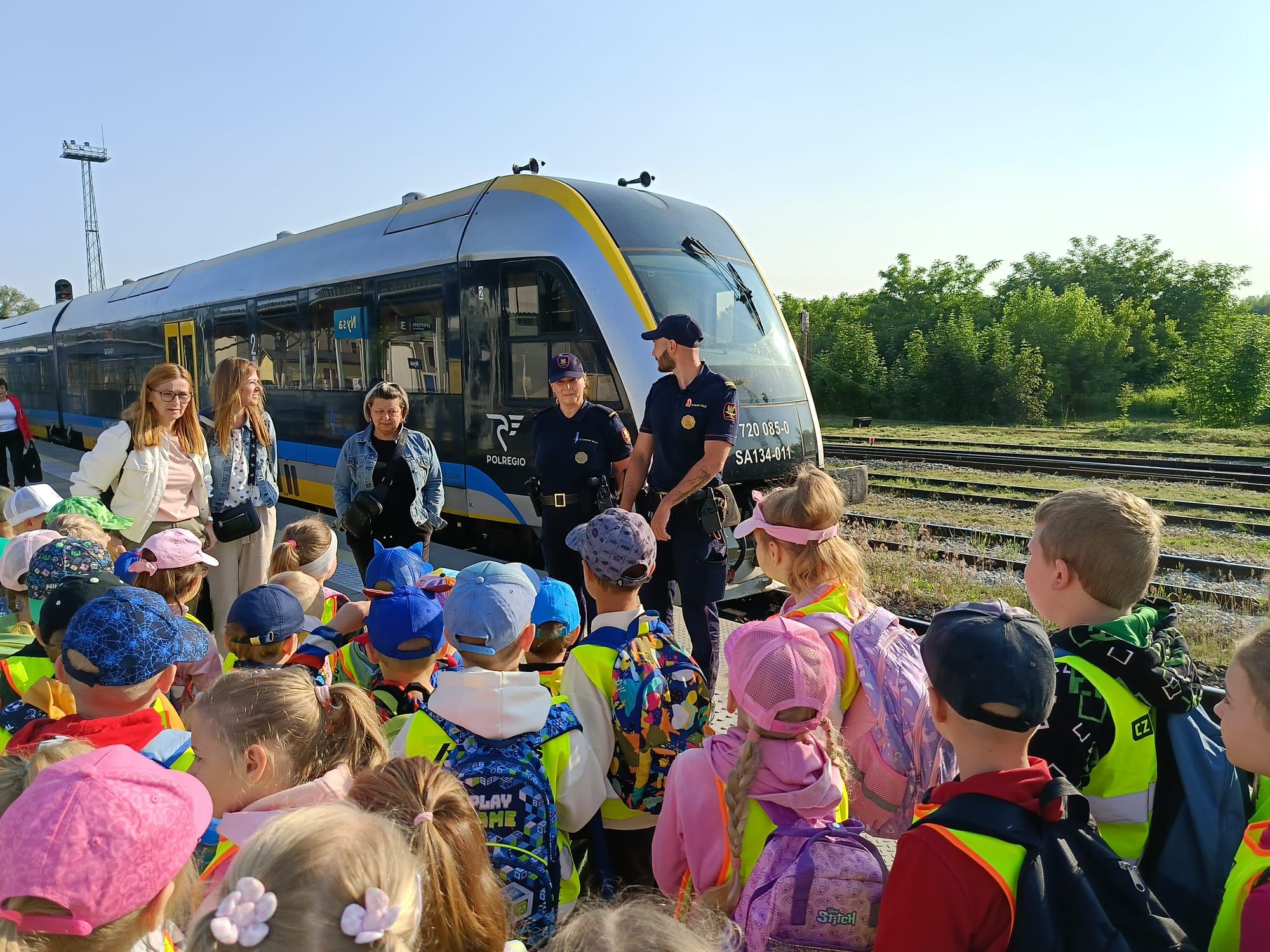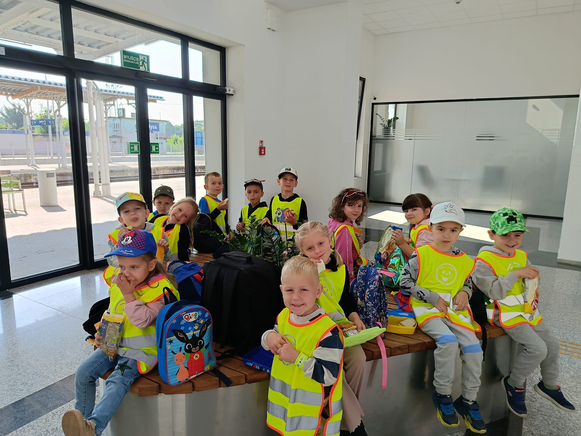 Już na dworcu PKP czekała na nas niespodzianka – spotkanie ze Strażnikami Ochrony Kolei , którzy w ciekawy sposób opowiedzieli dzieciom o swojej pracy oraz o zasadach bezpieczeństwa na dworcach i w pociągach .