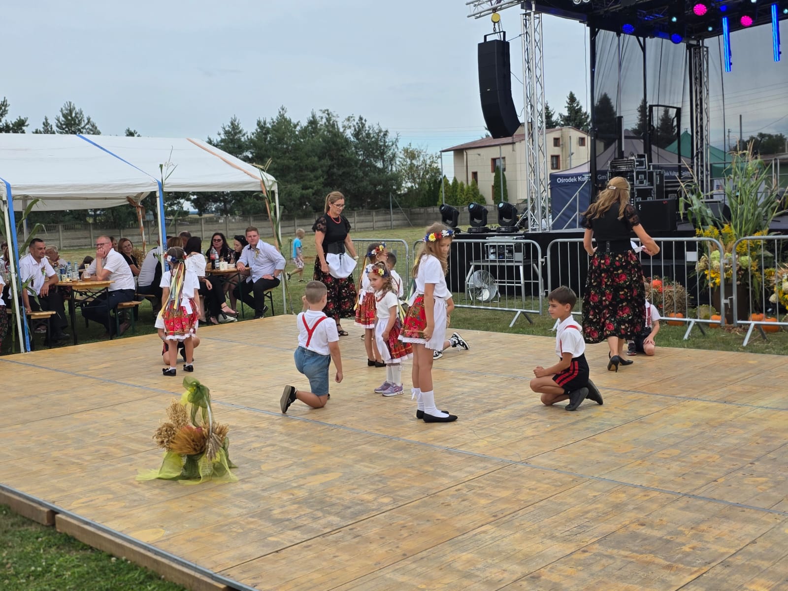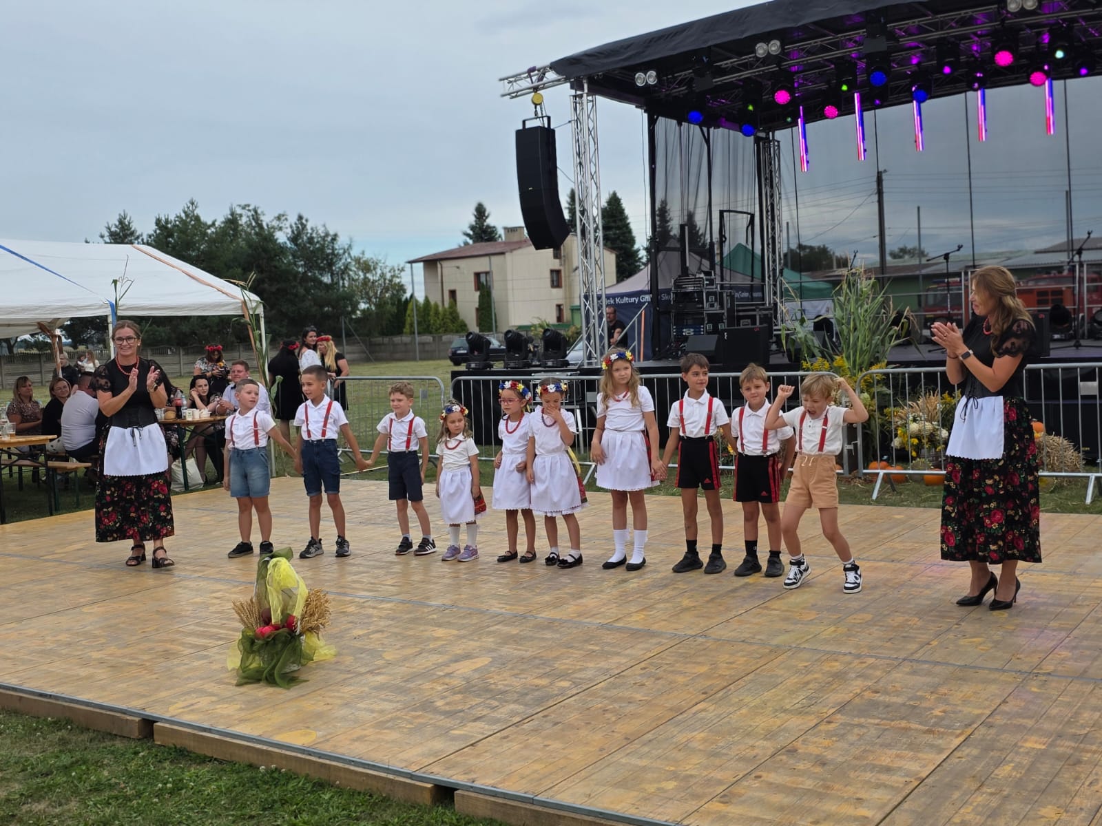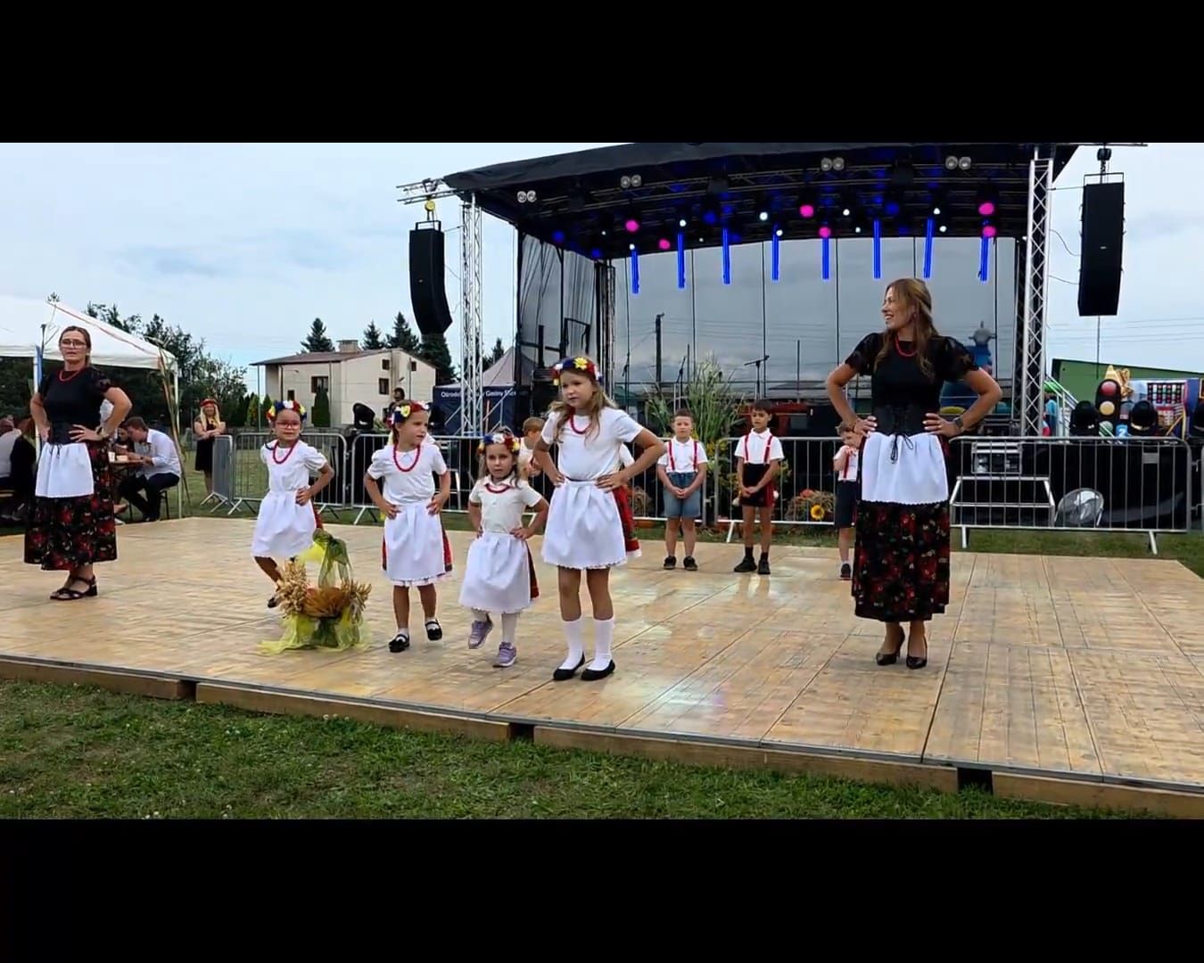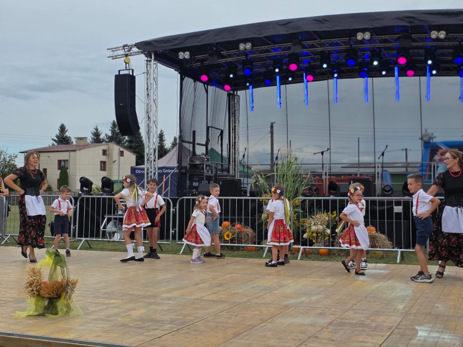 Dzieci z ogromnym zaangażowaniem i radością zaprezentowały swoje umiejętności, wprowadzając wszystkich w radosny, dożynkowy nastrój.