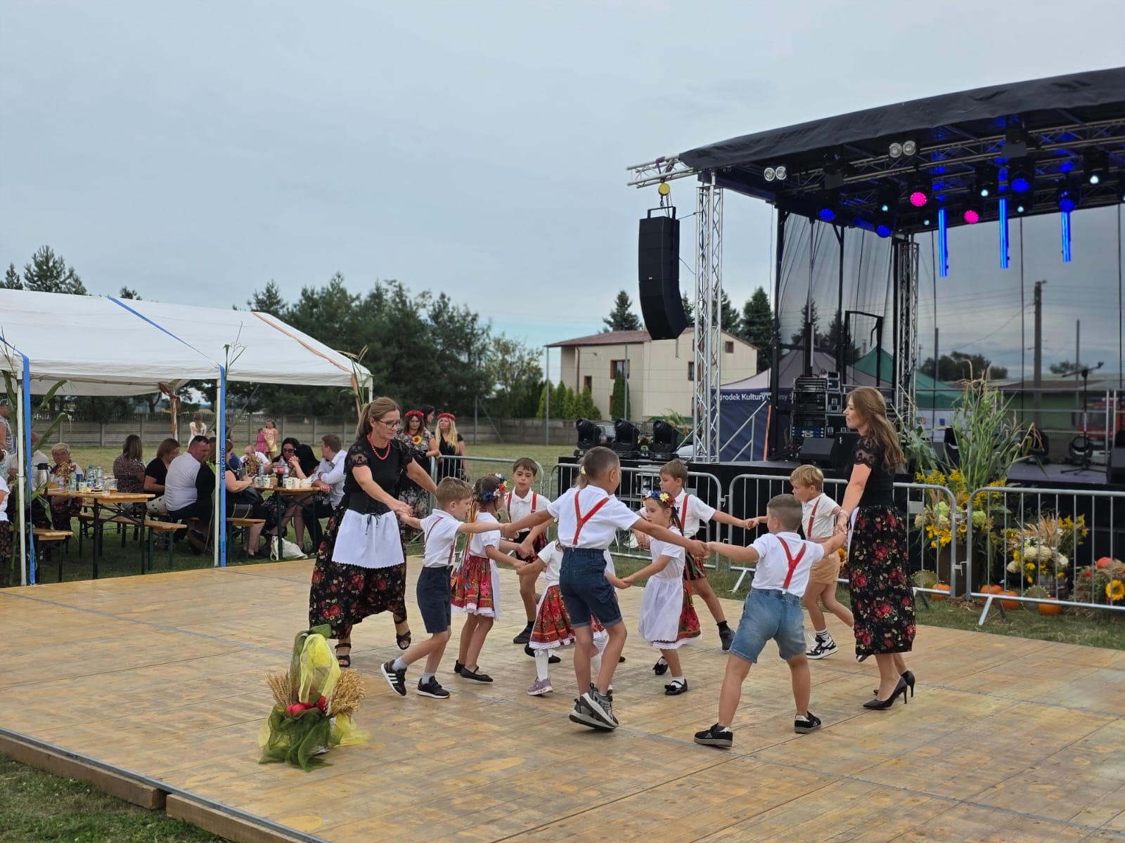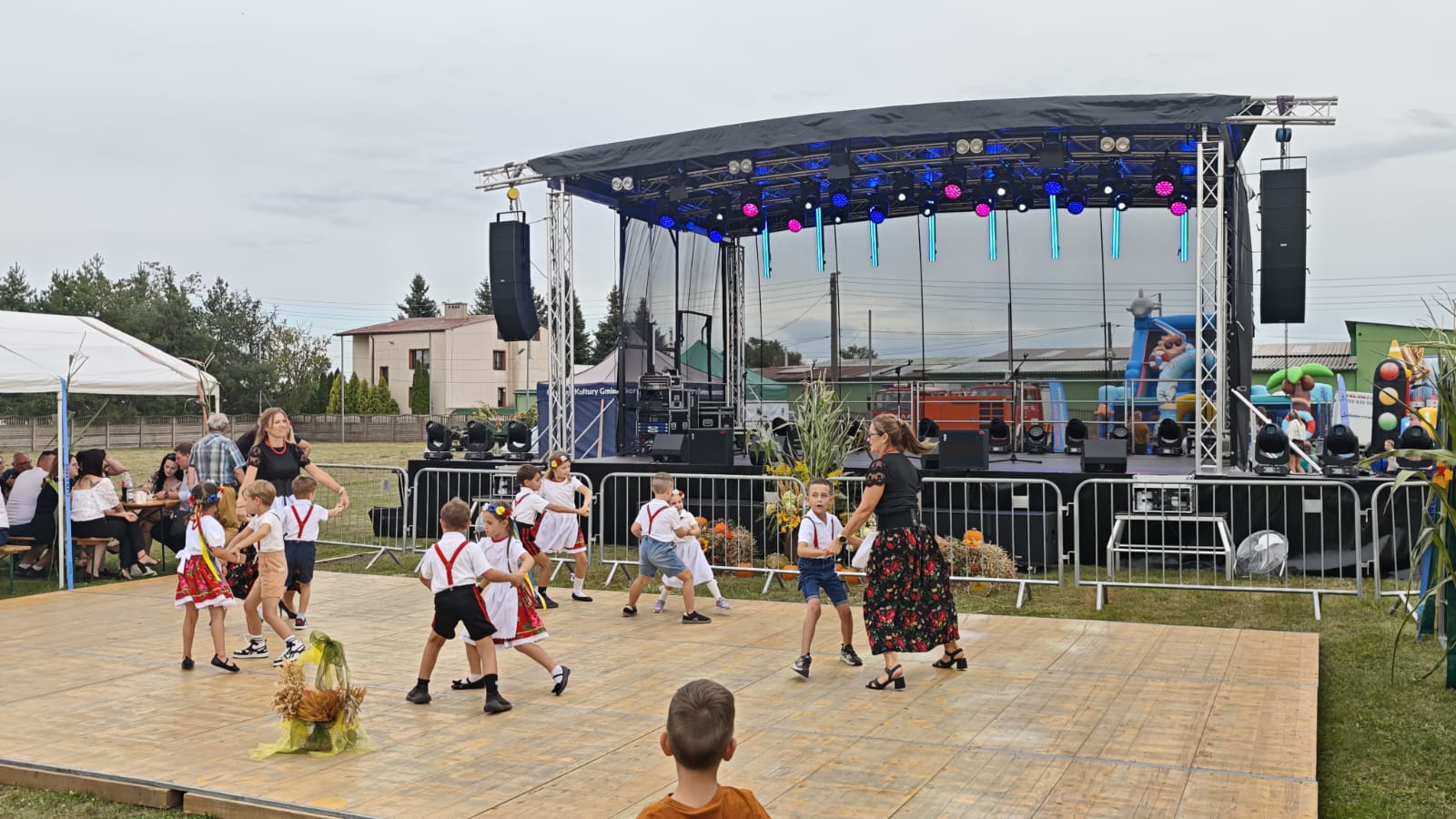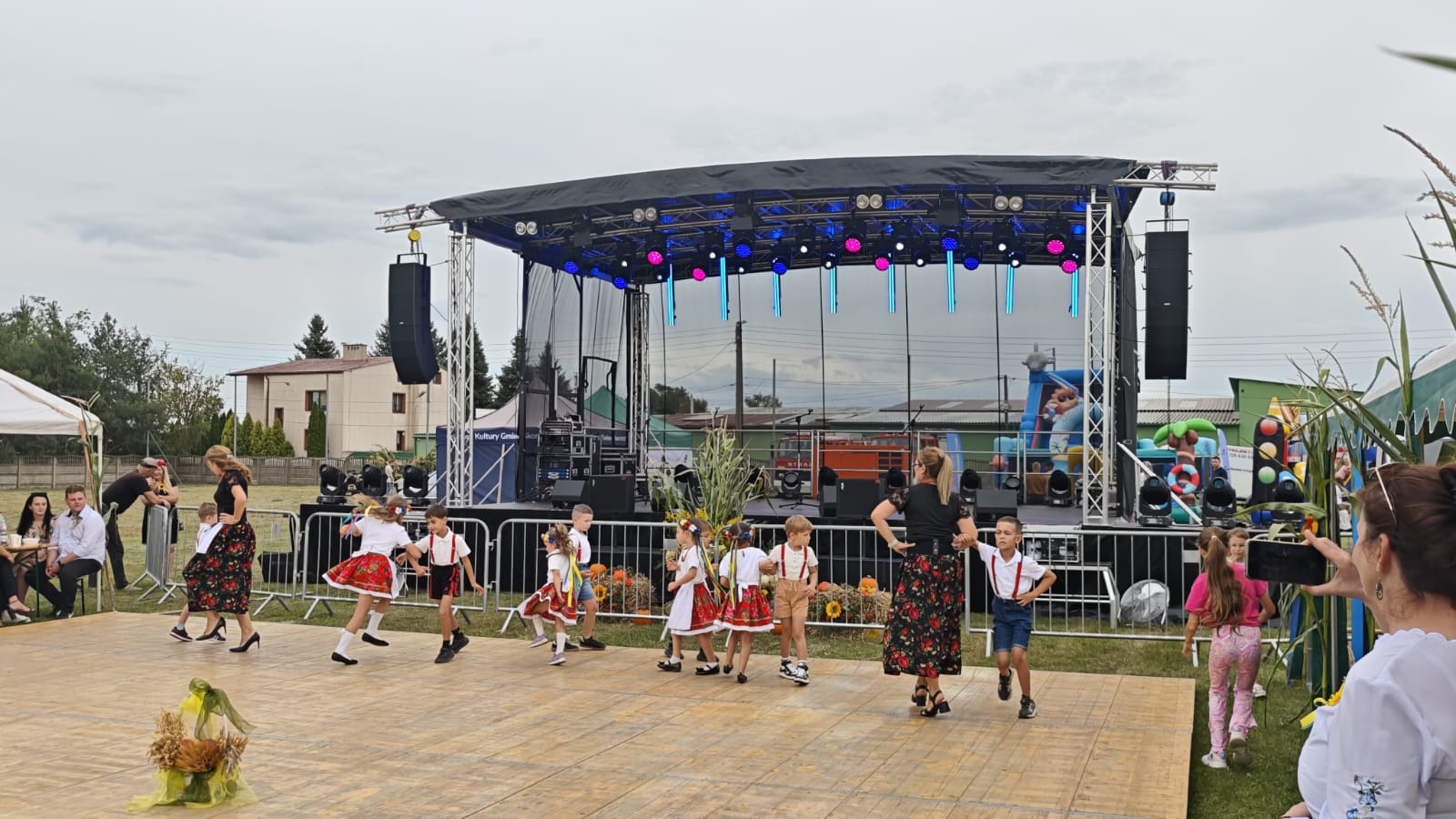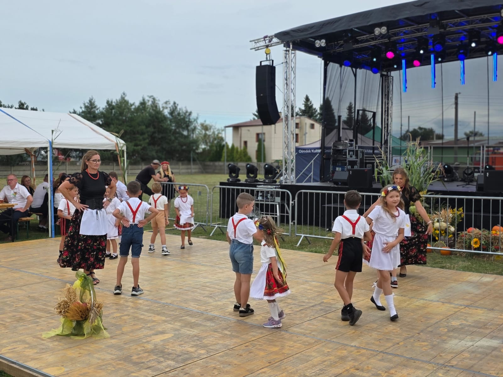 Dzieci z ogromnym zaangażowaniem i radością zaprezentowały swoje umiejętności, wprowadzając wszystkich w radosny, dożynkowy nastrój.