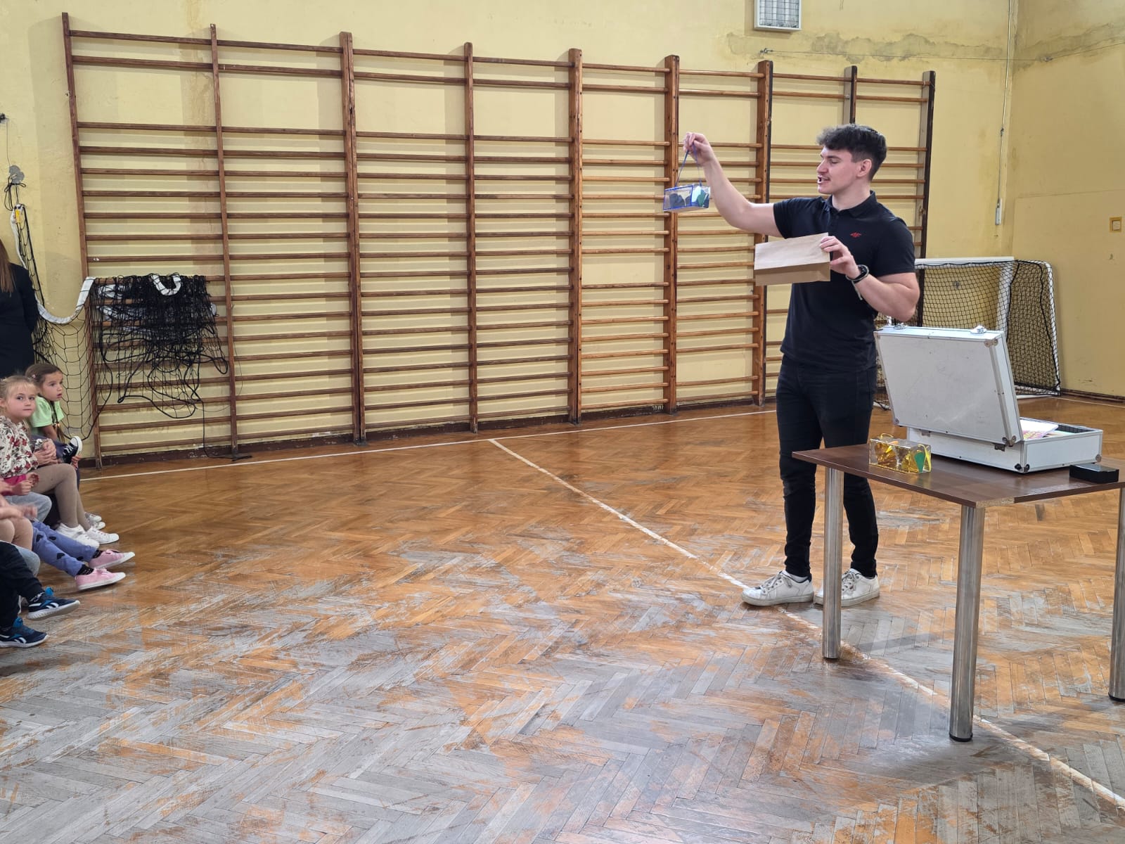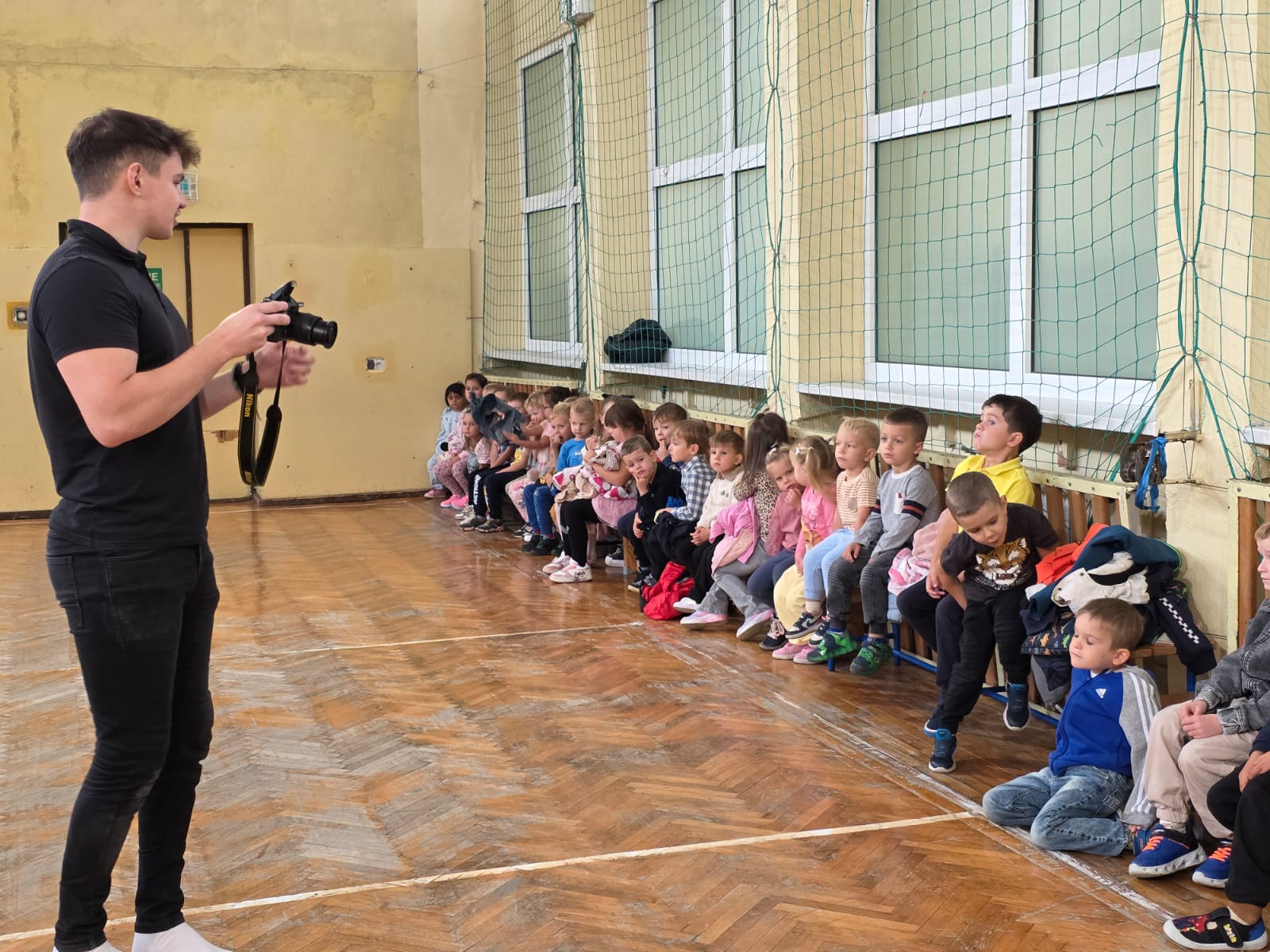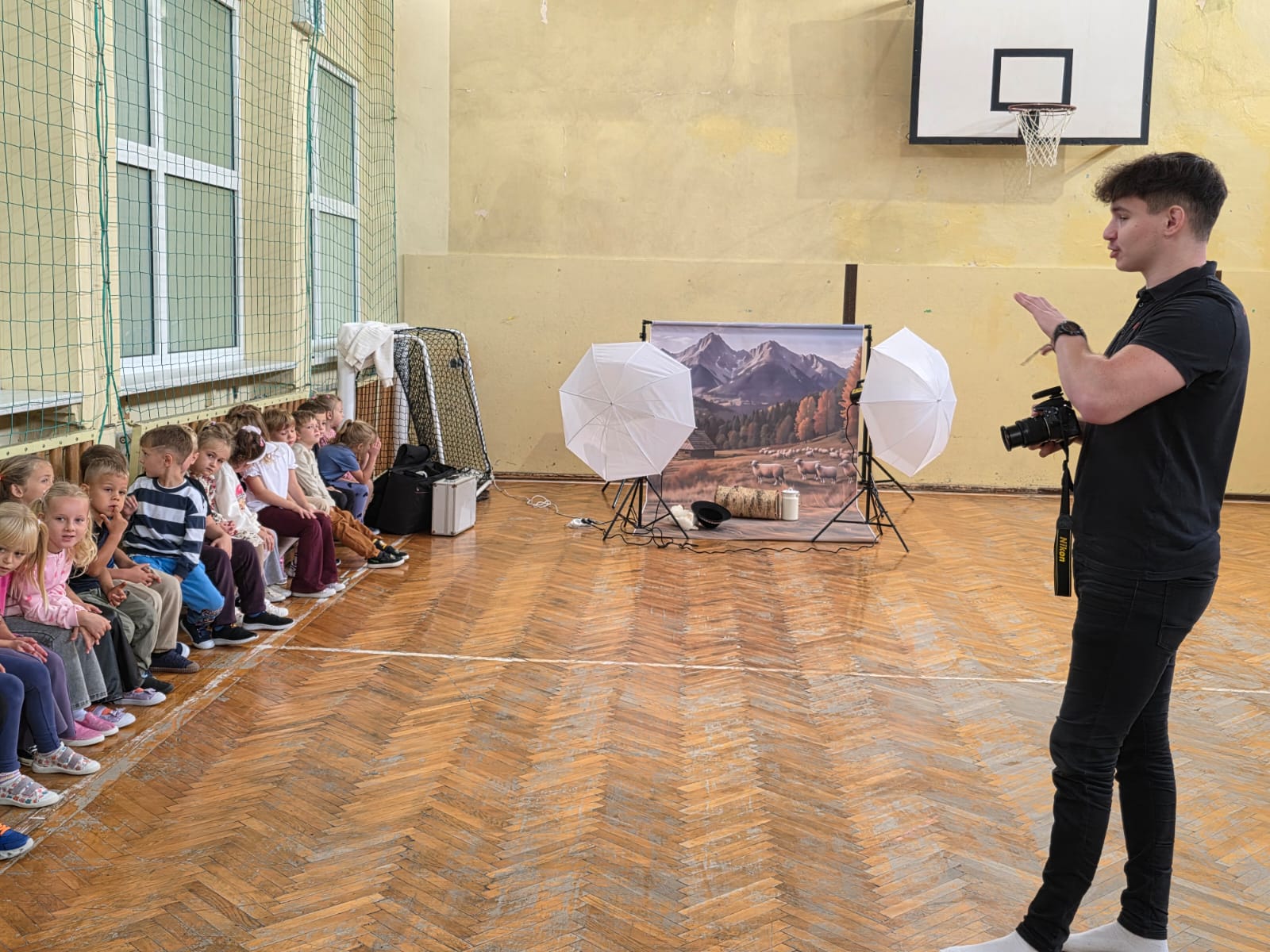 Pan fotograf opowiedział dzieciom, na czym polega jego praca, omówił zasady działania aparatu i pokazał akcesoria potrzebne zarówno do wykonywania zdjęć, jak i do przeprowadzenia sesji zdjęciowej.
