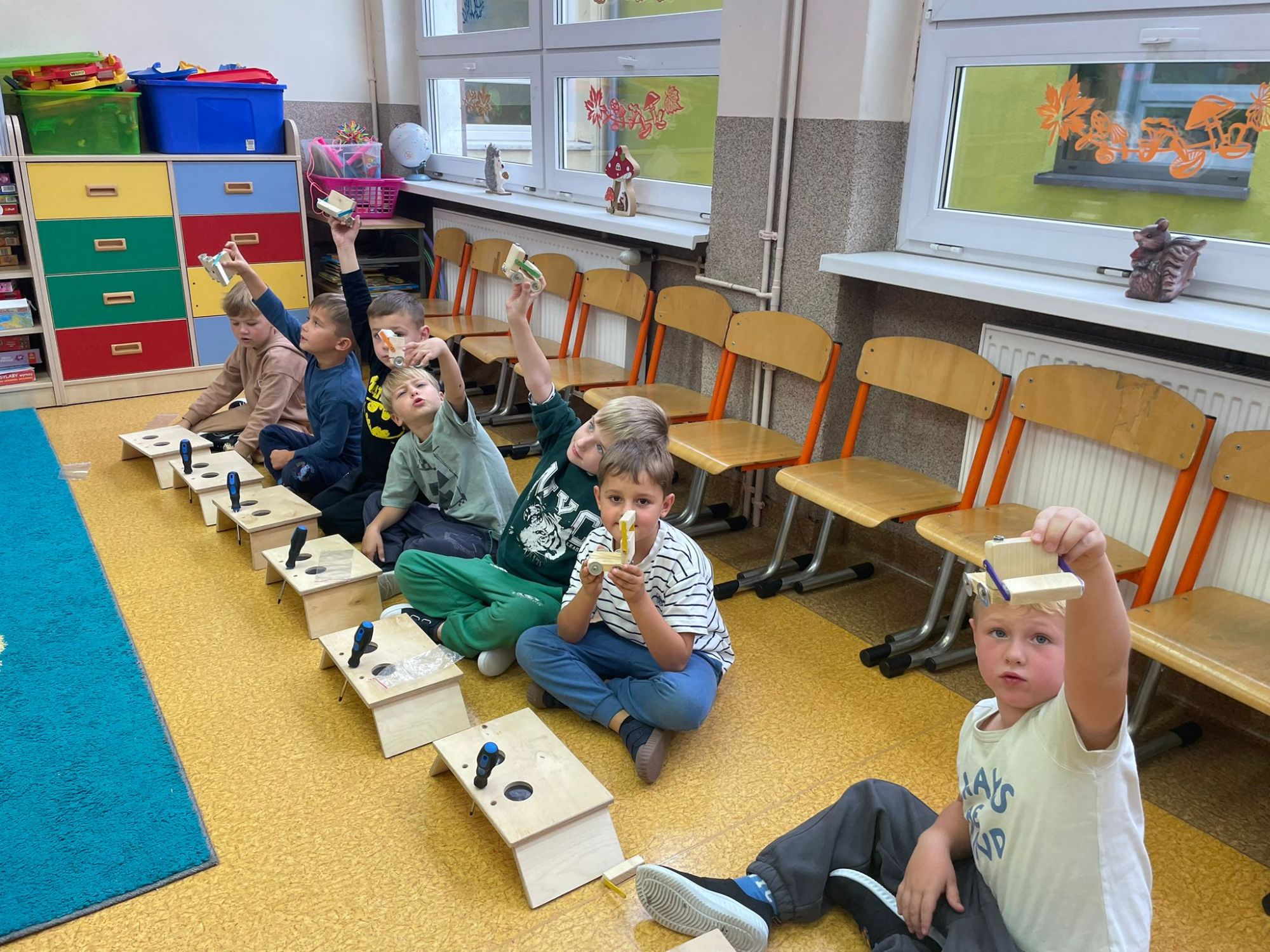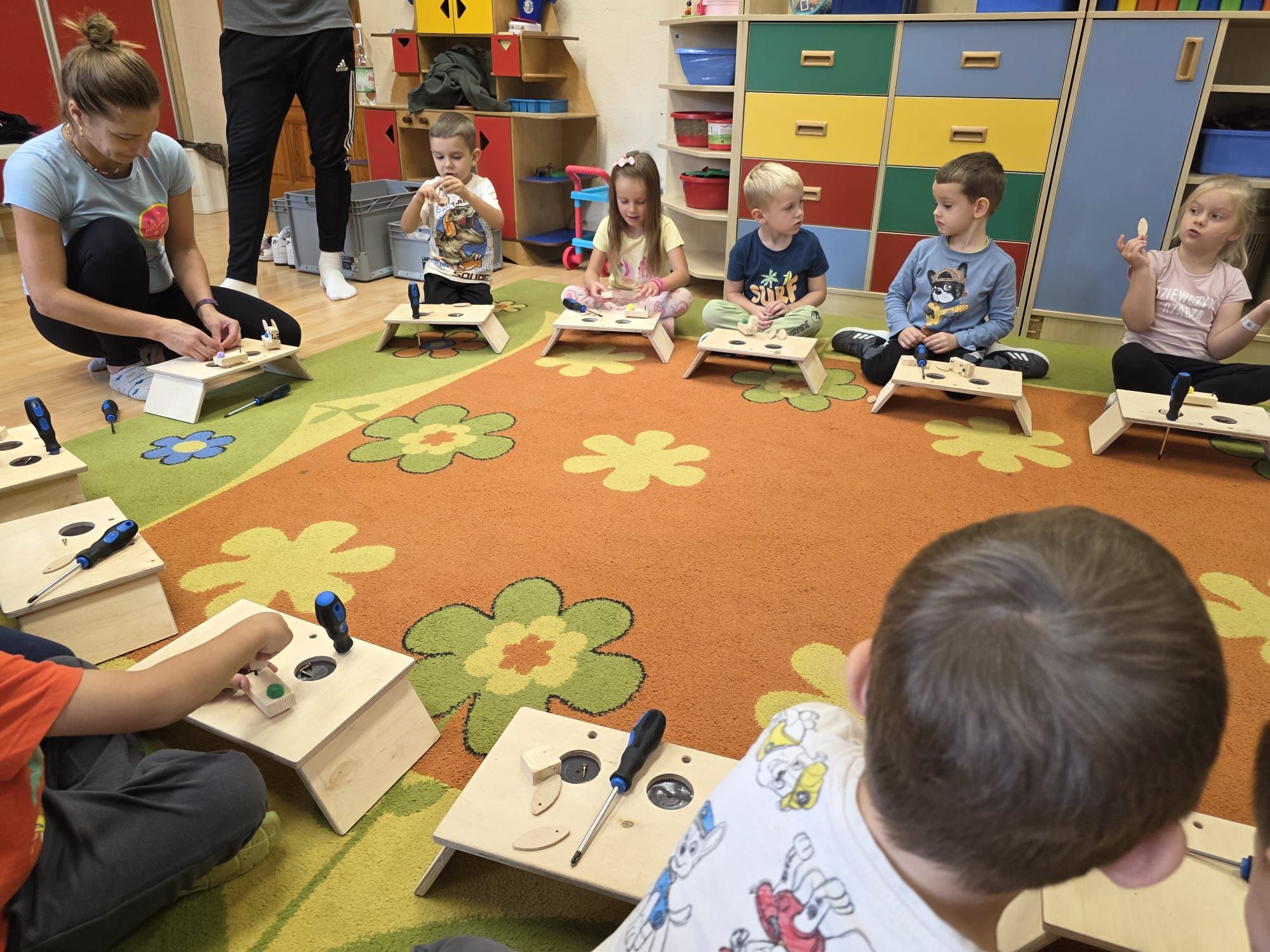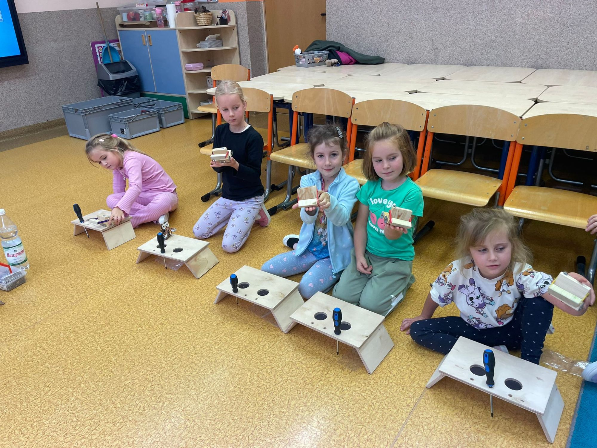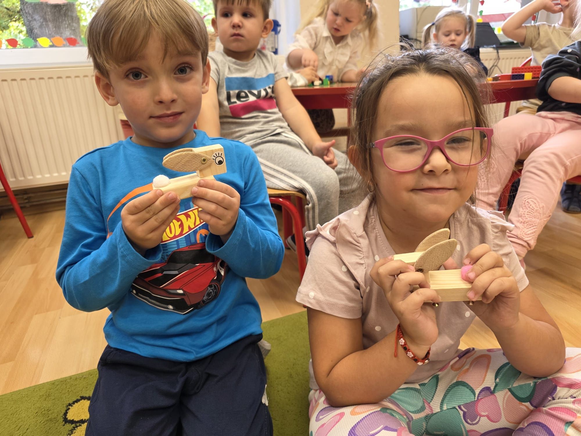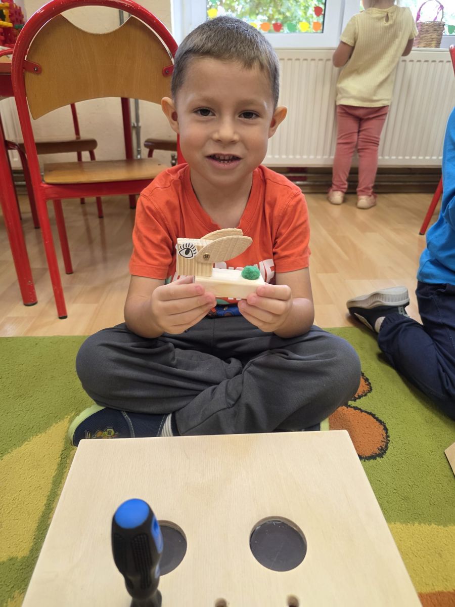 Mali majsterkowicze z ogromnym zaangażowaniem malowali, skręcali i ozdabiali swoje prace, wykorzystując drewienka, śrubki, podkładki, nakrętki i śrubokręty. Efekty ich pracy były naprawdę zachwycające!