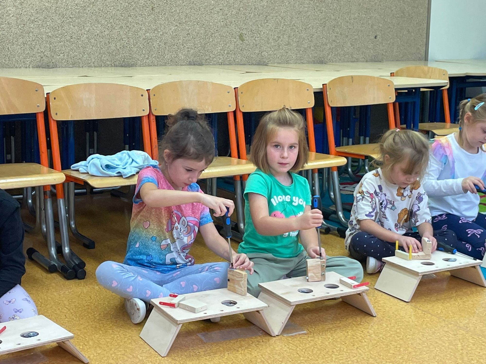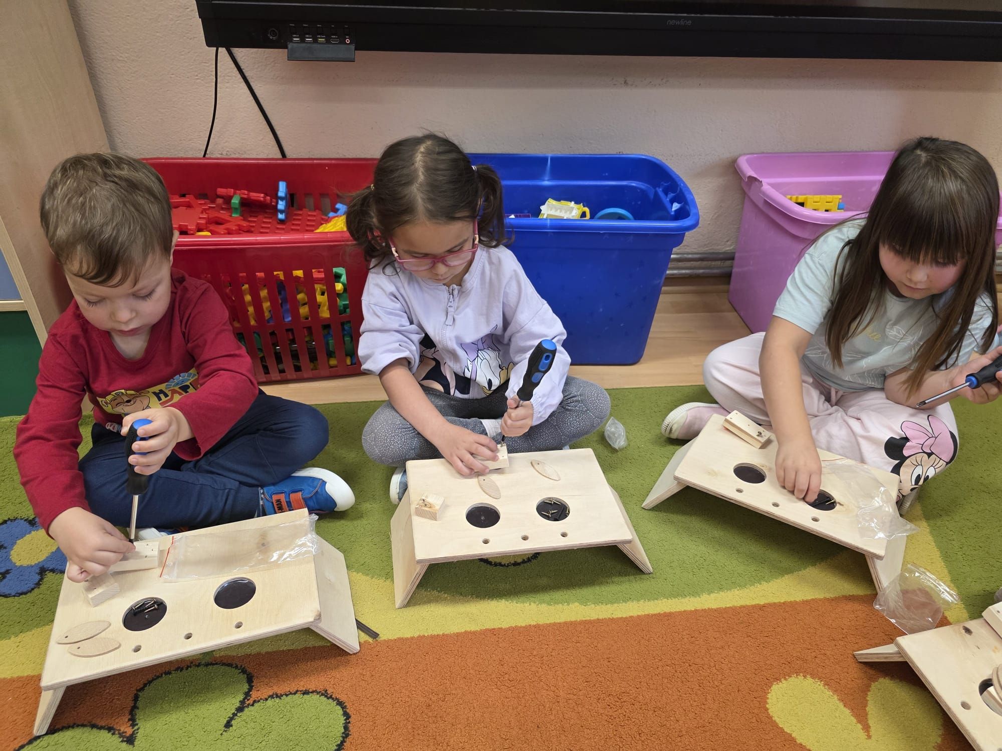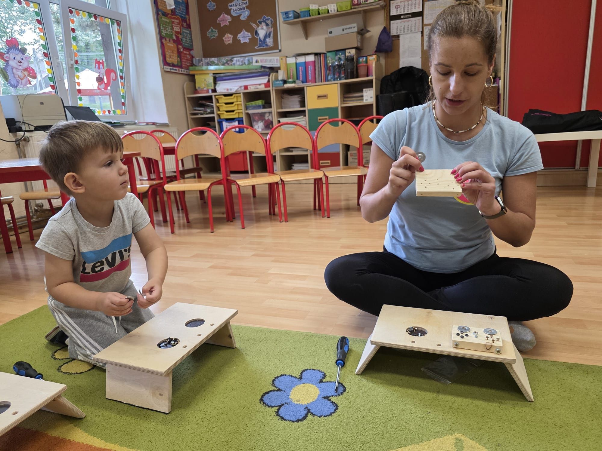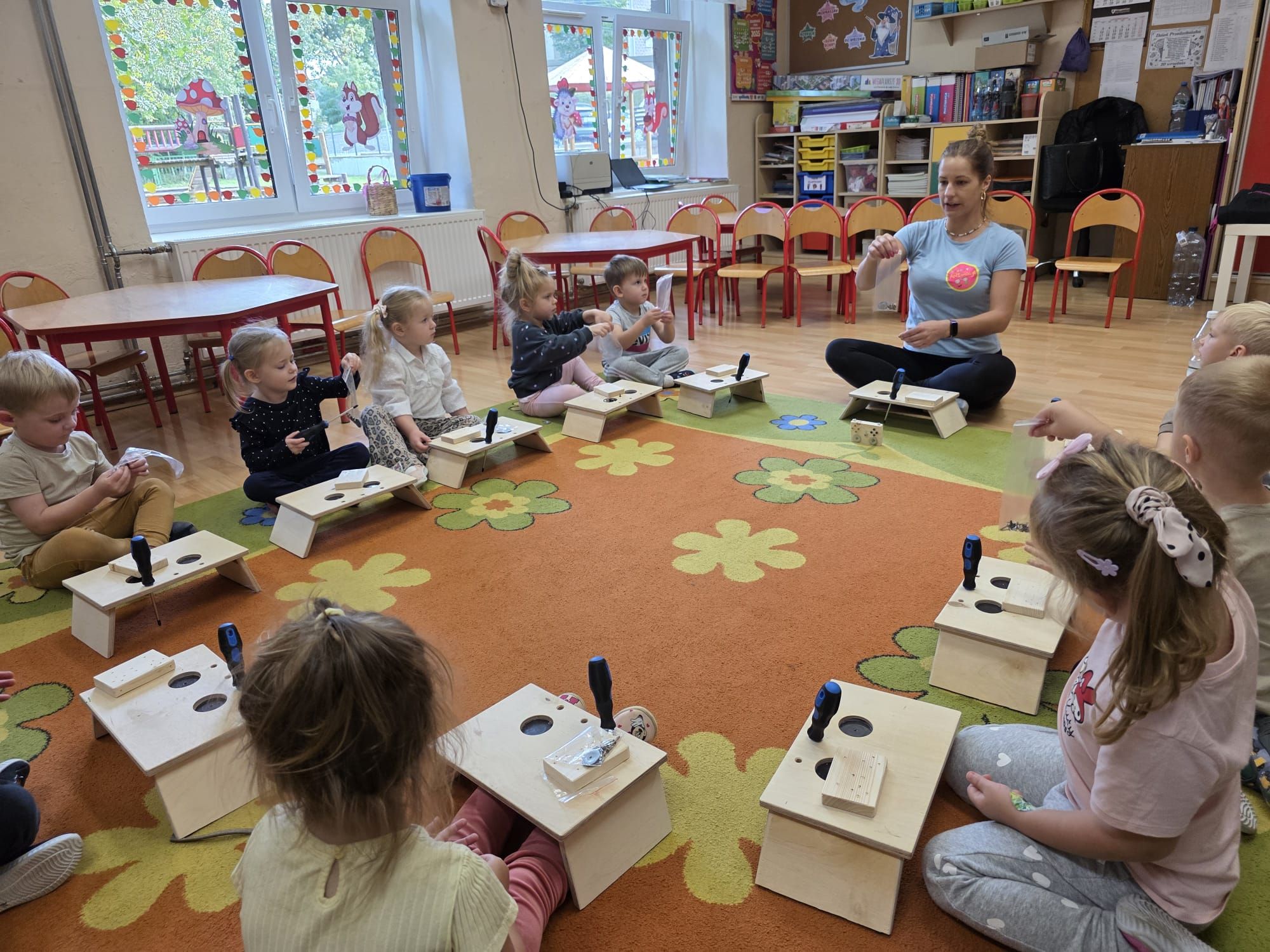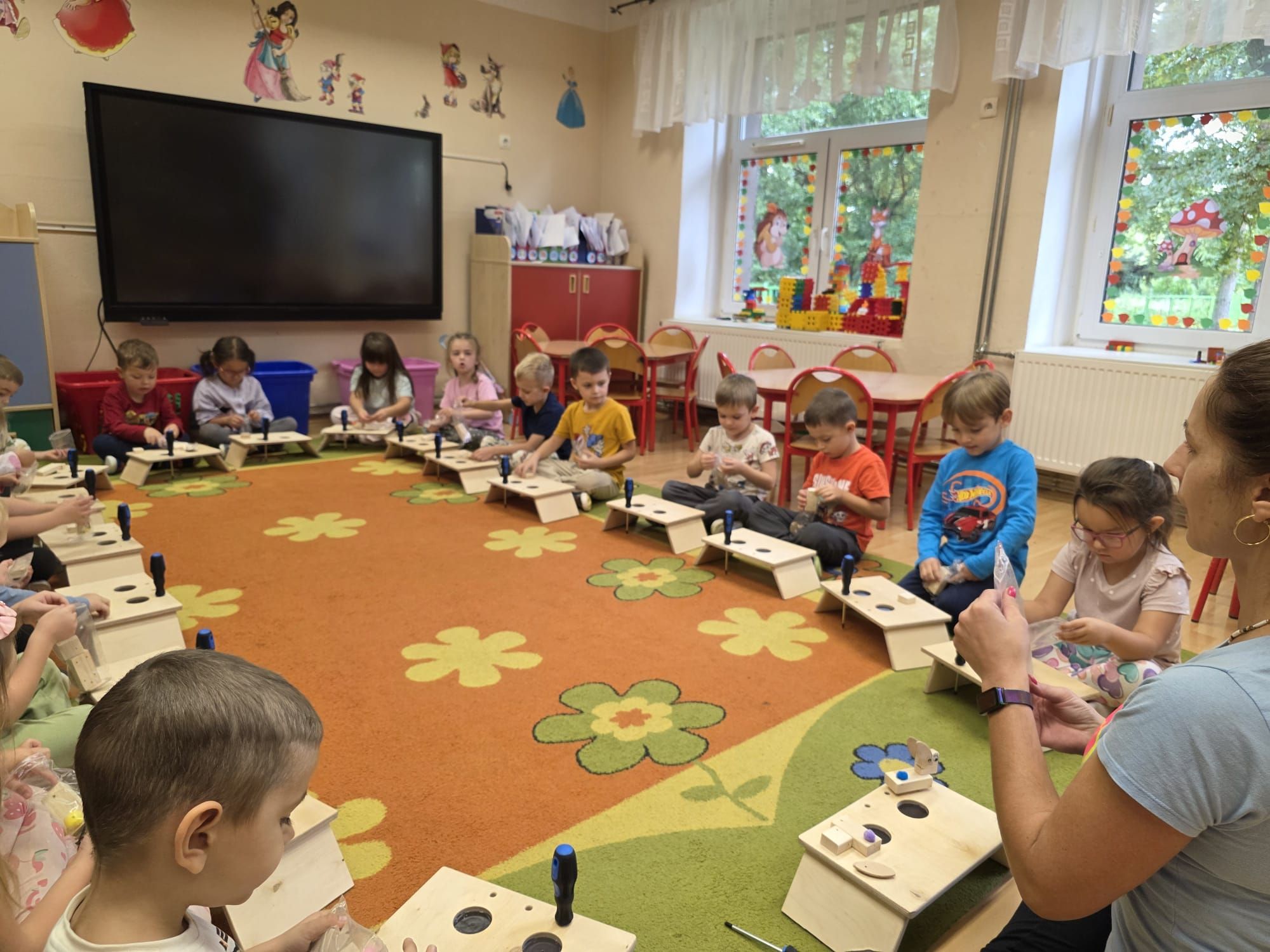 Mali majsterkowicze z ogromnym zaangażowaniem malowali, skręcali i ozdabiali swoje prace, wykorzystując drewienka, śrubki, podkładki, nakrętki i śrubokręty. Efekty ich pracy były naprawdę zachwycające!