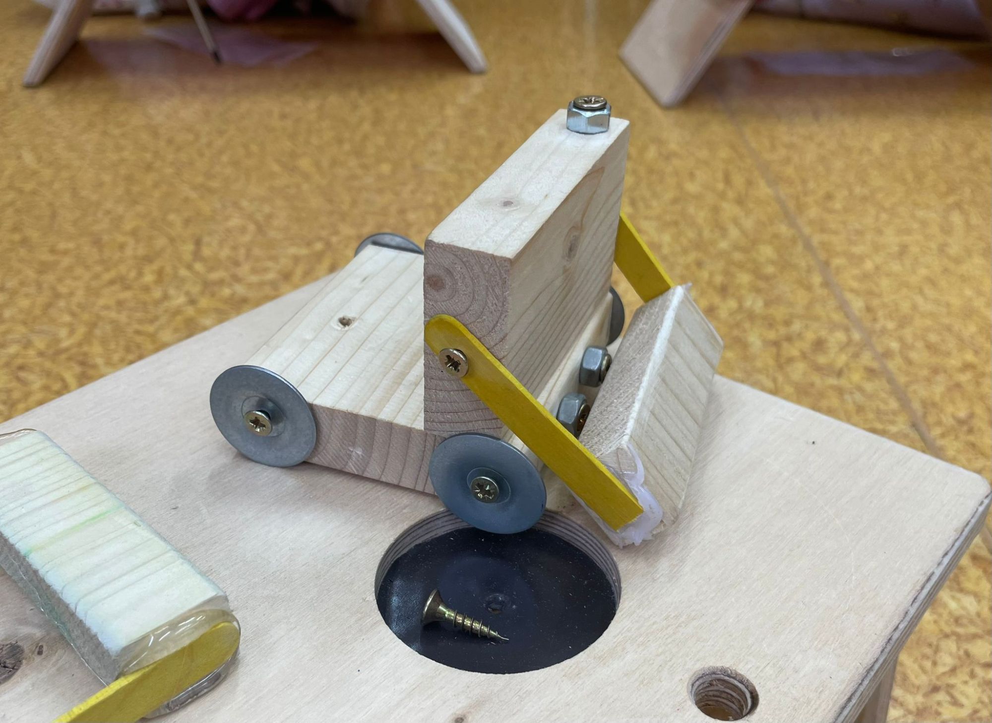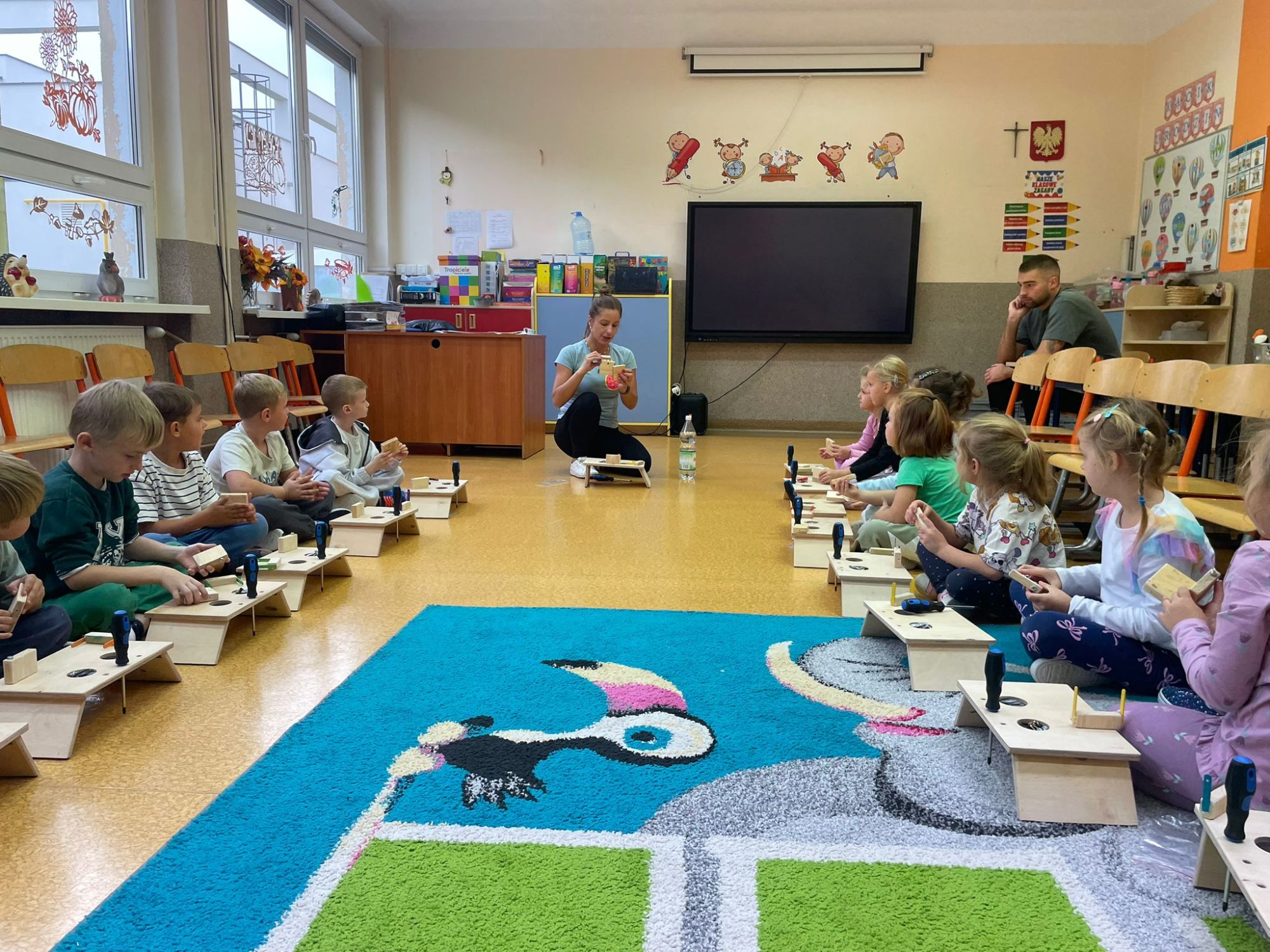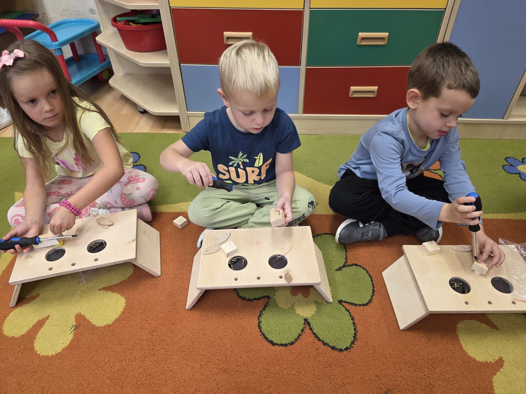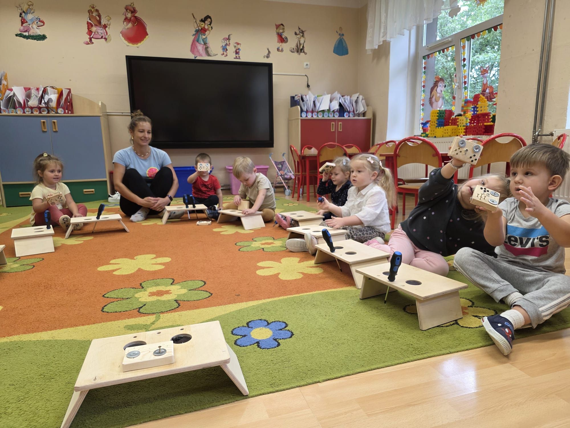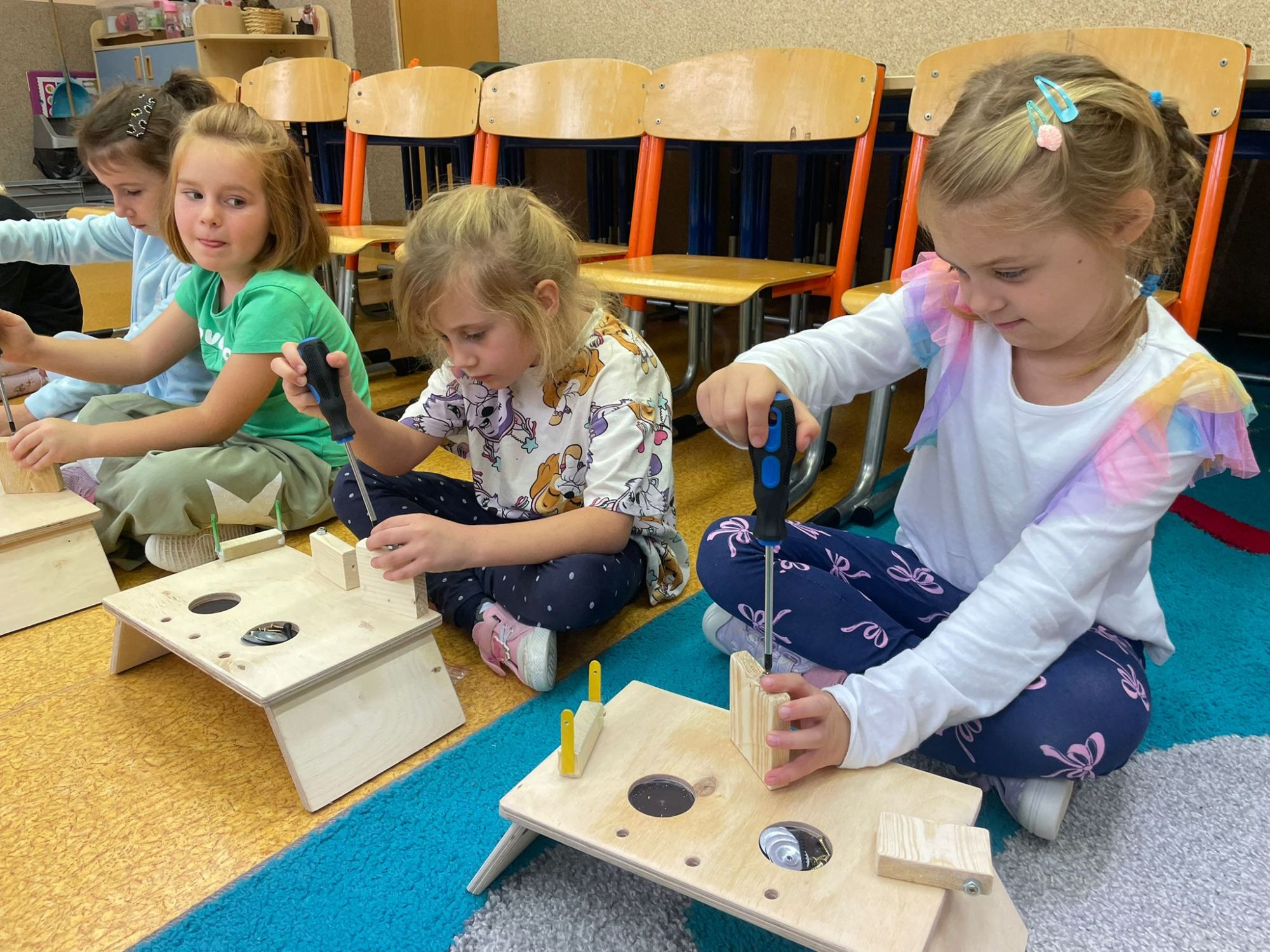 Mali majsterkowicze z ogromnym zaangażowaniem malowali, skręcali i ozdabiali swoje prace, wykorzystując drewienka, śrubki, podkładki, nakrętki i śrubokręty. Efekty ich pracy były naprawdę zachwycające!