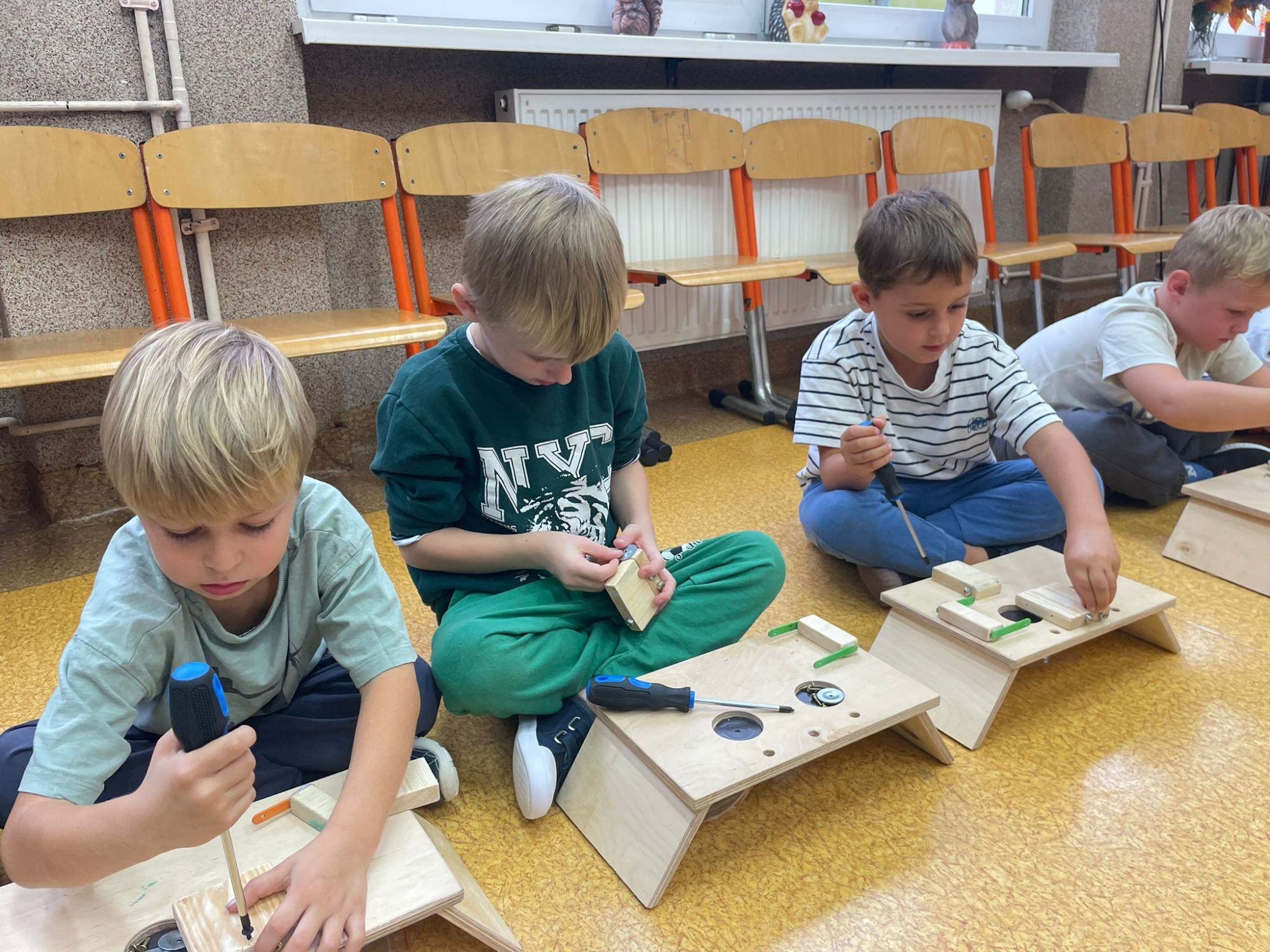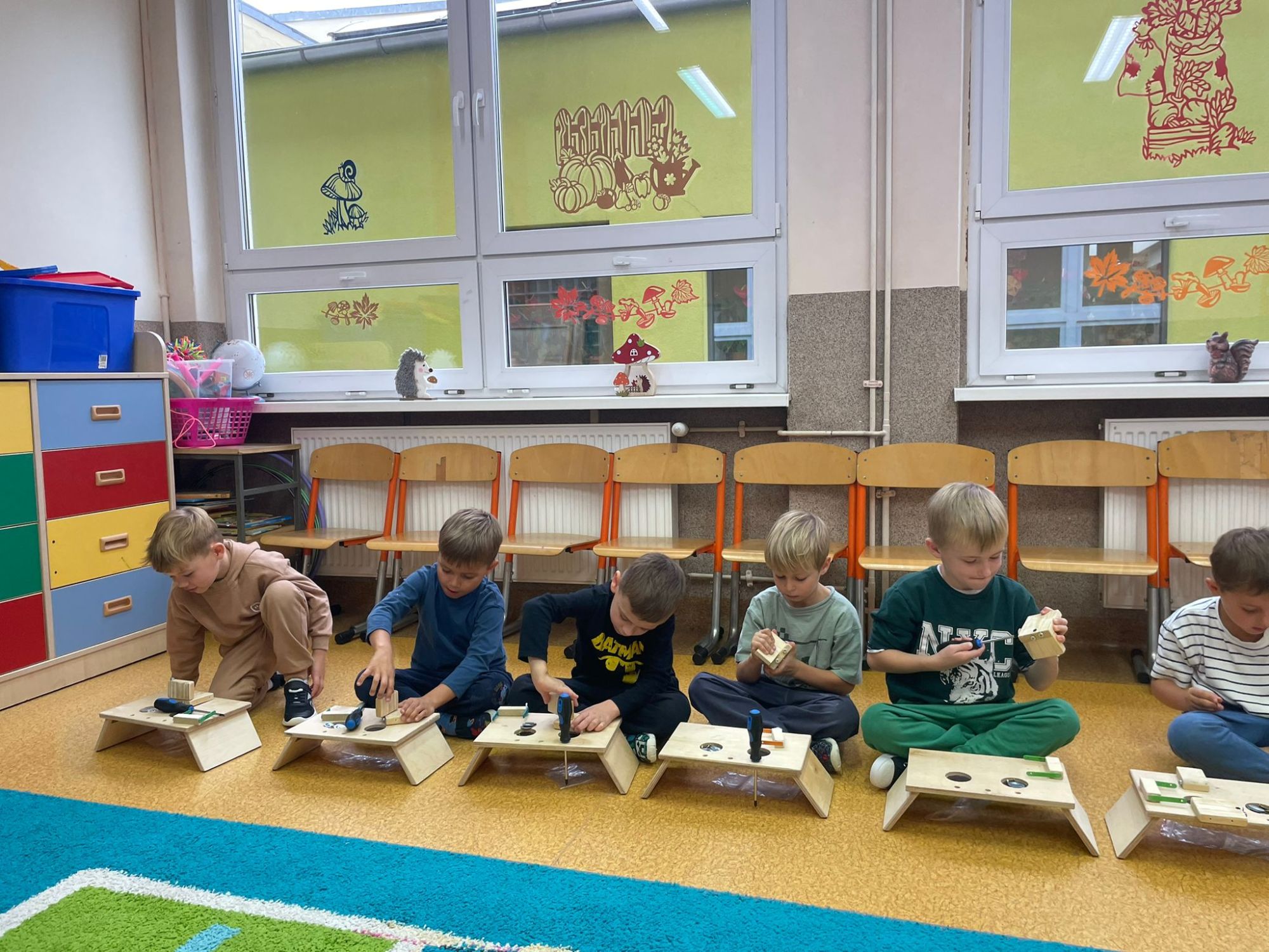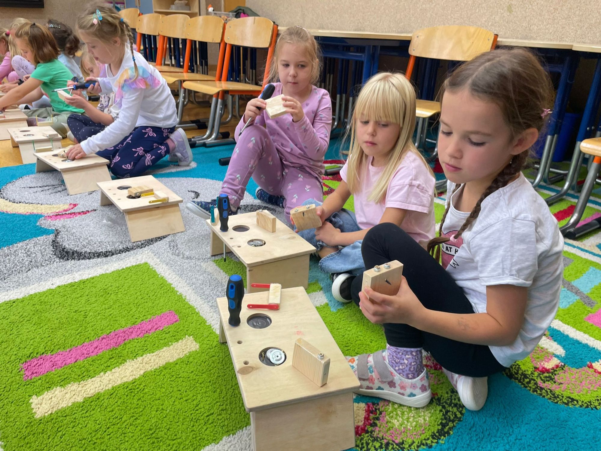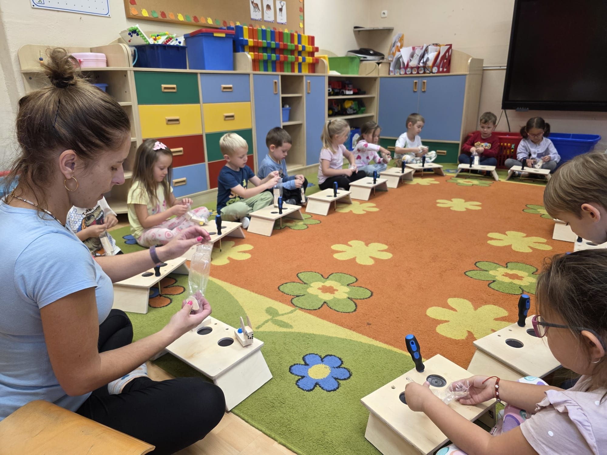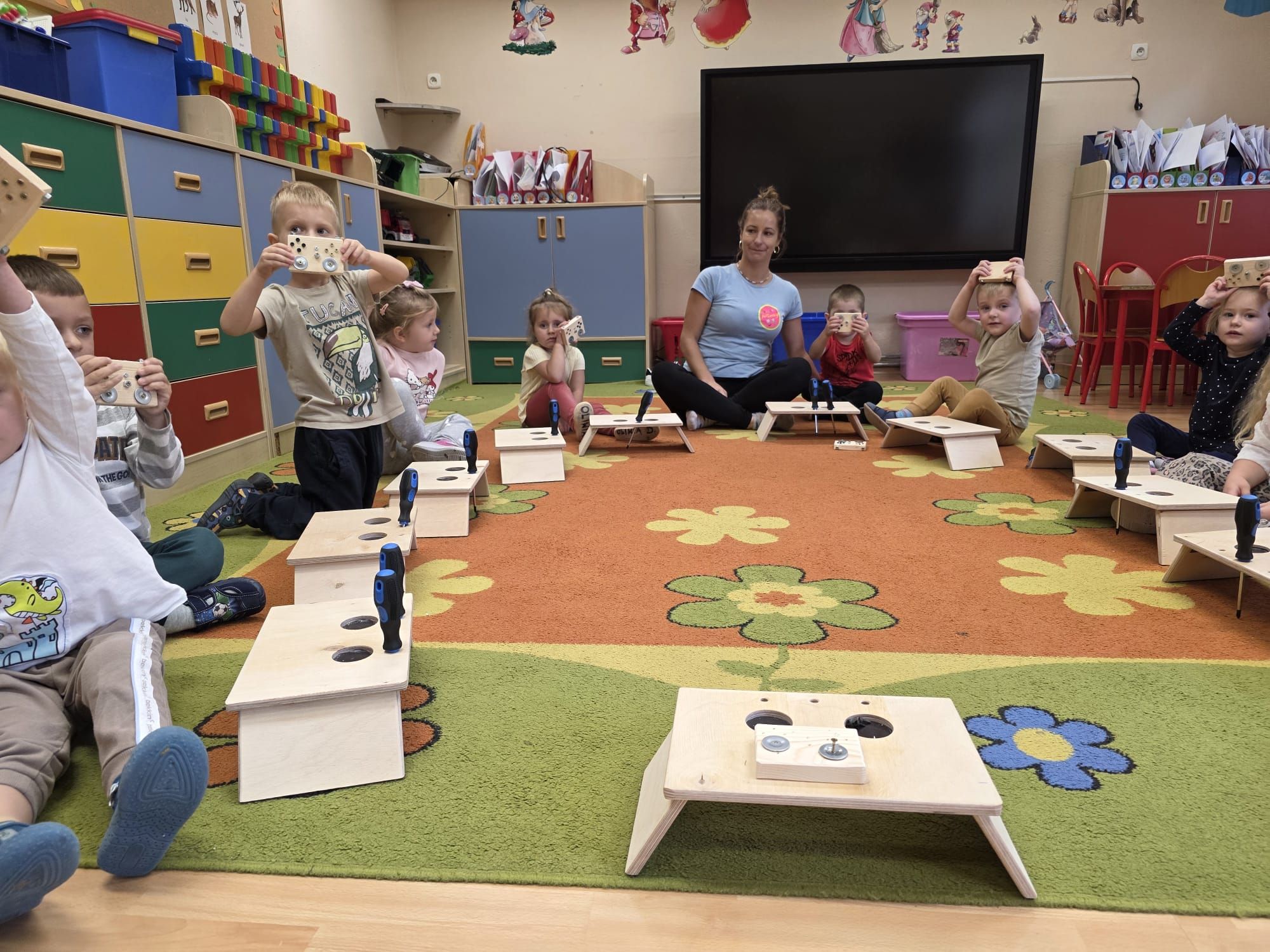 Mali majsterkowicze z ogromnym zaangażowaniem malowali, skręcali i ozdabiali swoje prace, wykorzystując drewienka, śrubki, podkładki, nakrętki i śrubokręty. Efekty ich pracy były naprawdę zachwycające!