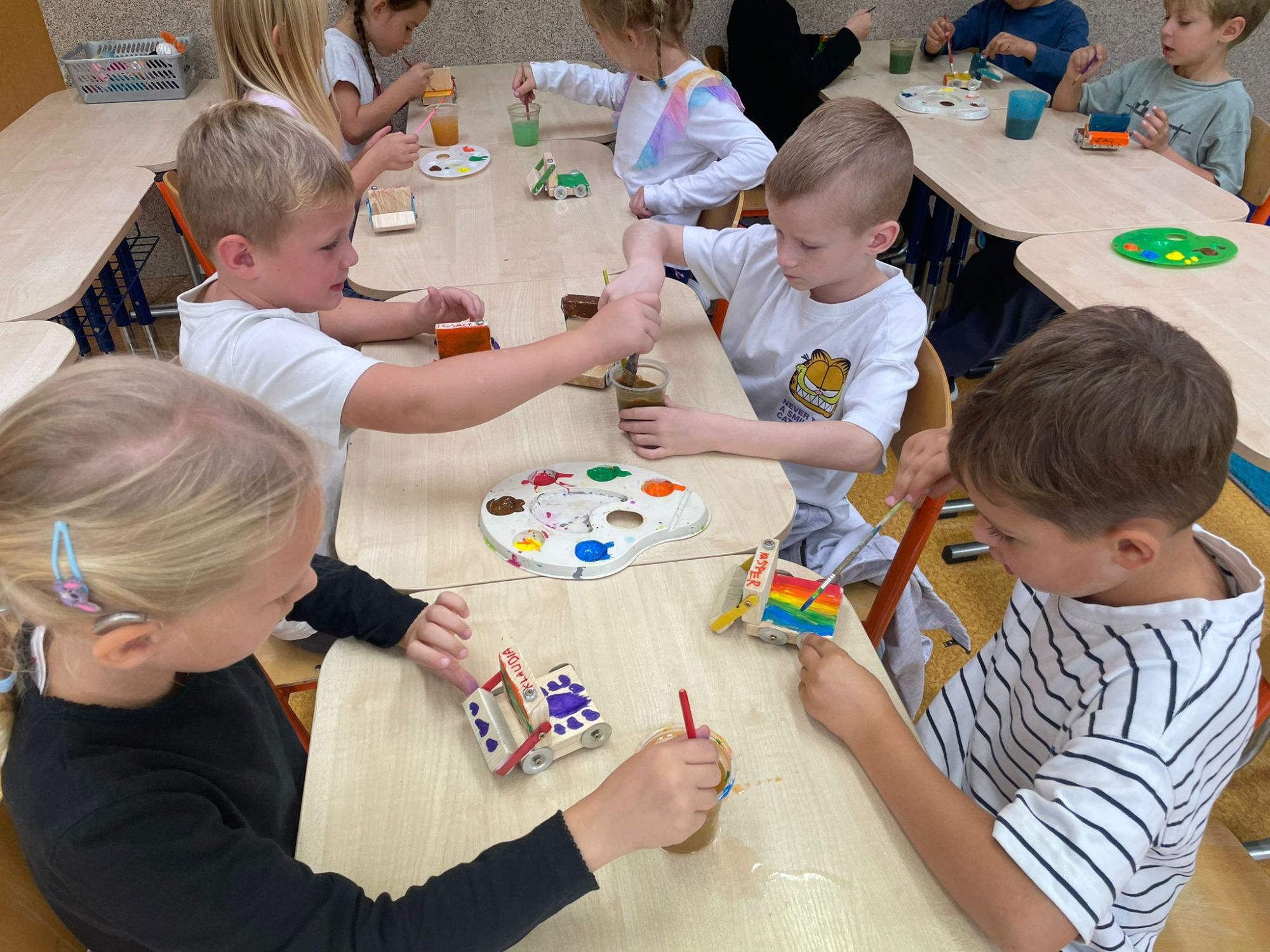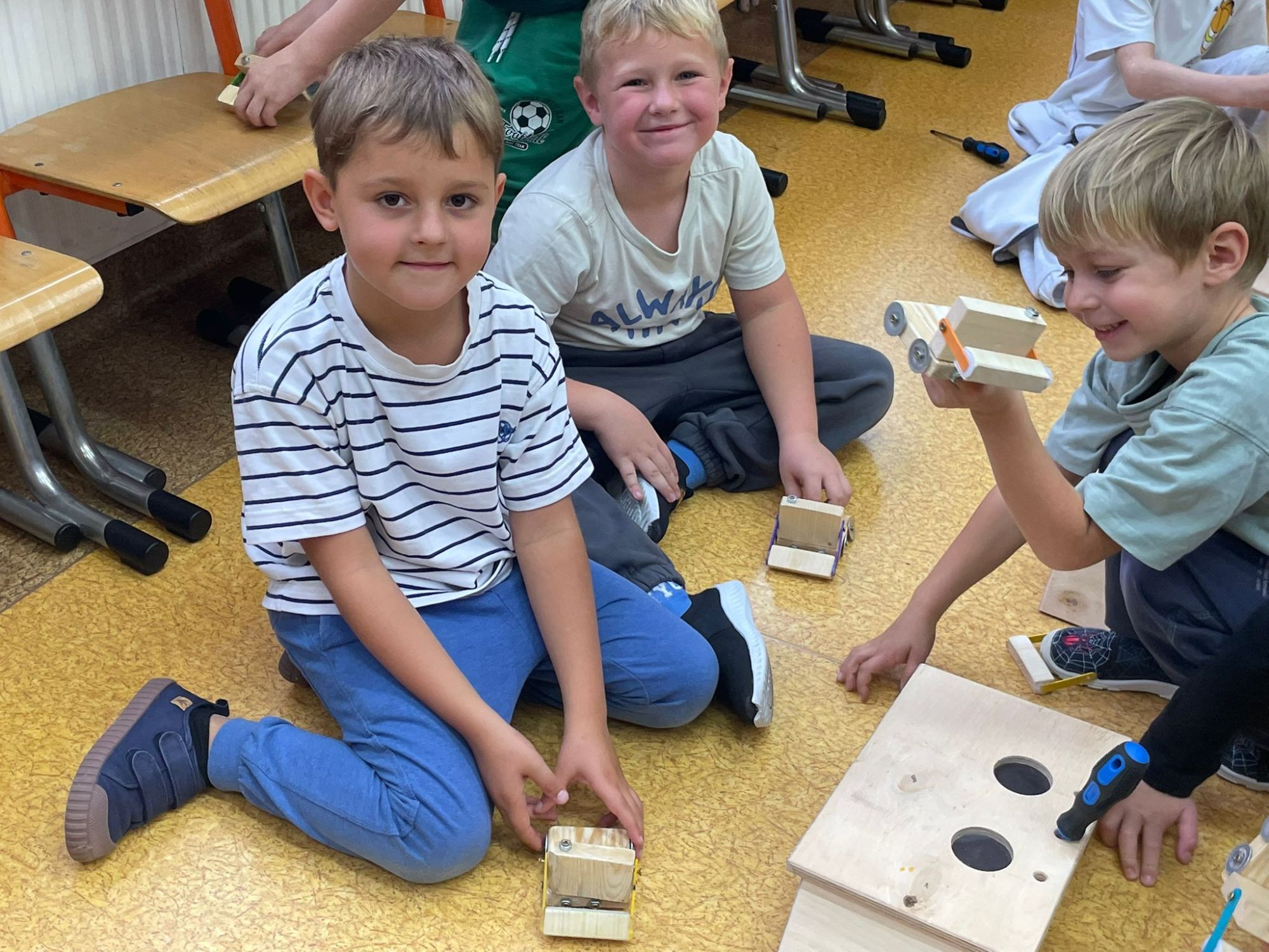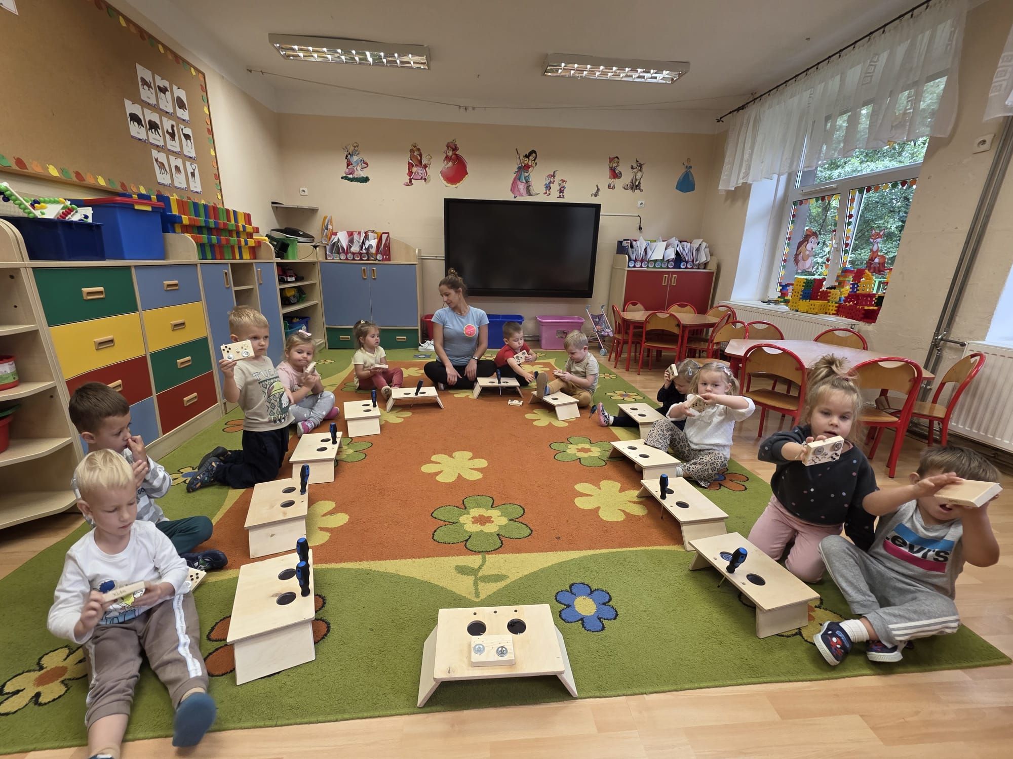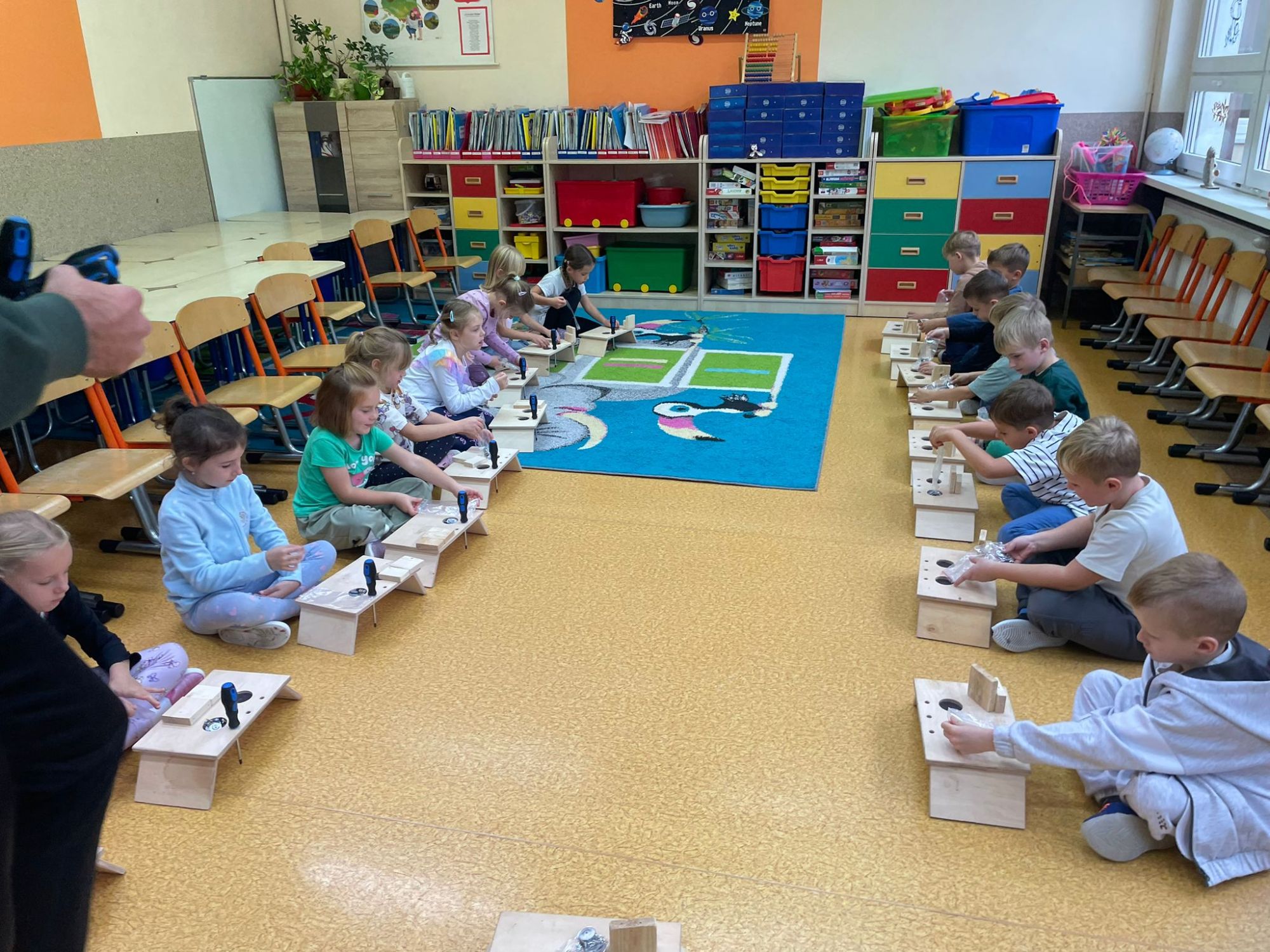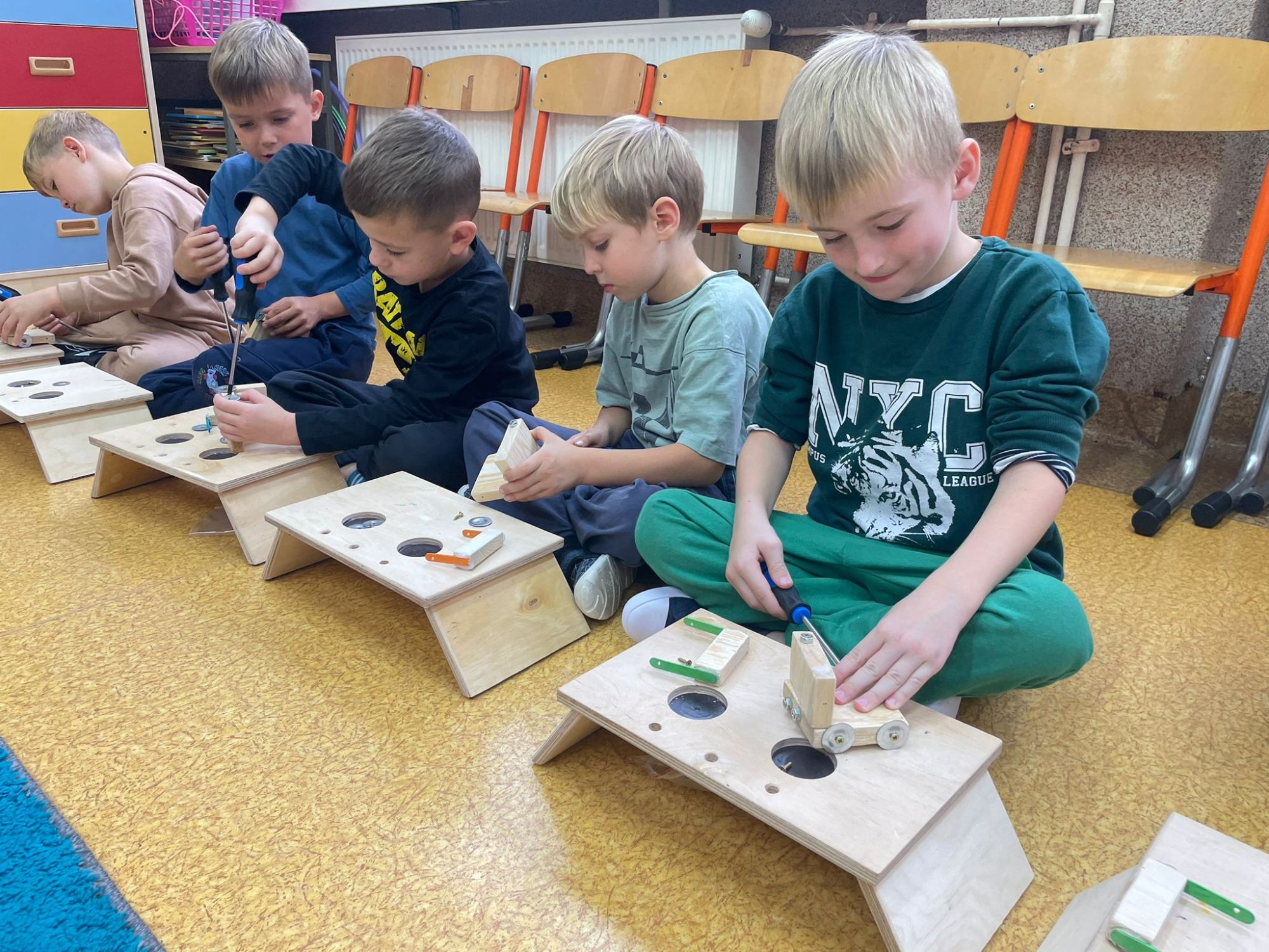 Podczas warsztatów majsterkowicza dzieci miały okazję stworzyć własne drewniane samochodziki, zajączki oraz pady do gier