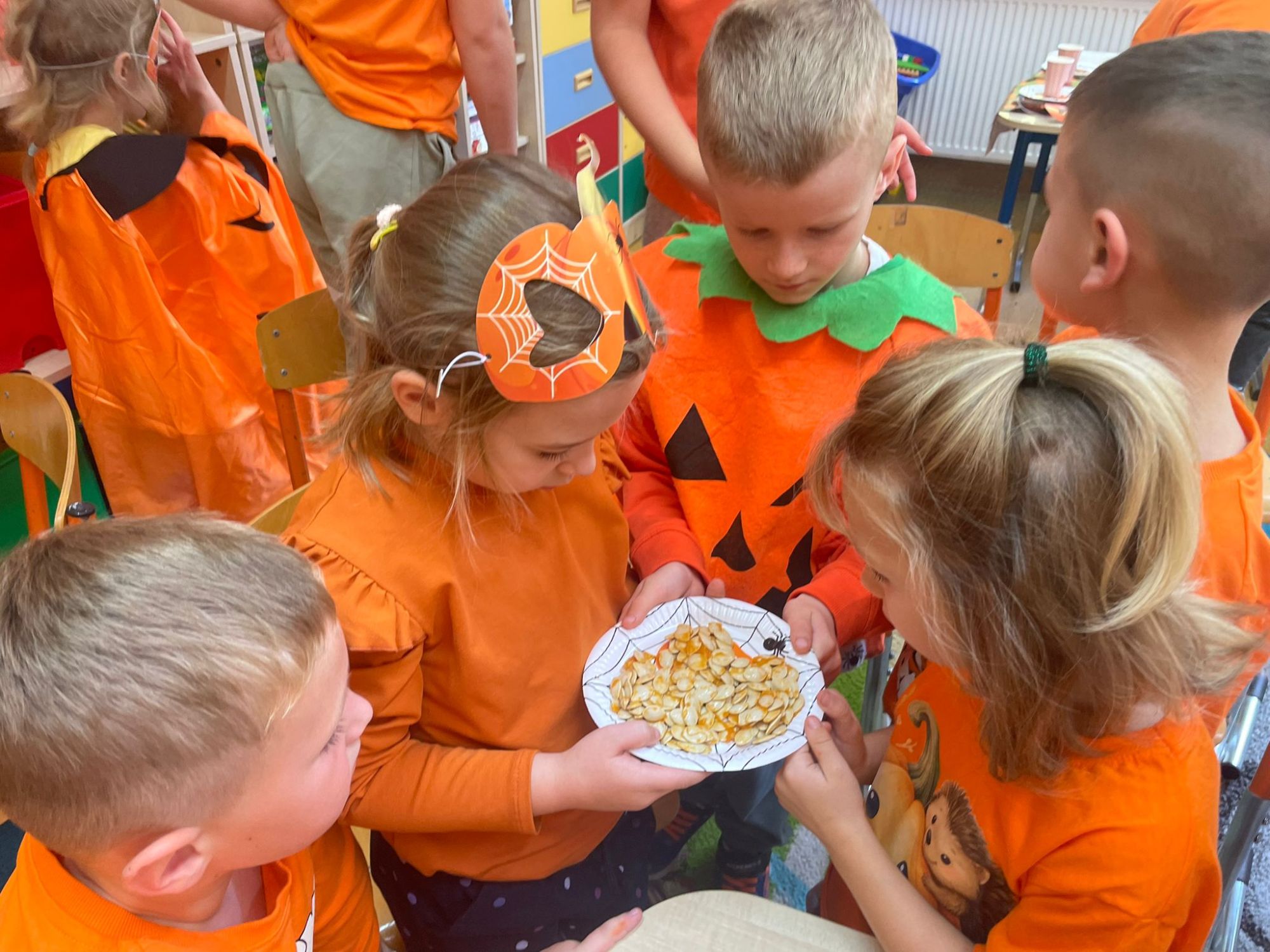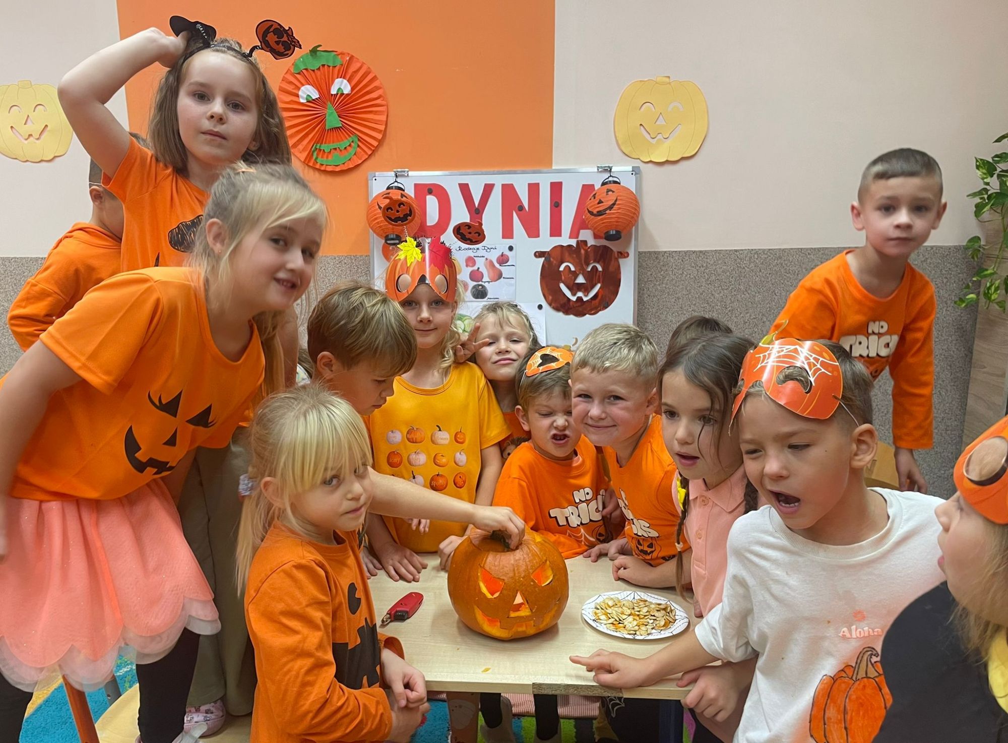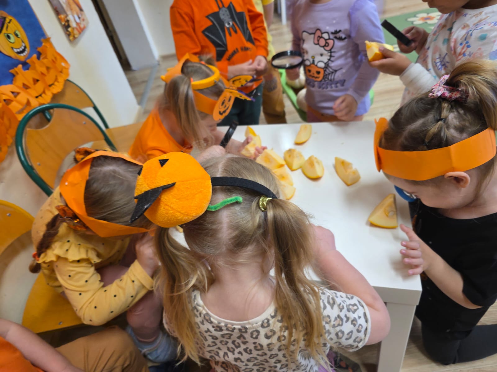 Było pomarańczowo, radośnie i bardzo ciekawie! Dzieci przyszły ubrane na pomarańczowo i przyniosły ze sobą swoje dynie. Zaglądały do ich wnętrza, oglądały ziarenka przez lupy i z zaciekawieniem poznawały tajemnice tego niezwykłego warzywa.
