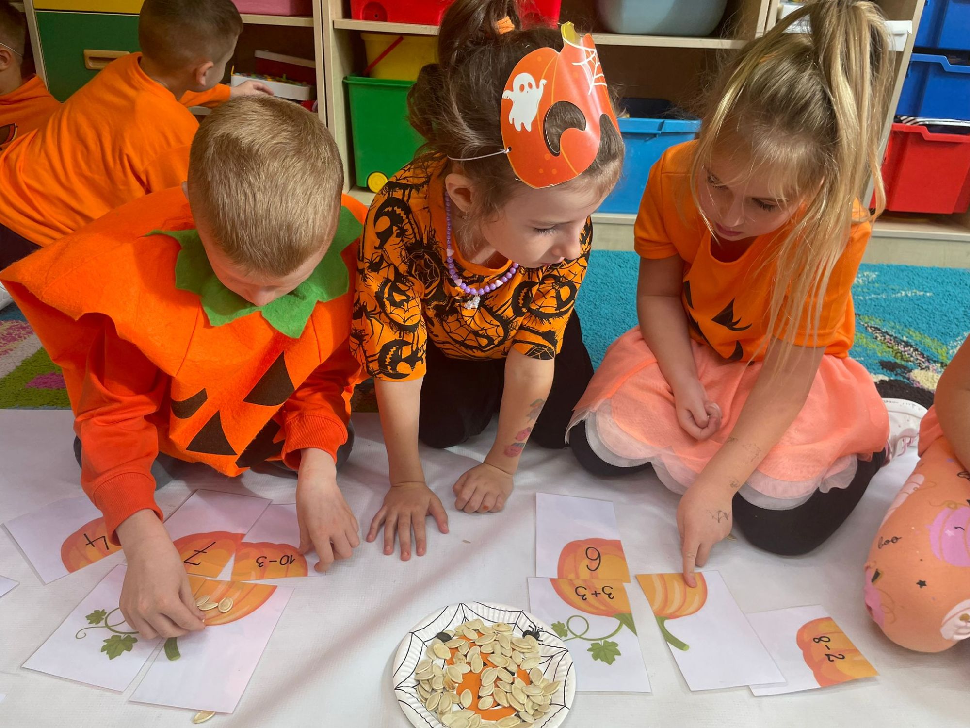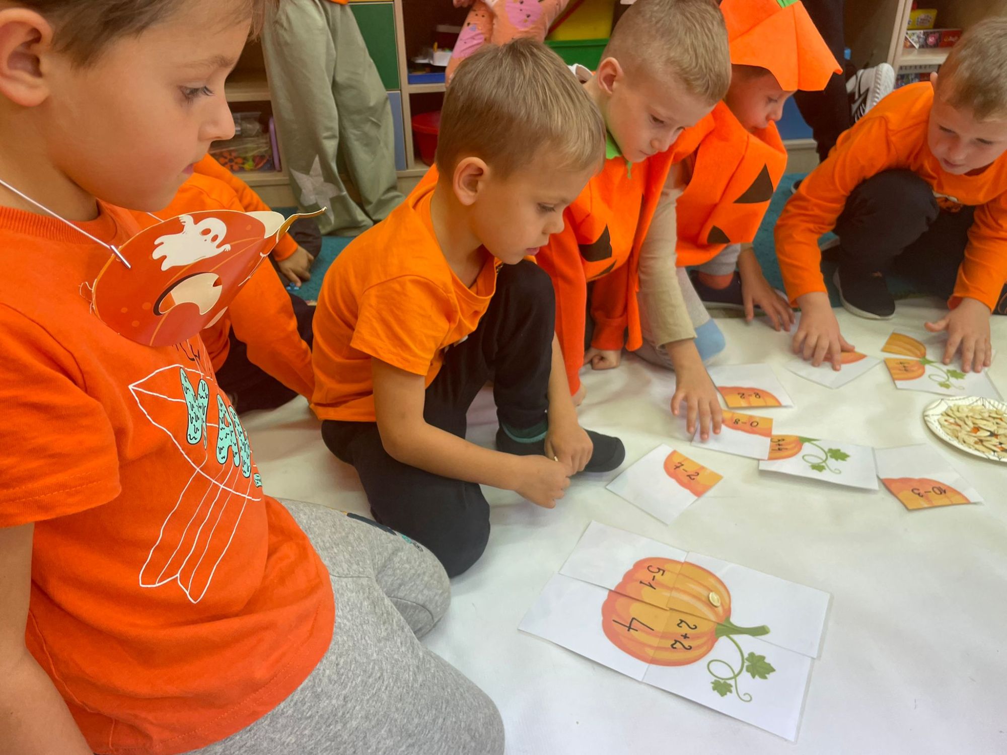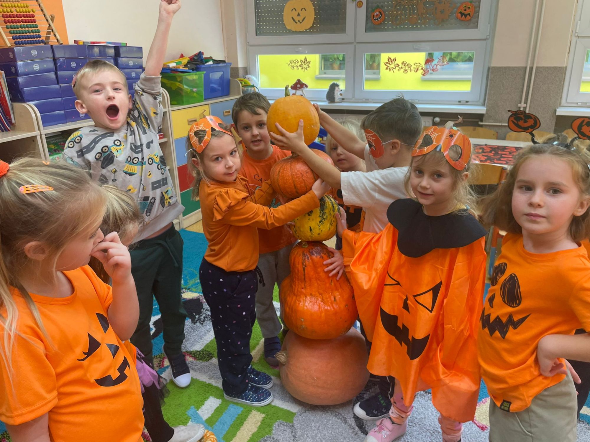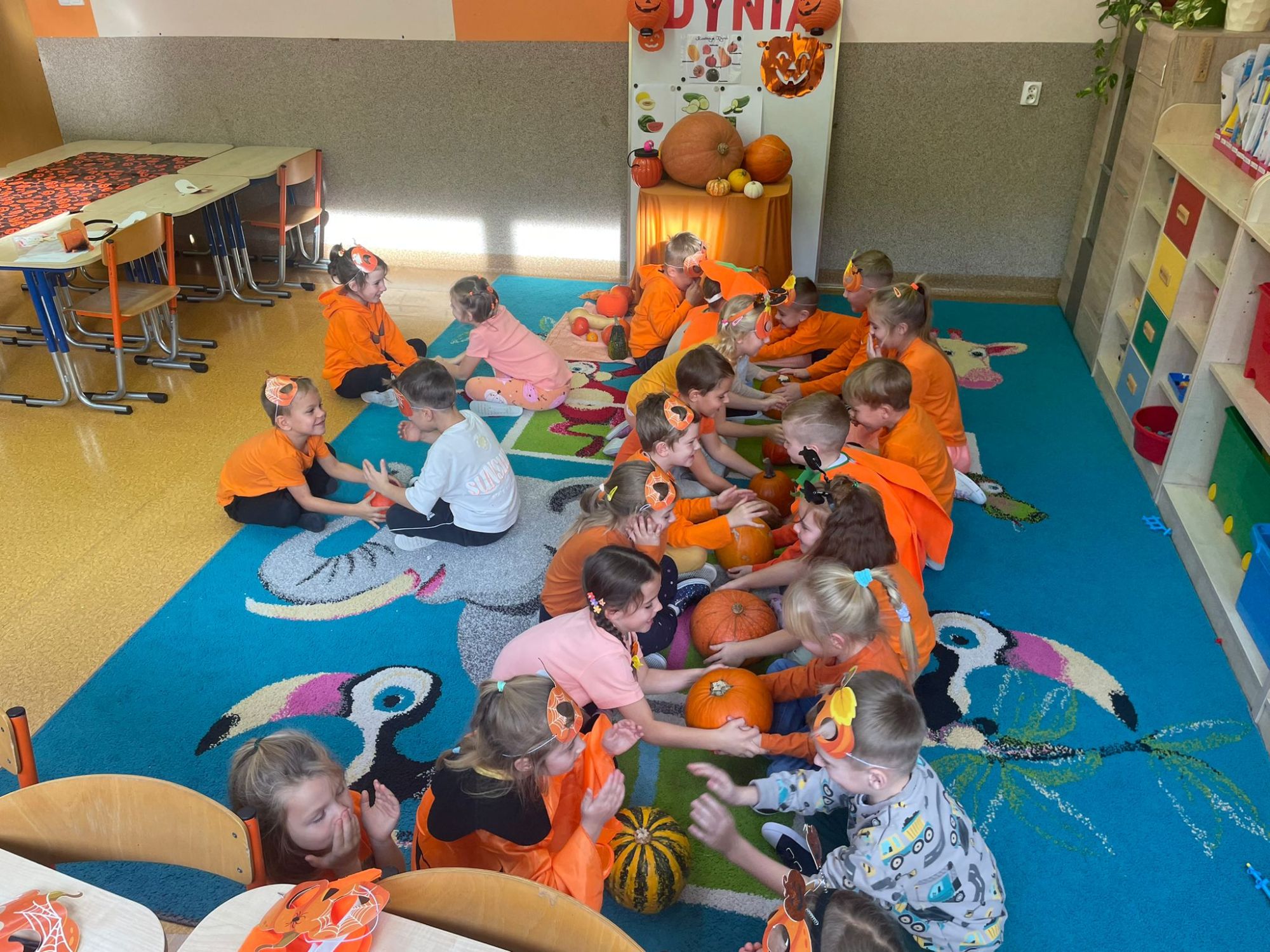Było pomarańczowo, radośnie i bardzo ciekawie! Dzieci przyszły ubrane na pomarańczowo i przyniosły ze sobą swoje dynie. Zaglądały do ich wnętrza, oglądały ziarenka przez lupy i z zaciekawieniem poznawały tajemnice tego niezwykłego warzywa.