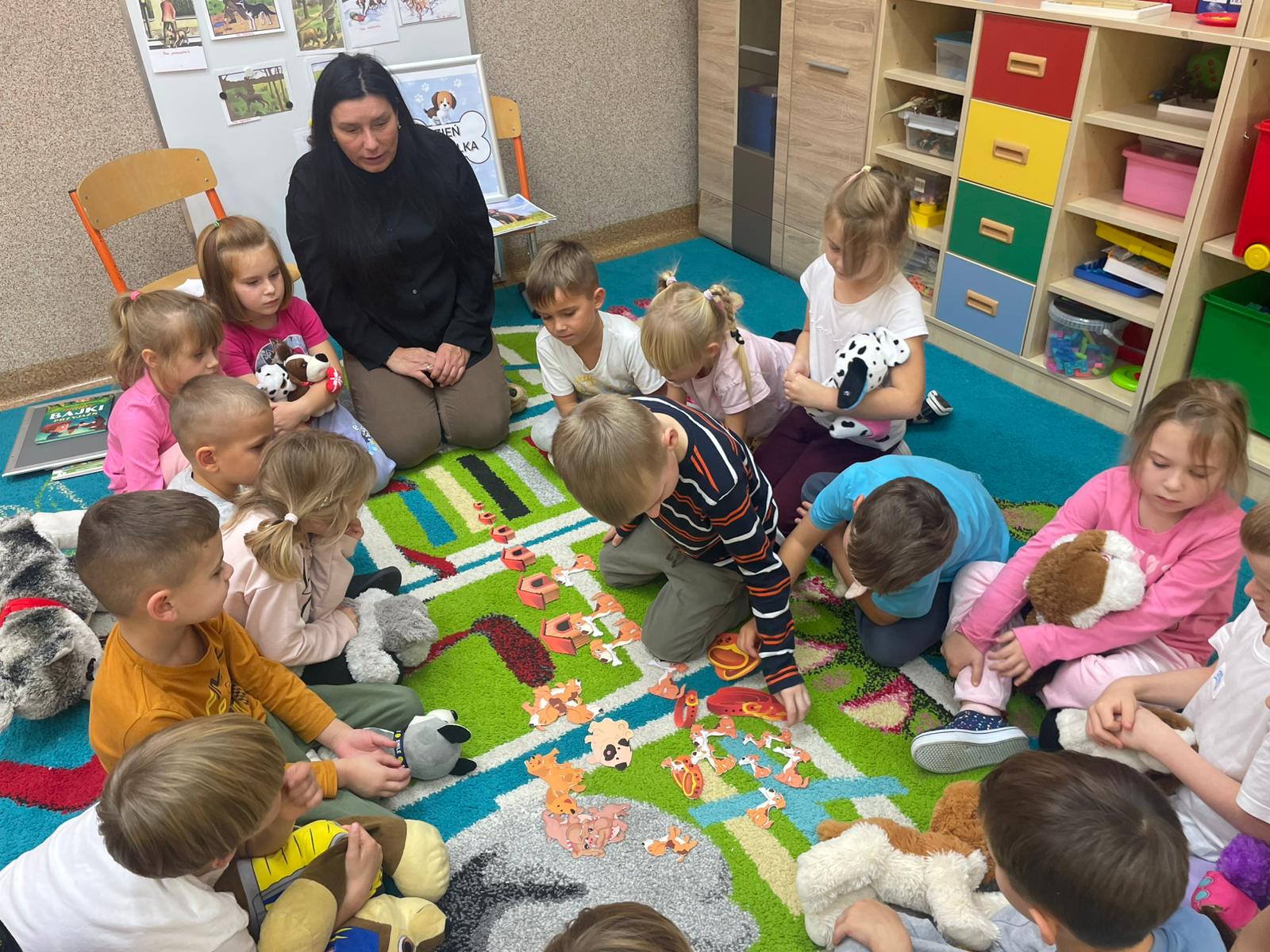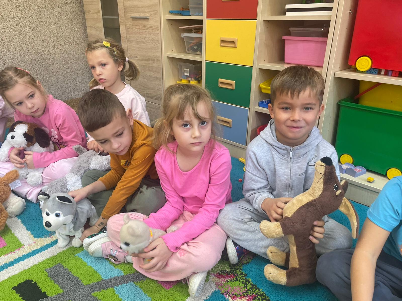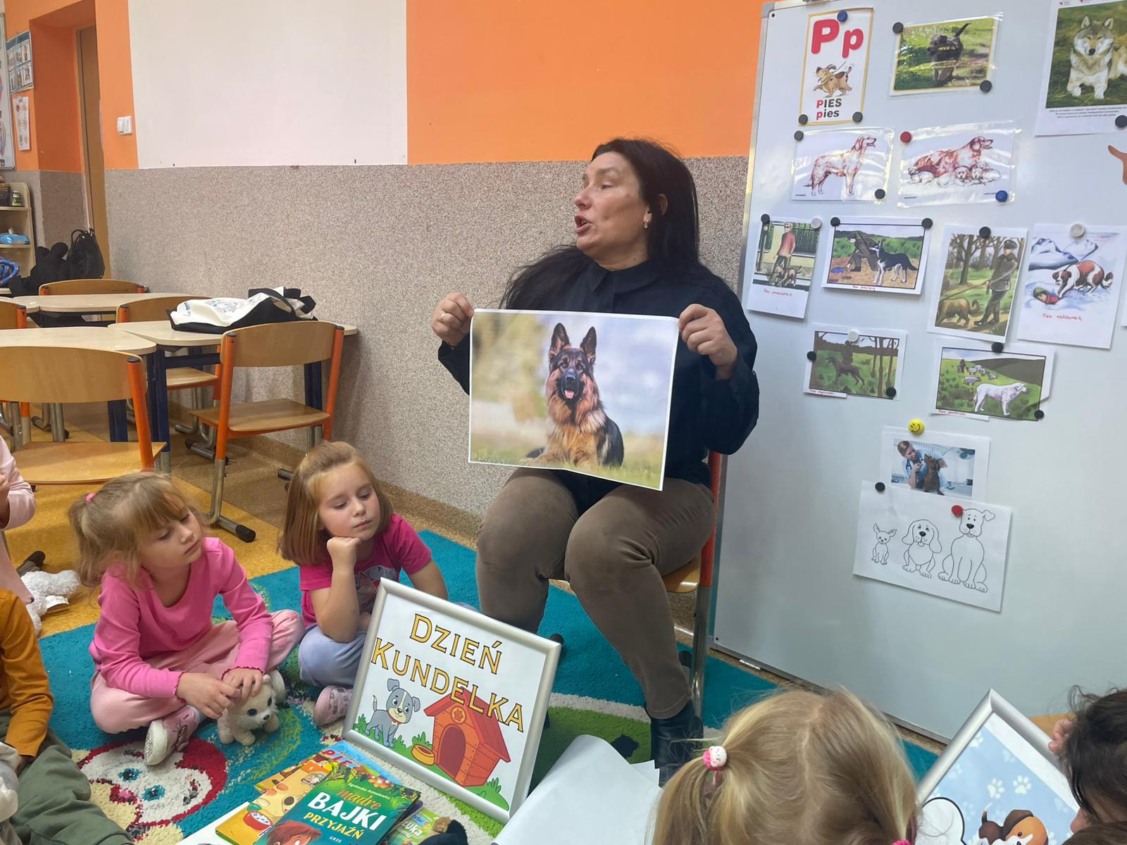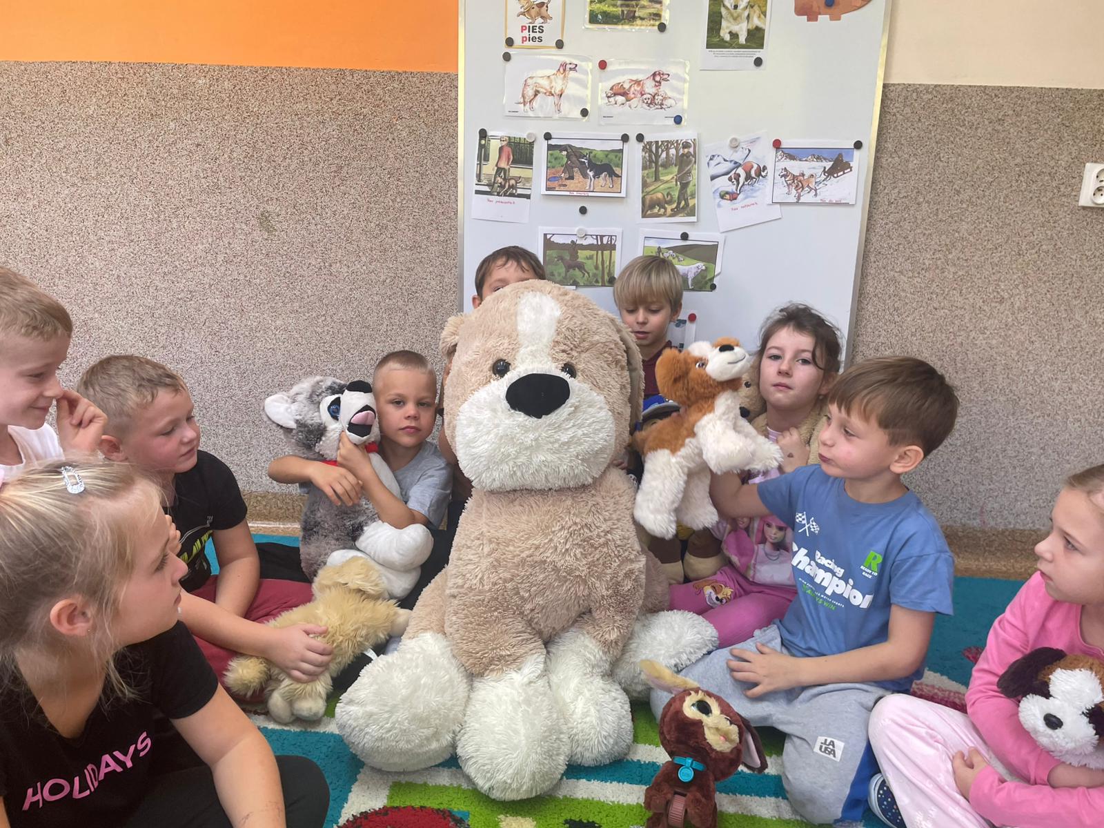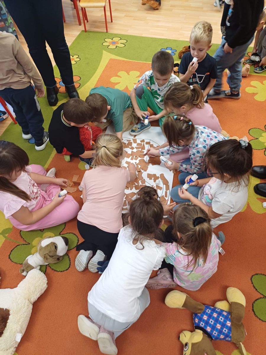 Kultury w Skoroszycach – pani Marta i pani Justynka.Dzieci dowiedziały się wielu ciekawych rzeczy o pieskach – jak o nie dbać, troszczyć się i opiekować nimi. Wysłuchały bajeczki o szczeniaczku, a następnie wspólnie wykonały pieska – pracę plastyczną