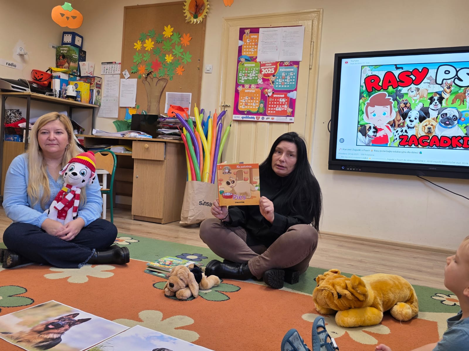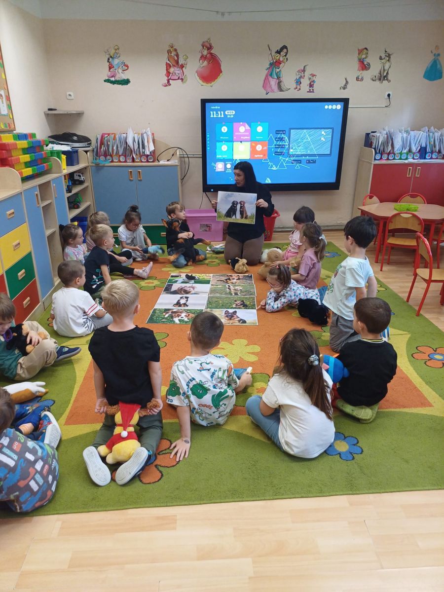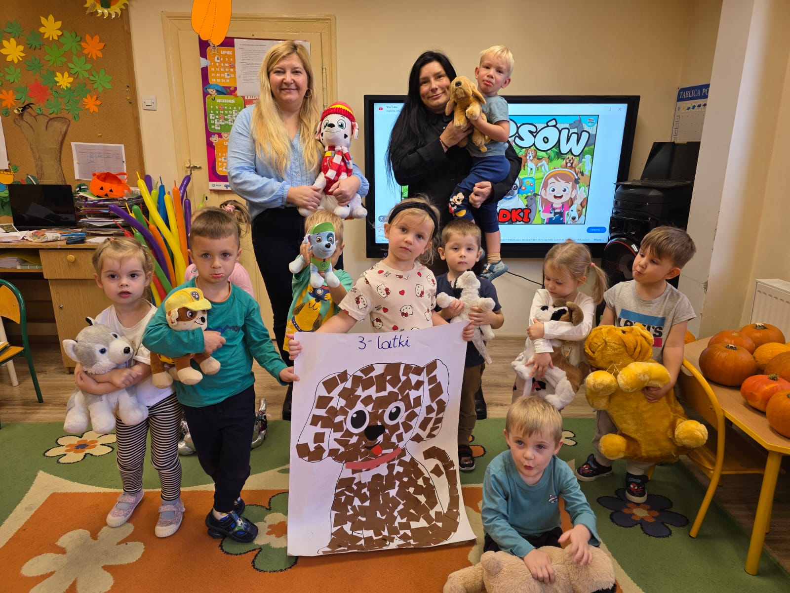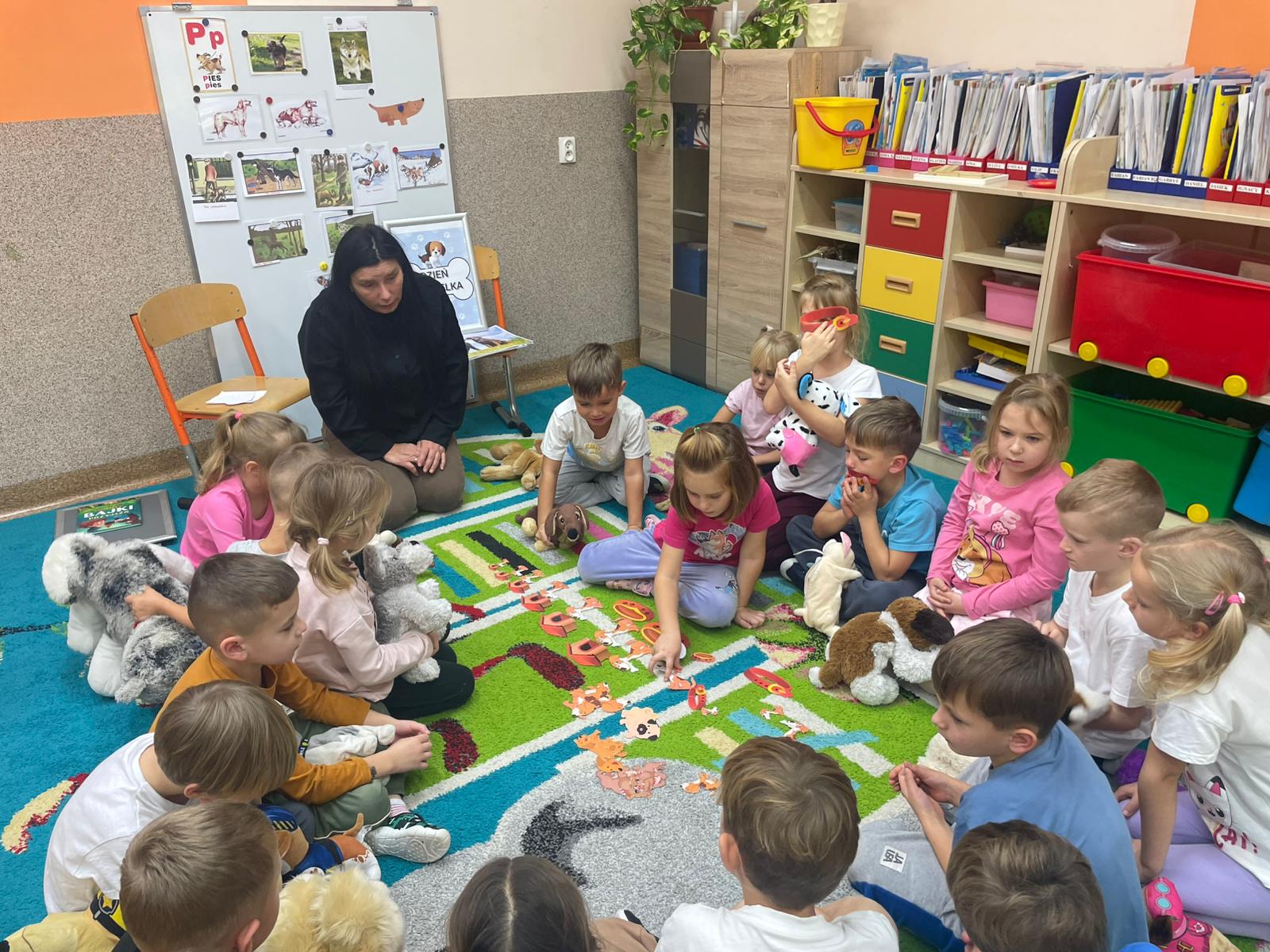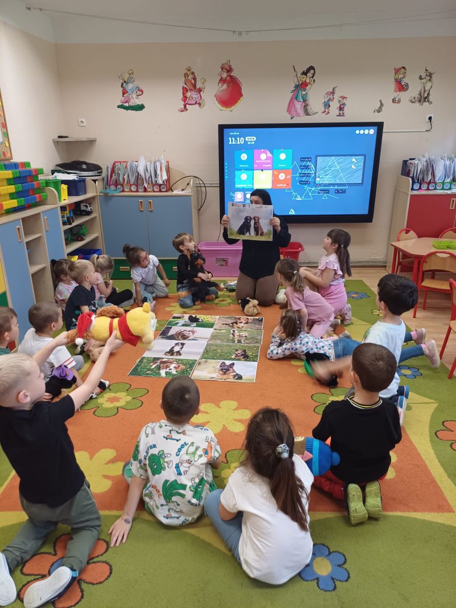 Kultury w Skoroszycach – pani Marta i pani Justynka.Dzieci dowiedziały się wielu ciekawych rzeczy o pieskach – jak o nie dbać, troszczyć się i opiekować nimi. Wysłuchały bajeczki o szczeniaczku, a następnie wspólnie wykonały pieska – pracę plastyczną