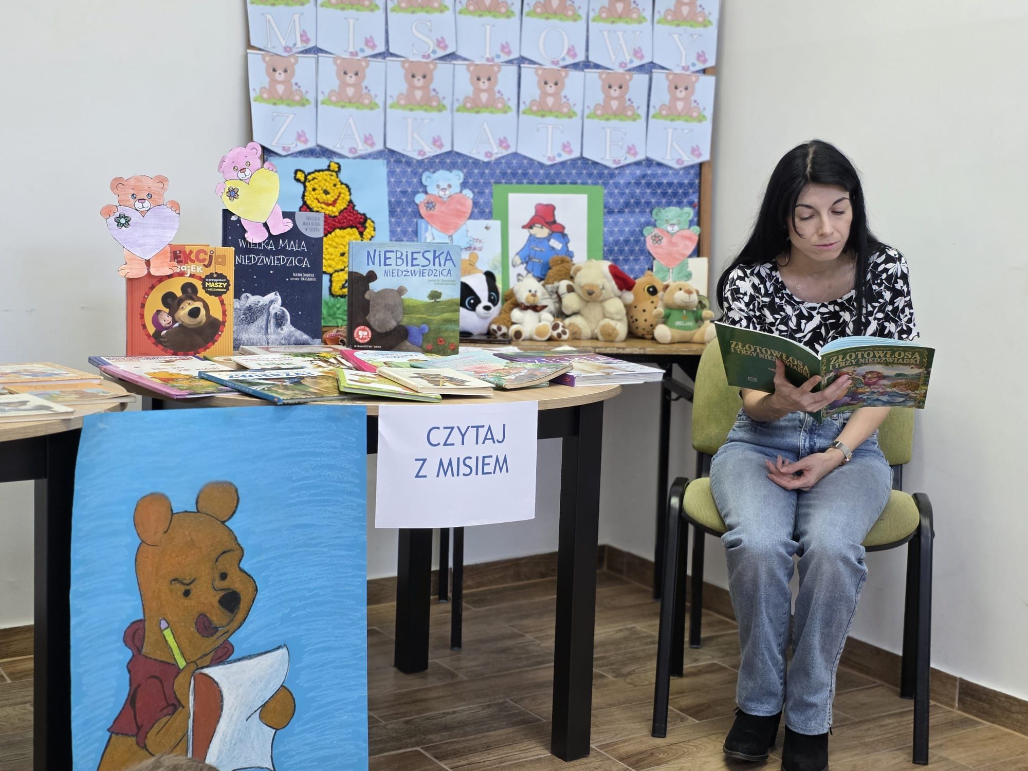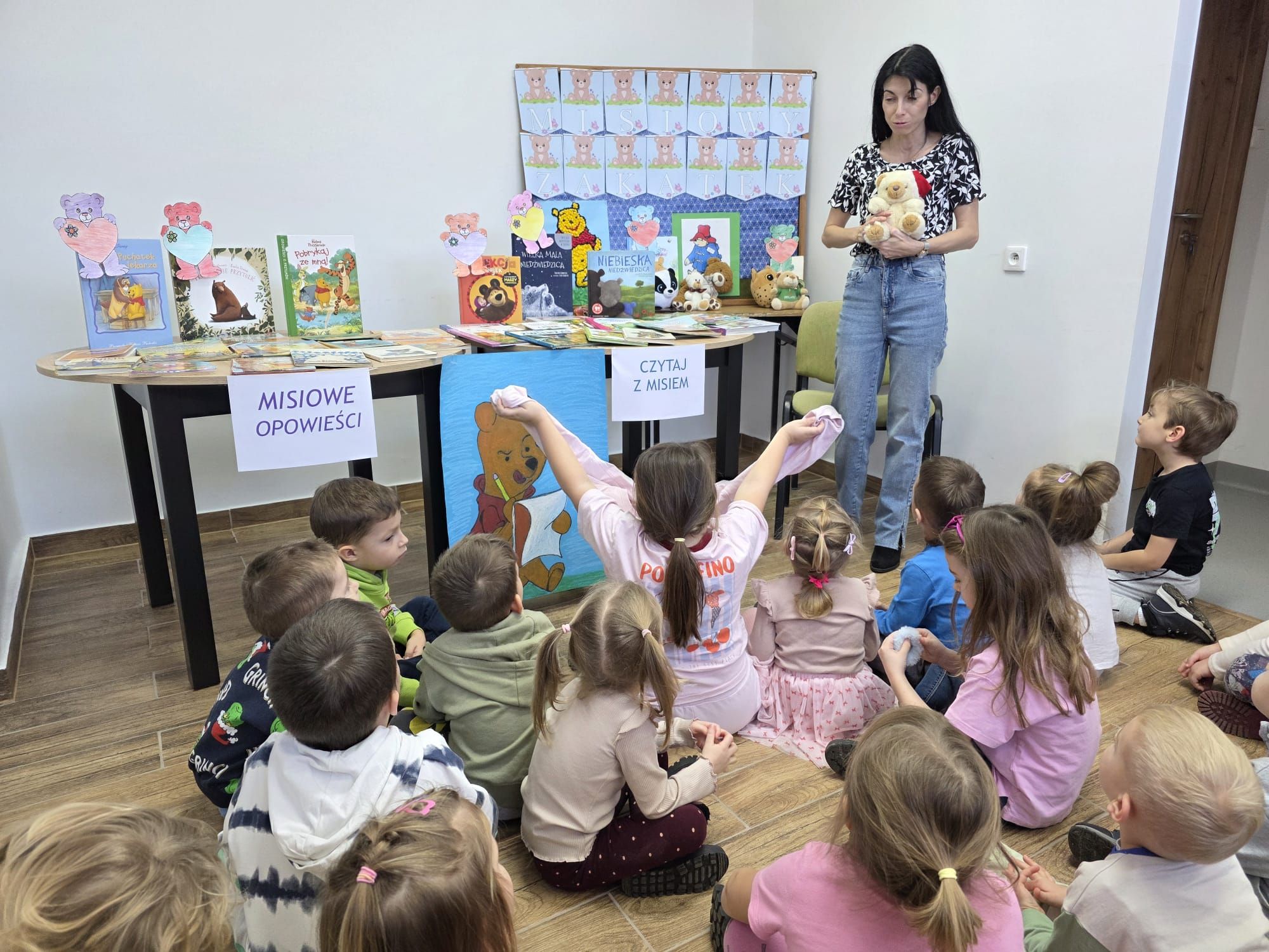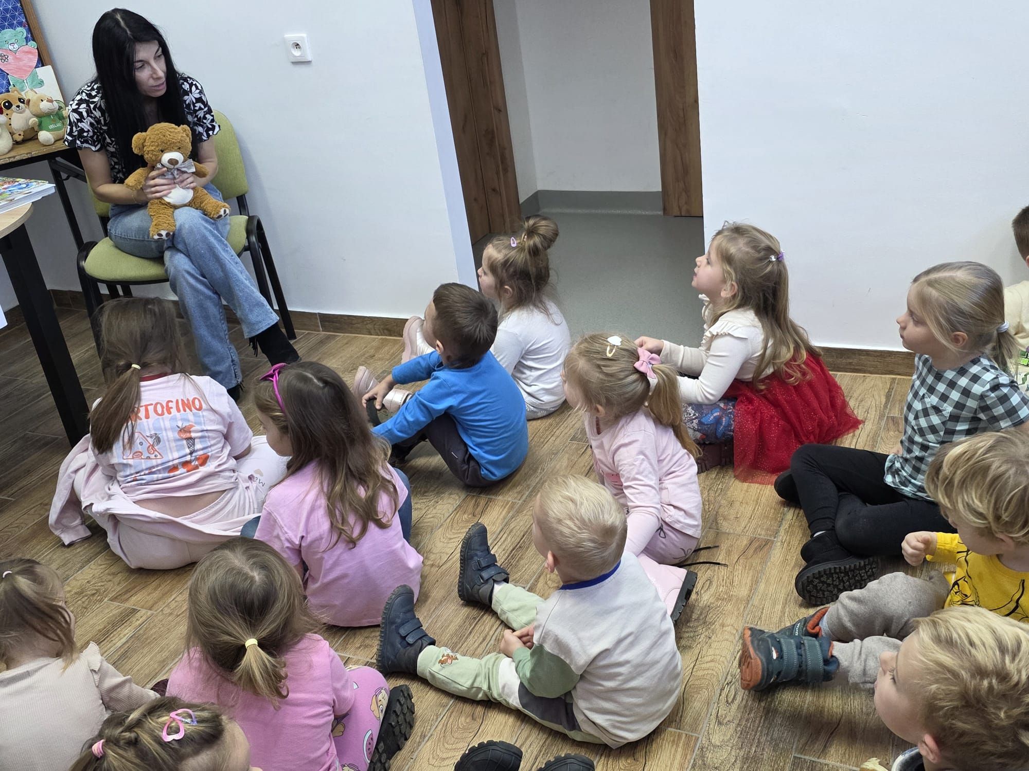 Podczas spotkania pani Beatka przeczytała bajeczkę „Złotowłosa i trzy niedźwiadki”. Dzieci z dużym zaangażowaniem rozwiazywały zagadki oraz miały możliwość obejrzeć różne książeczki o misiach.Z zaciekawieniem przeglądały bajeczki i poznawały nowe, ciekawe historyjki. Na zakończenie zajęć czekała na wszystkich niespodzianka od pani Beatki. To był dzień pełen książkowych przygód!