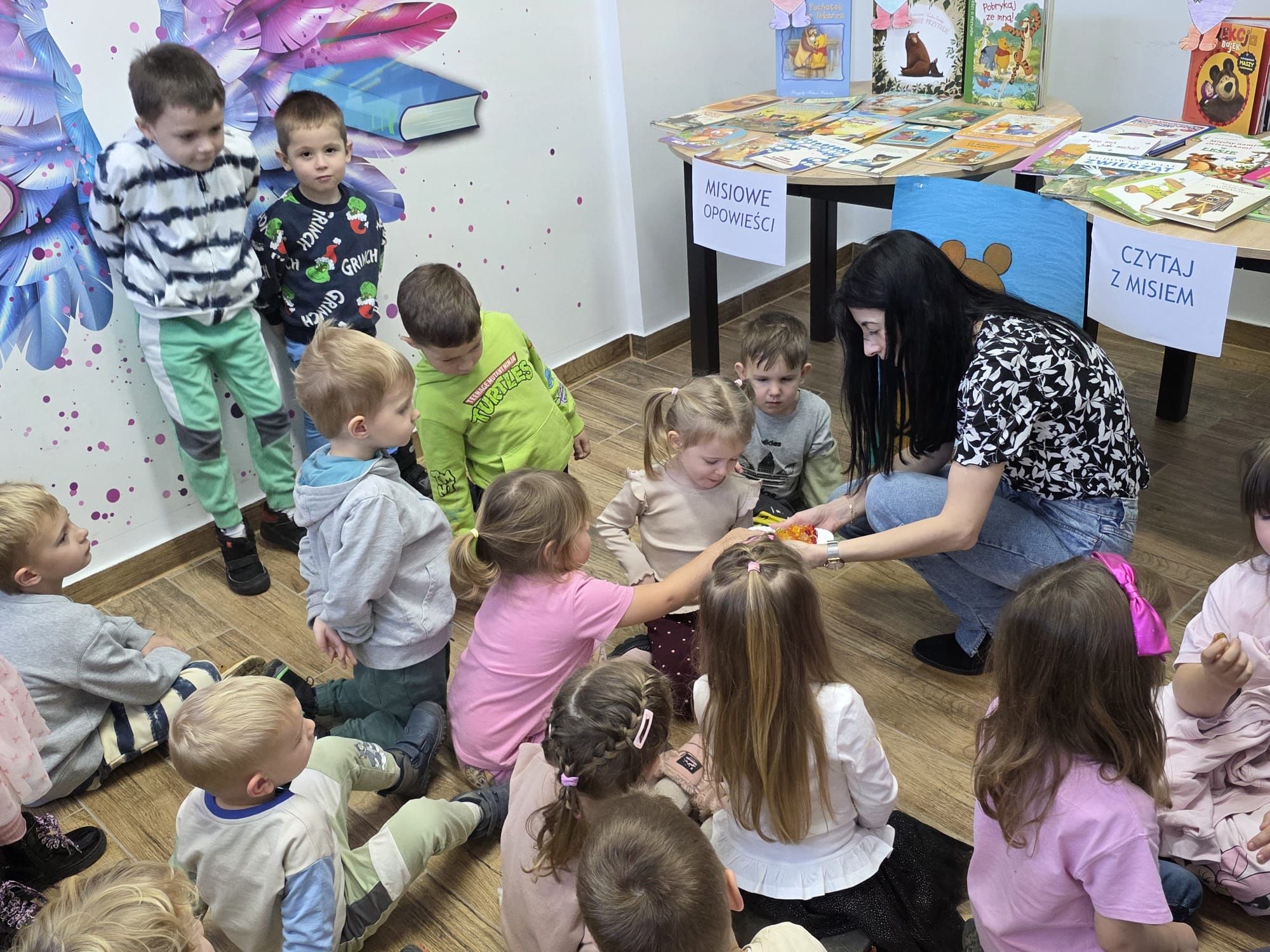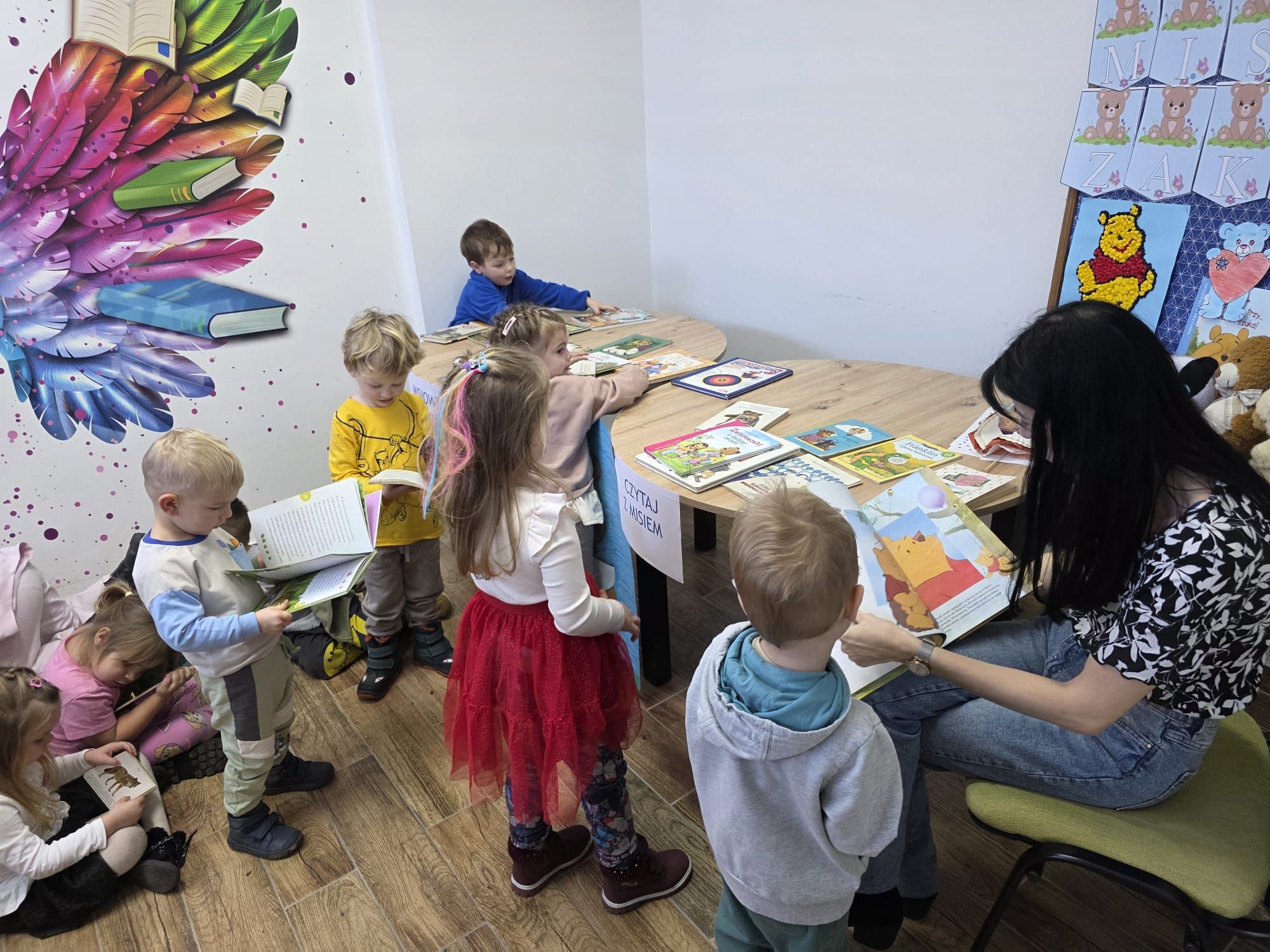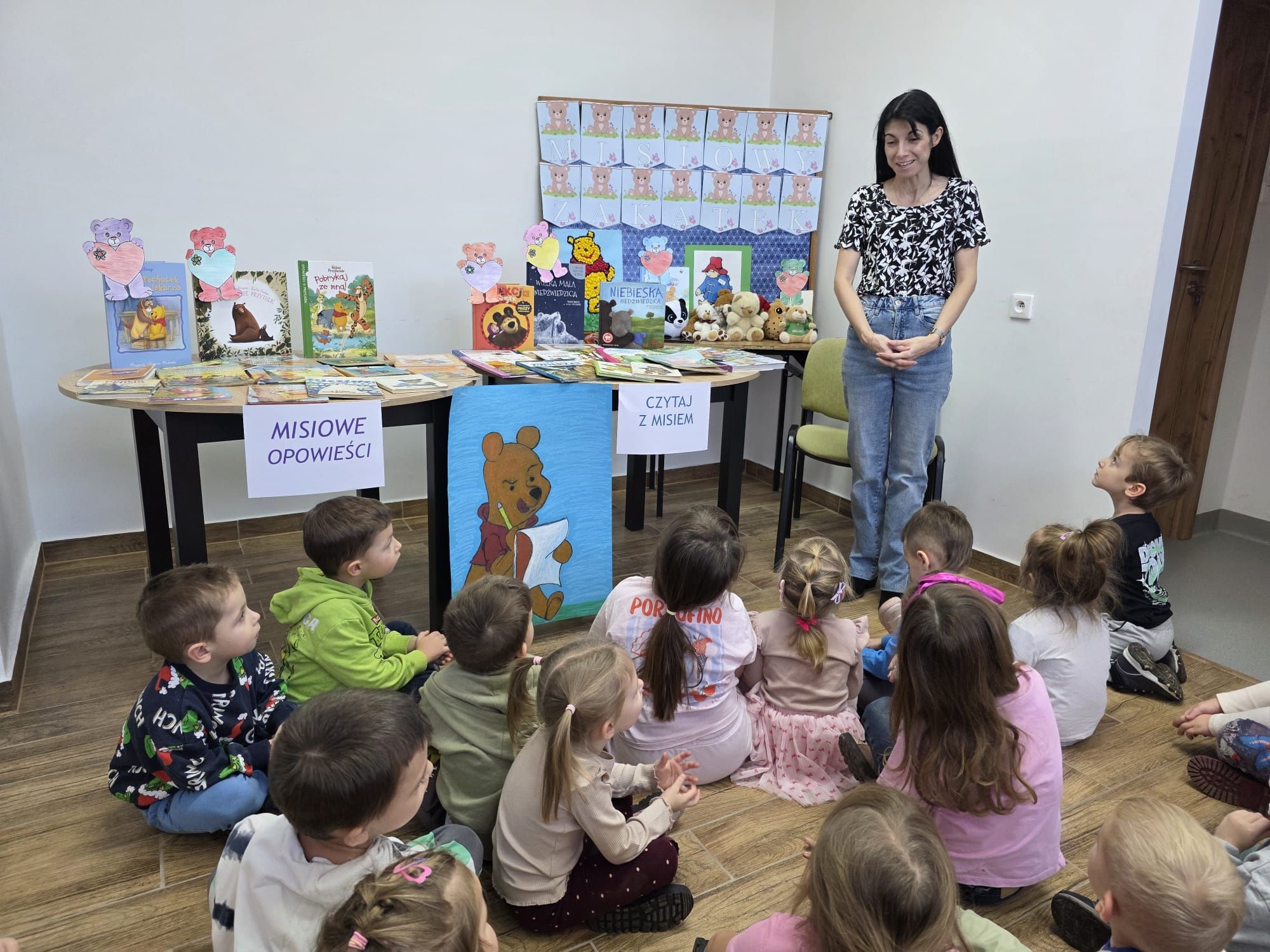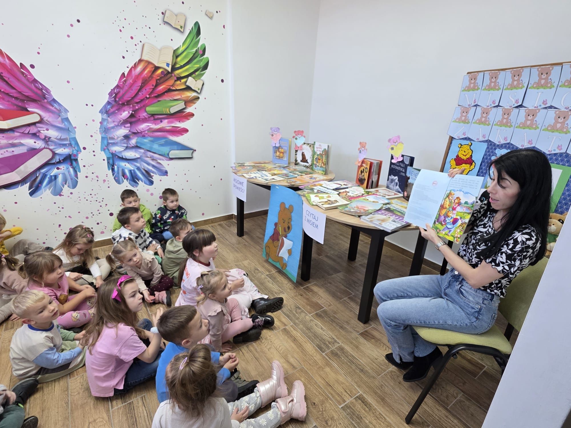 Podczas spotkania pani Beatka przeczytała bajeczkę „Złotowłosa i trzy niedźwiadki”. Dzieci z dużym zaangażowaniem rozwiazywały zagadki oraz miały możliwość obejrzeć różne książeczki o misiach.Z zaciekawieniem przeglądały bajeczki i poznawały nowe, ciekawe historyjki. Na zakończenie zajęć czekała na wszystkich niespodzianka od pani Beatki. To był dzień pełen książkowych przygód!
