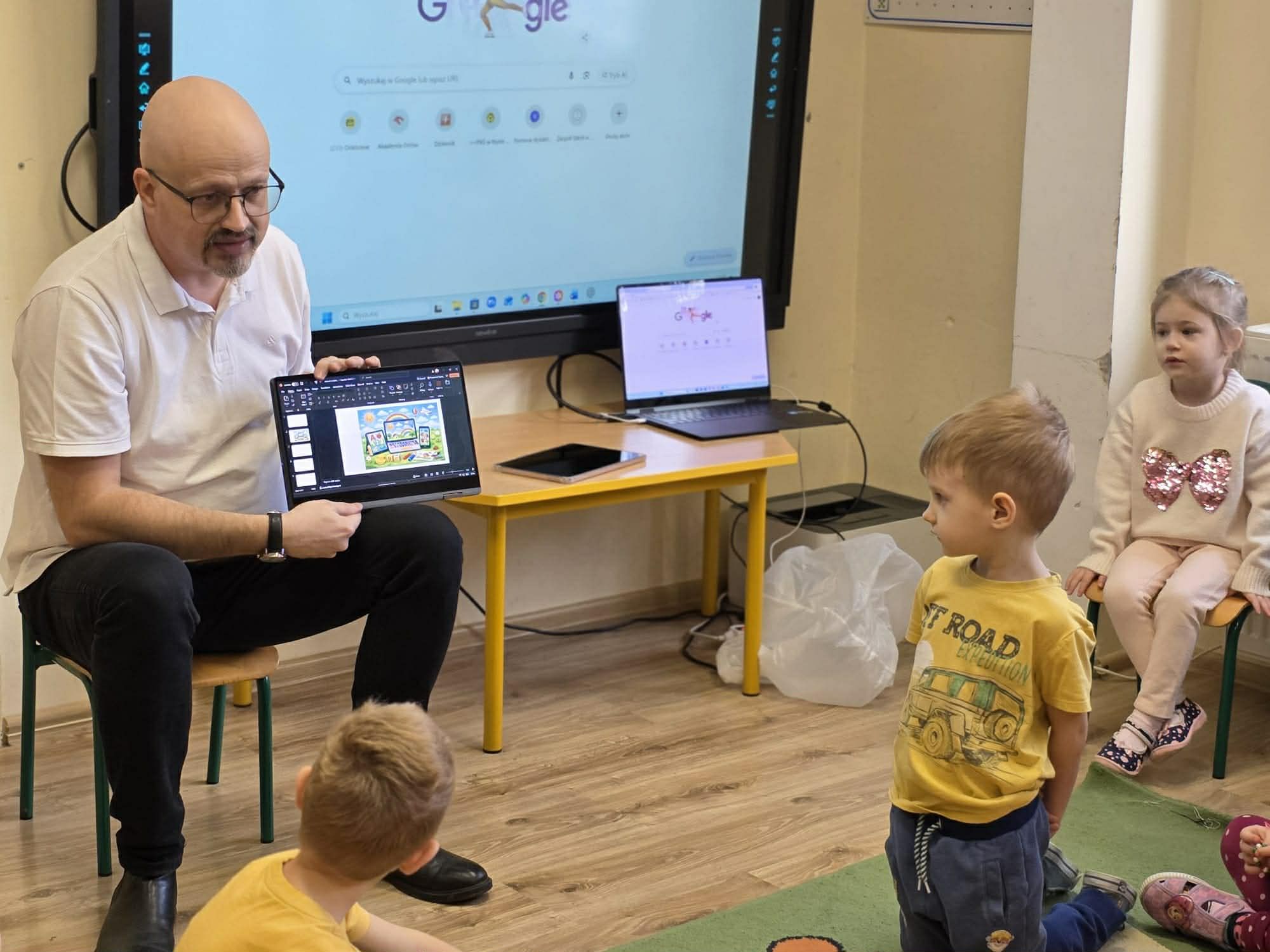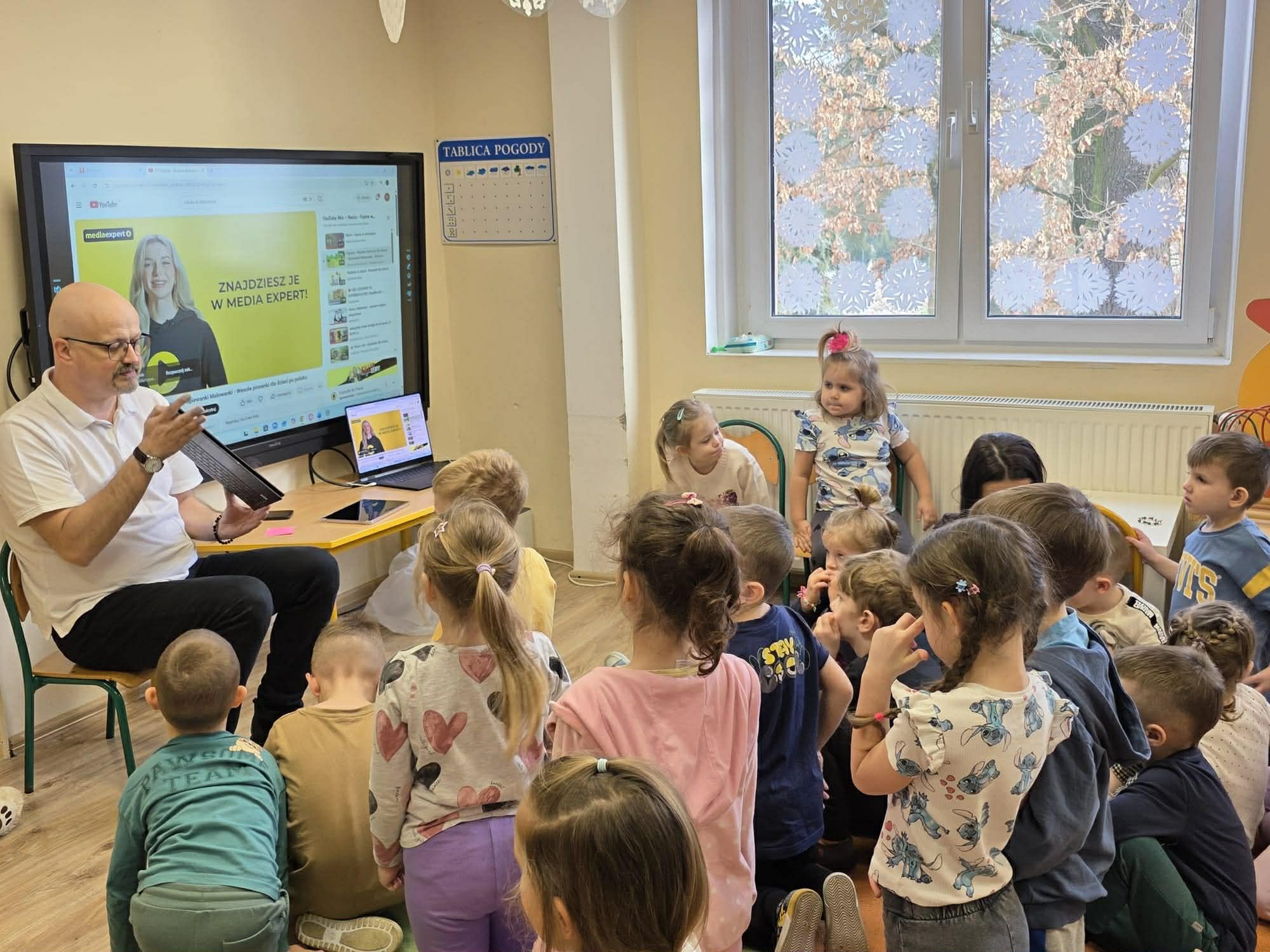 Pan pedagog w zrozumiały dla dzieci sposób, na przykładach, przeprowadził zajęcia edukacyjne z przedszkolakami