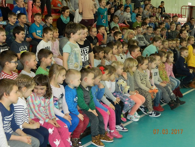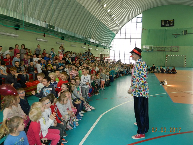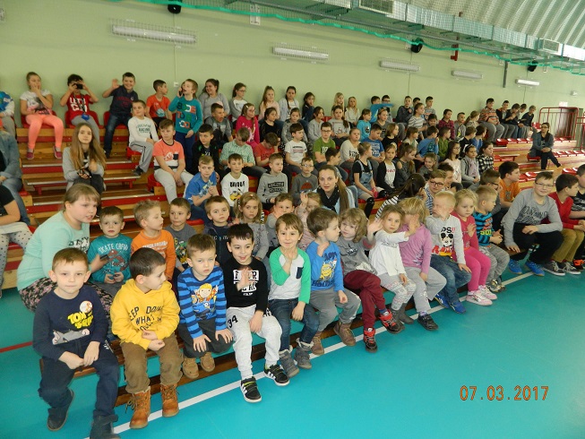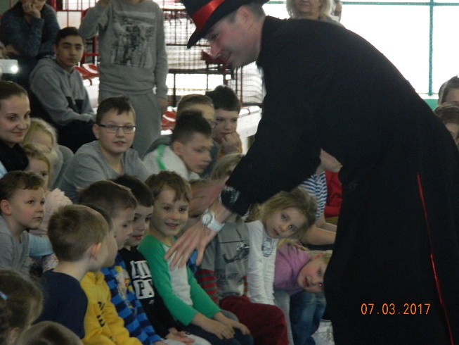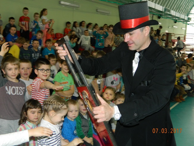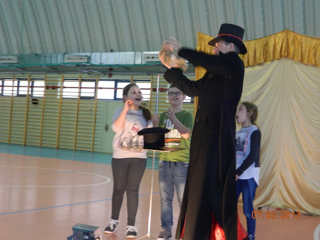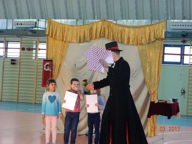7 marca wszystkie dzieci wraz z opiekunami wybrały się do szkoły, gdzie na sali gimnastycznej miał odbyć się spektakl iluzjonistyczny pt.: „Świat Magii”, w wykonaniu artystów z Rumunii. Magicy dzięki zaprezentowanym sztuczkom przenieśli dzieci w świat wyobraźni, iluzji i zabawy. Dzieci miały możliwość przeżycia czegoś niezwykłego i magicznego. Wielkie zdumienie wzbudził Człowiek Sprężyna – uczestnik projektu „Mam Talent” w Rumunii a Klaun rozśmieszał do łez. Artyści zadbali również o to, żeby wszystkie dzieci bardzo aktywnie uczestniczyły w przedstawieniu, poznały „tajemnicze zaklęcie”, a wielu odważnych ochotników pomagało czynnie w przedstawieniu. Radosna forma przekazu w rytmie wesołej muzyki, efektów laserowych i dymu sprawiła, że wszystkie dzieci bawiły się doskonale.
