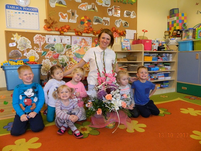 Od wielu ciepłych słów, życzeń i kwiatów rozpoczął się piątkowy poranek w naszym przedszkolu - a to wszystko z okazji Dnia Nauczyciela. To święto wszystkich tych, którzy oddają całe swoje serce, aby dzieciom w przedszkolu było naprawdę dobrze i bezpiecznie. Świętuje więc cały personel przedszkola – pani dyrektorpani intendentka, pani kucharka, pani woźna, panie pomoce. Było 100 lat, były oklaski, były piękne papierowe gerbery, które pomogła dzieciom zrobić pani Anetka. Dzieci pięknie nam zaśpiewały, zatańczyły a nawet porwały do tańca panią Dyrektor! Było bardzo wesoło .