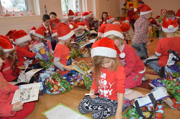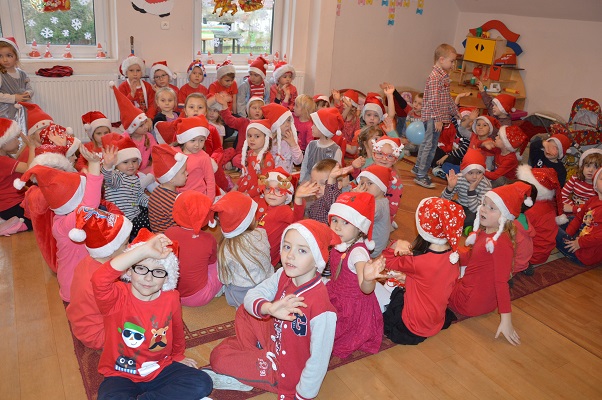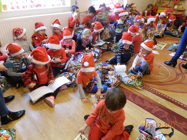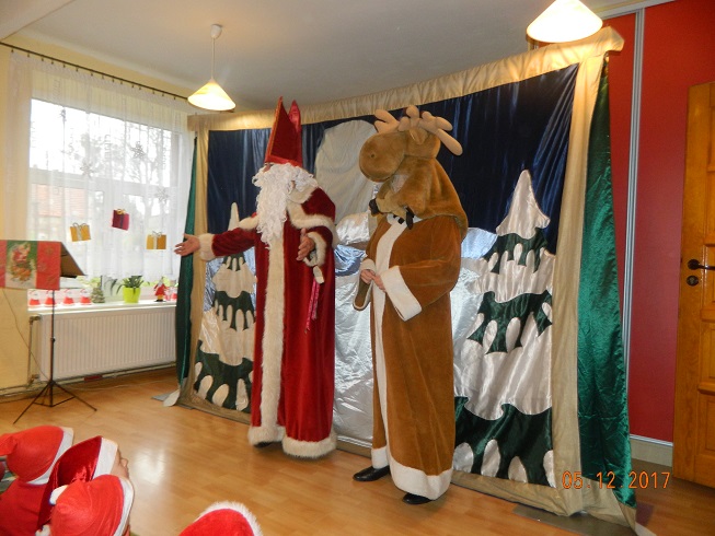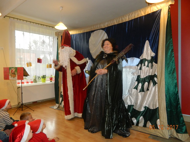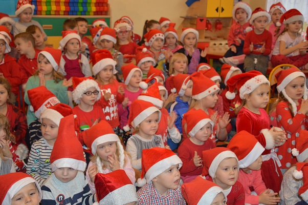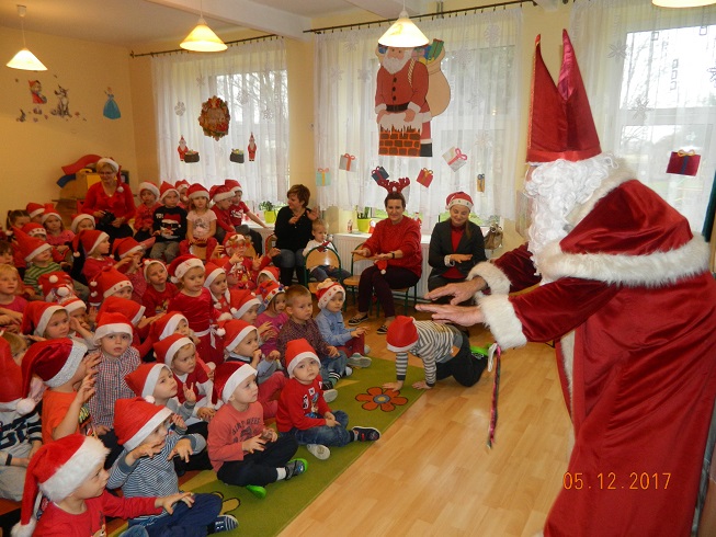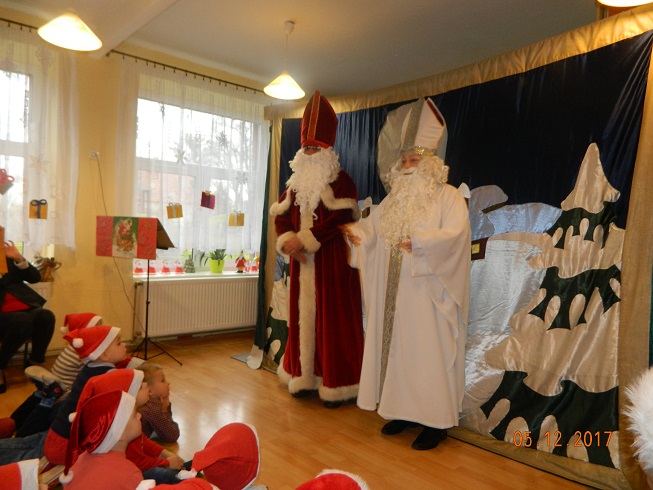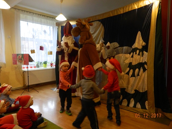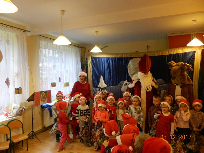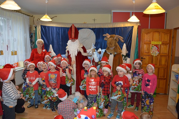 We wtorek 5 grudnia przedszkolaki obejrzały przedstawienie teatralne pt. "Legenda o Świętym Mikołaju" w wykonaniu aktorów z objazdowej gruby teatralnej. Spektakl, wypełniony piosenkami i zabawami ruchowymi z dziećmi, wprowadził wszystkich widzów w radosny, świąteczny nastrój. Piękne dekoracje, stroje i ekspresja aktorów sprawiły, że dzieci oglądały widowisko jak zauroczone i chętne do wszelkiego w nim udziału. Poznały postacie Mikołajów i ich nazwy z różnych krajów, m.in. z Norwegii, Stanów Zjednoczonych Ameryki, Włoch i Rosji. Witały się z tymi Mikołajami w ich językach i bawiły się tanecznie. Przedstawienie to wniosło wiele radości i zaciekawienia tym, co zdawałoby się oczywiste. Na zakończenie Mikołaj wręczył wszystkim dzieciom prezenty. Oprócz prezentów, Mikołaj podarował dzieciom mnóstwo radości i uśmiechu. Rozmawiał z nimi i zachęcał, aby były grzeczne.  Ten magiczny dzień na długo pozostanie w pamięci przedszkolaków. Zdjęcia zrobione z Mikołajem, będą wspaniała pamiątką tego spotkania.