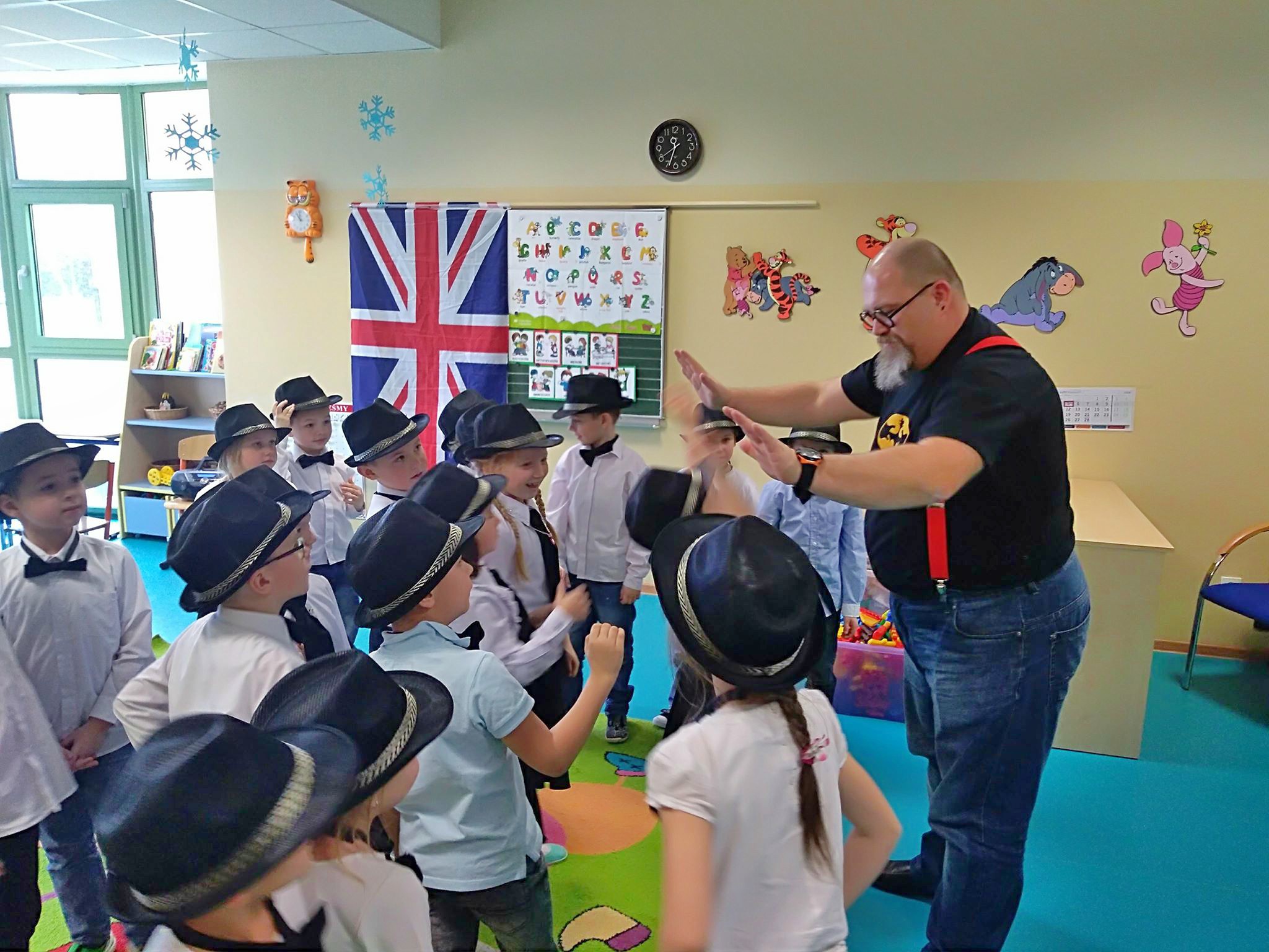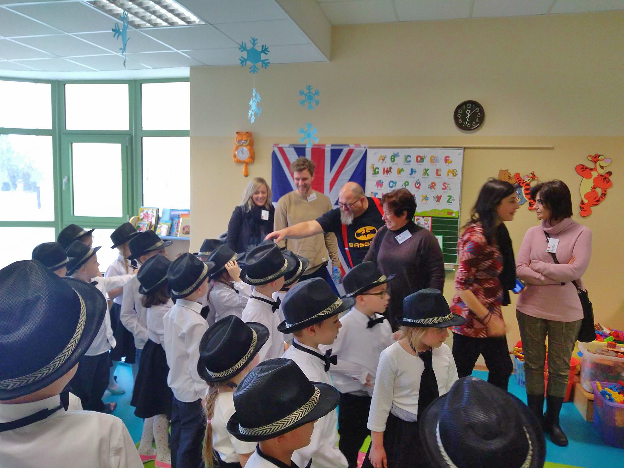 Nasi podopieczni zaprezentowali się przed publicznością w tanecznym występie „Kapeluszowy taniec”. Po oficjalnej części powitania, zagraniczni goście - nauczyciele wraz uczniami odwiedzili nas w naszej sali, mogli więc obejrzeć pomieszczenia w której  odbywają się zajęcia oraz zobaczyć warunki w jakich się uczymy i pracujemy.