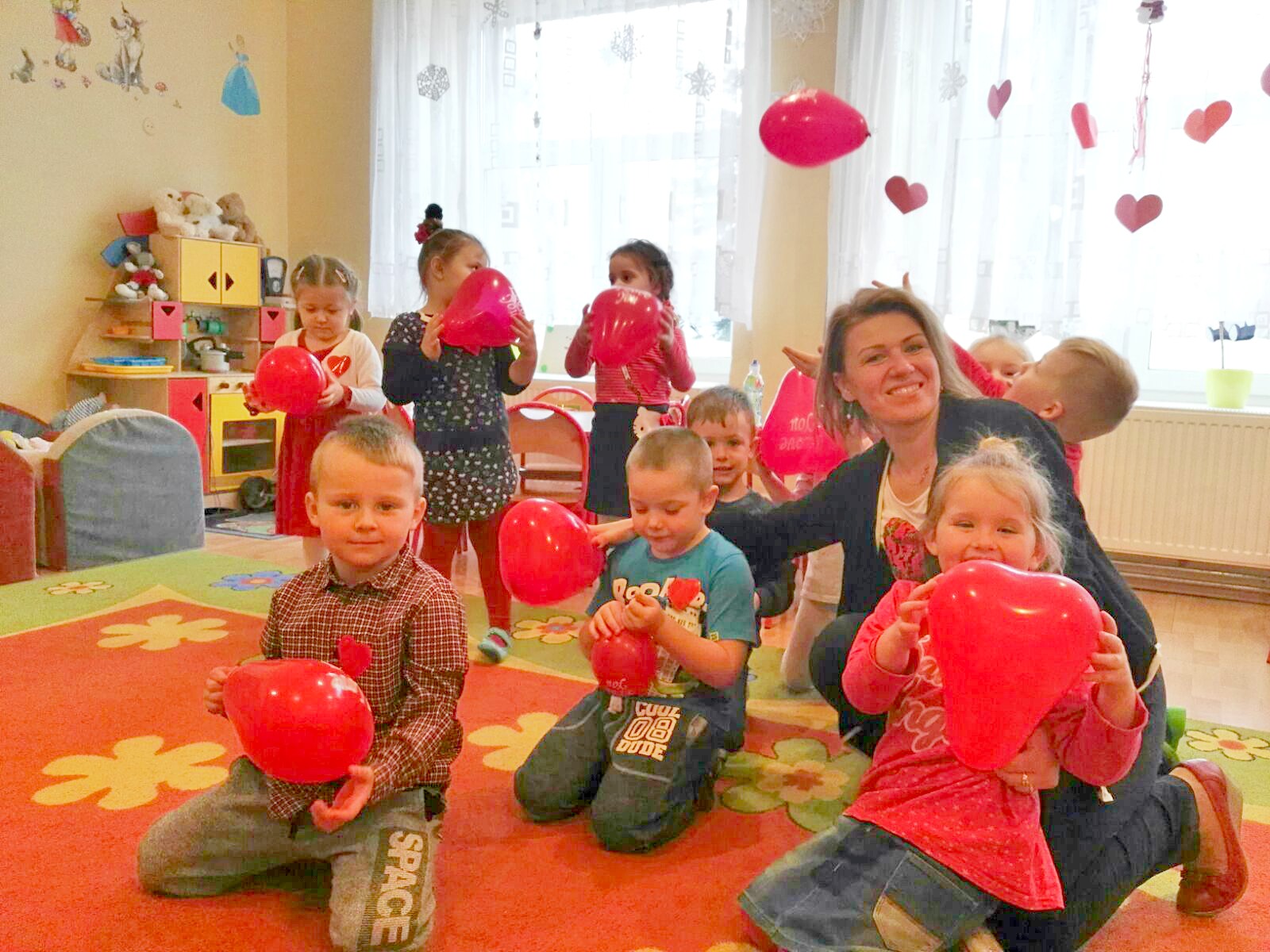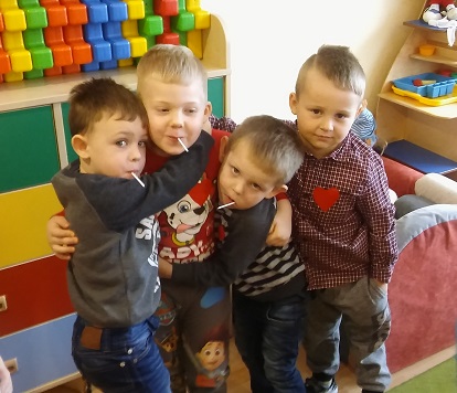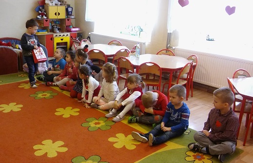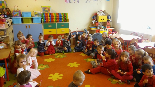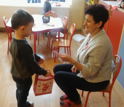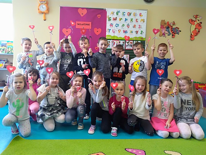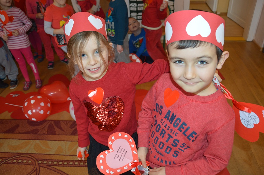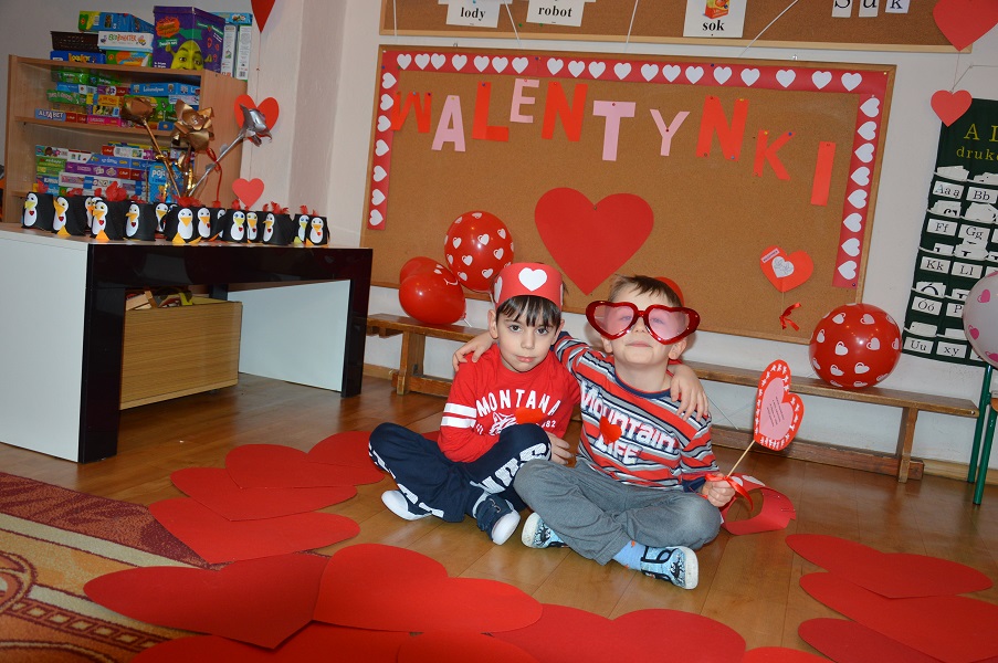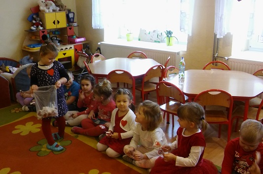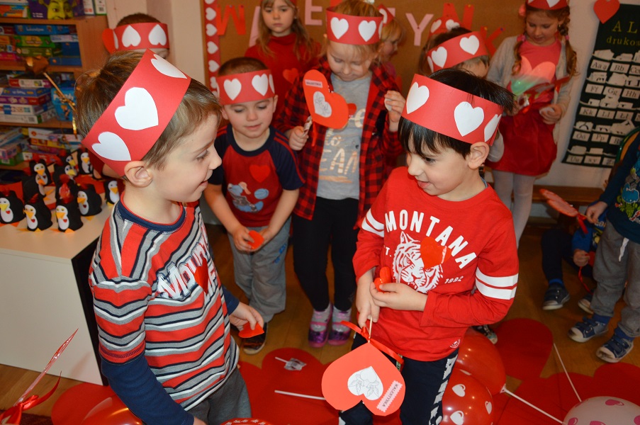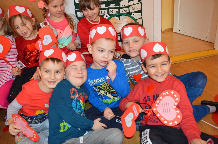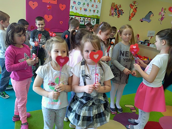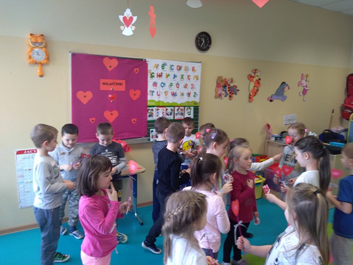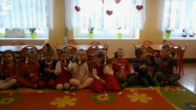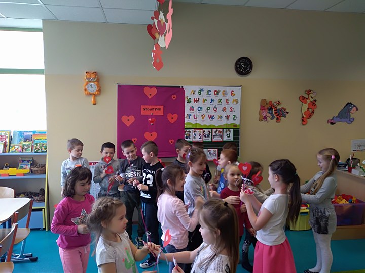 Dzieci uczestniczyły w różnych zabawach walentynkowych tj.: „Z serduszka na serduszko” , „Uwaga serduszko parzy!”, „Serduszkowy taniec połamaniec” , „Serduszko do pary”, serduszkowe memory”. Przedszkolaki wręczały sobie walentynkowe upominki - lizaki, baloniki, serduszka walentynkowe, obdarzały się uśmiechem, miłym słowem i gestem.