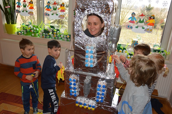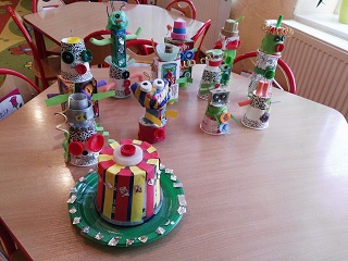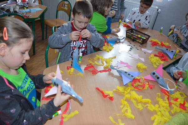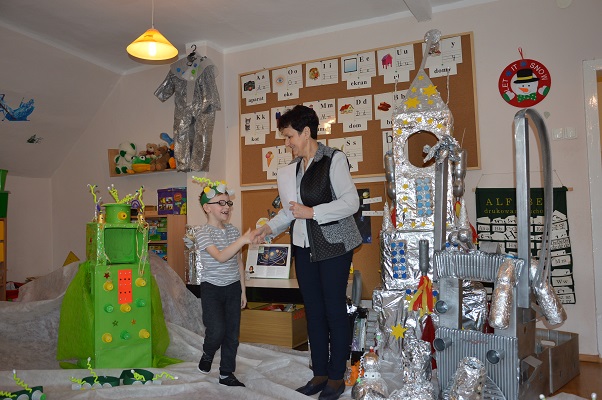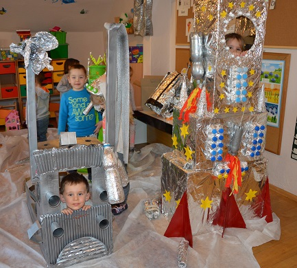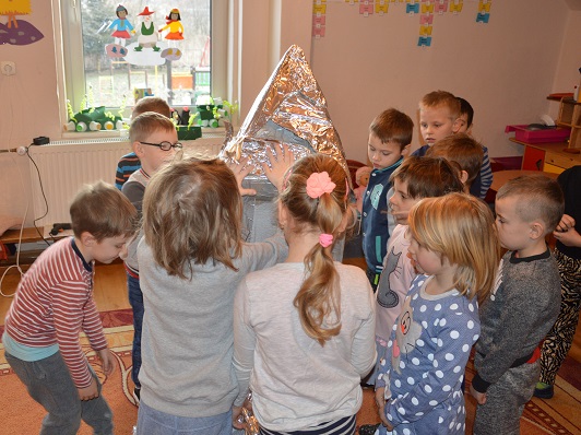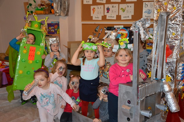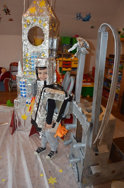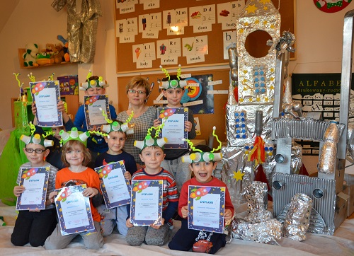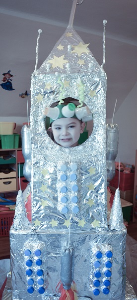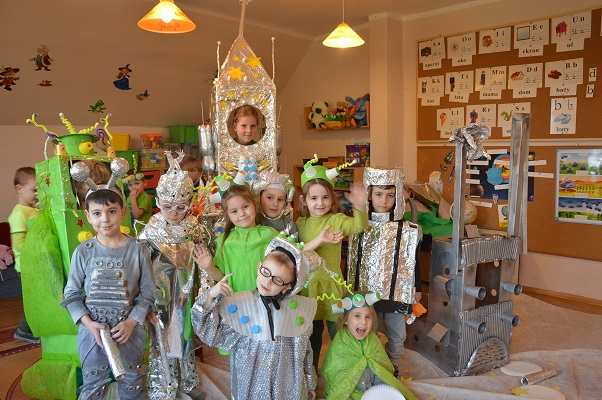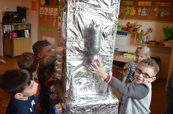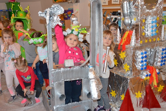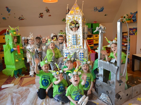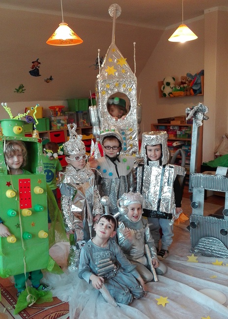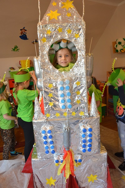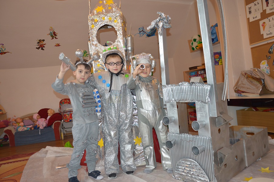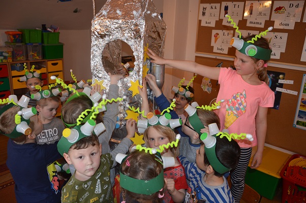 Miniony tydzień upłynął dzieciom z oddziału 5-latków pod hasłem  „ Nie jesteśmy  sami kosmosie ”. Aby uzyskać informacje o kosmosie, układzie słonecznym, należących do niego planetach, gwiazdozbiorach i odpowiedzieć na nurtujące nas pytania sięgnęliśmy do źródeł wiedzy, jakimi były książki, albumy przyniesione przez dzieci, filmy, opowiadania. Przedszkolaki poznały postać Mikołaja Kopernika, dowiedziały się, dlaczego mówimy, „wstrzymał słońce, ruszył ziemię”. Dzieci miały okazję do twórczych zabaw konstrukcyjnych, eksperymentów. Wykorzystując balony przeprowadziliśmy eksperyment wyjaśniający- Dlaczego rakieta leci ?. Wykonaliśmy także za pomocą latarki  doświadczenie obrazujące ruch Ziemi wokół Słońca. Wiemy, dlaczego mamy dzień i noc. ,,Obserwacji nieba” posłużyły dzieciom wykonane z kartonowej rolki lunety. Natomiast opaski ufoludków wykorzystaliśmy do zabaw ruchowych i muzycznych. Do zwiedzenia naszej kosmicznej sali zaprosiliśmy koleżanki i kolegów z innych oddziałów przedszkola. W uatrakcyjnienie zajęć zaangażowali się rodzice poprzez wykonanie bardzo ciekawych,  kosmicznych  przebrań. Mama Jasia i Michałka pomogły nam w wykonaniu rakiety i pojazdu kosmonauty z kartonowych pudeł.  Pomysłowość  Rodziców przeszła najśmielsze oczekiwania.  Rodzicom oraz wszystkim, którzy przyczynili się do realizacji naszego bloku tematycznego bardzo serdecznie dziękujemy za pomoc.