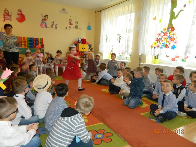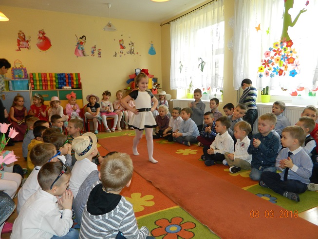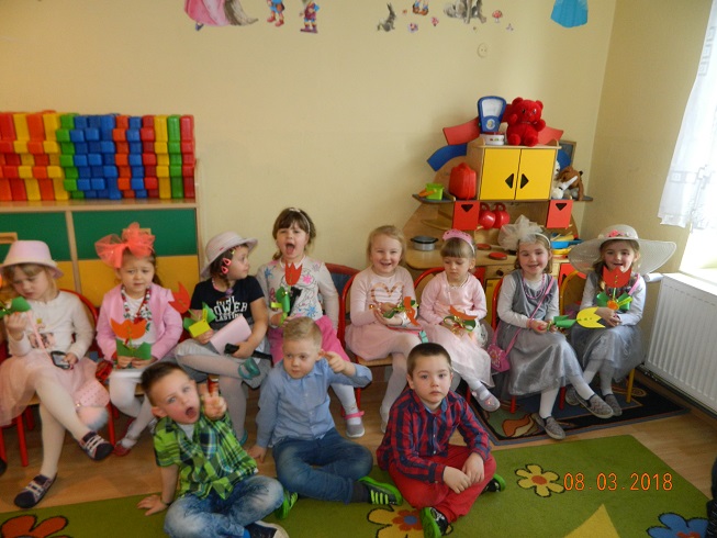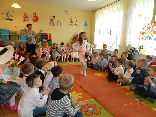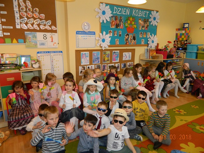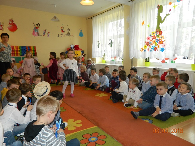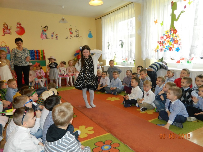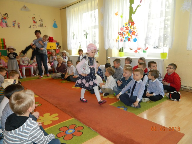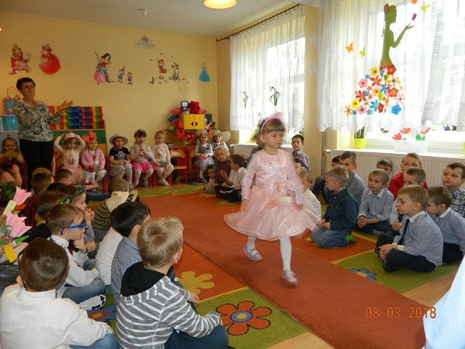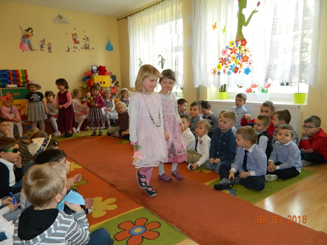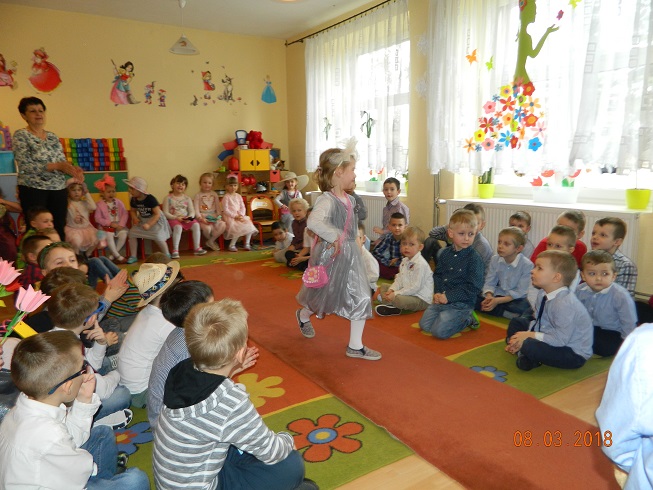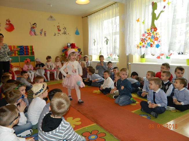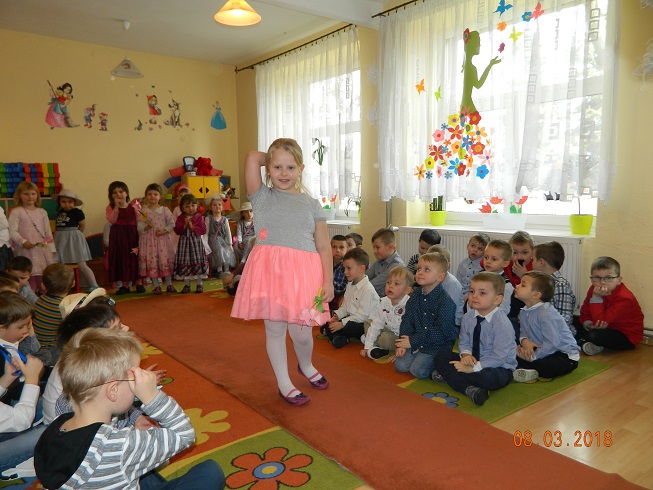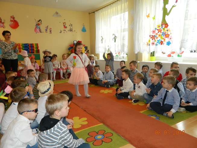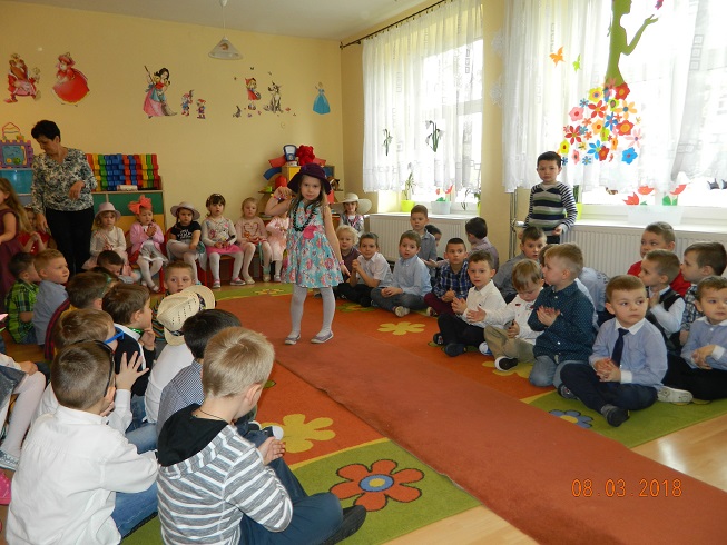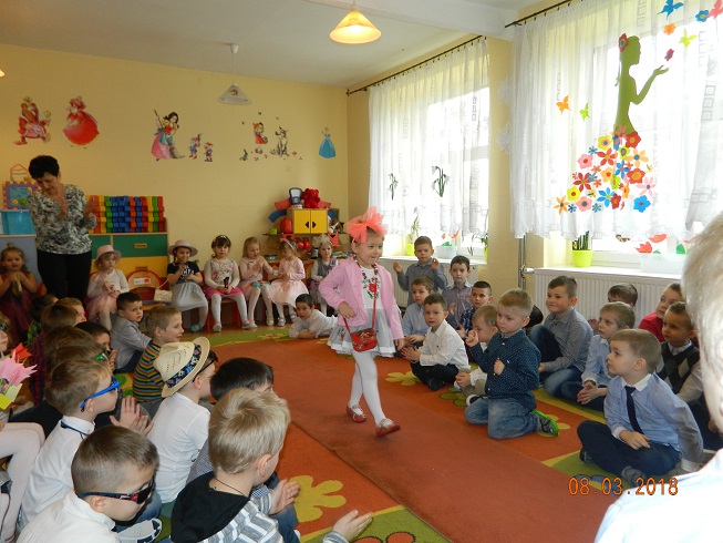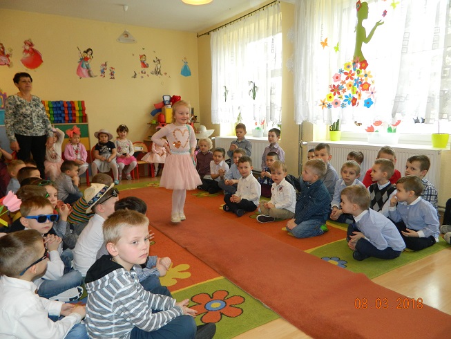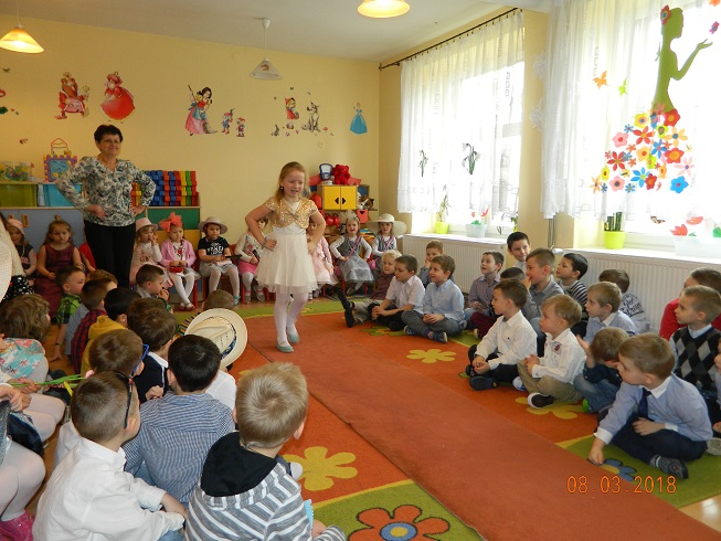 Święto Kobiet, które corocznie obchodzimy w naszym przedszkolu, to doskonały sposób do kształtowania u dzieci nawyku obdarowywania upominkami swoich najbliższych oraz sprawiania im radości. W tym dniu, chłopcy - mali dżentelmeni starannie przygotowali się do występu. Pięknie zaśpiewali i wyrecytowali wiersze o kobietach a następnie obdarowali swoje koleżanki oraz panie miłymi życzeniami i kwiatami. Nie zapomnieli także o swoich mamach, dla których również mieli przygotowaną niespodziankę. Wszystkie dziewczynki zamieniły się w piękne Damy. Wystrojone w kolorowe sukienki, kapelusze i różne inne błyskotki, dumnie prezentowały się na "Czerwonym Dywanie", otrzymując gromkie brawa. Dziewczynki nie kryły swojego zadowolenia, były szczęśliwe i uśmiechnięte.
