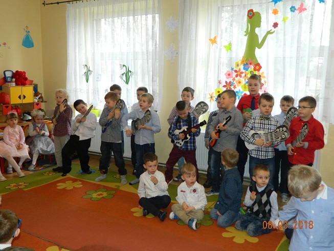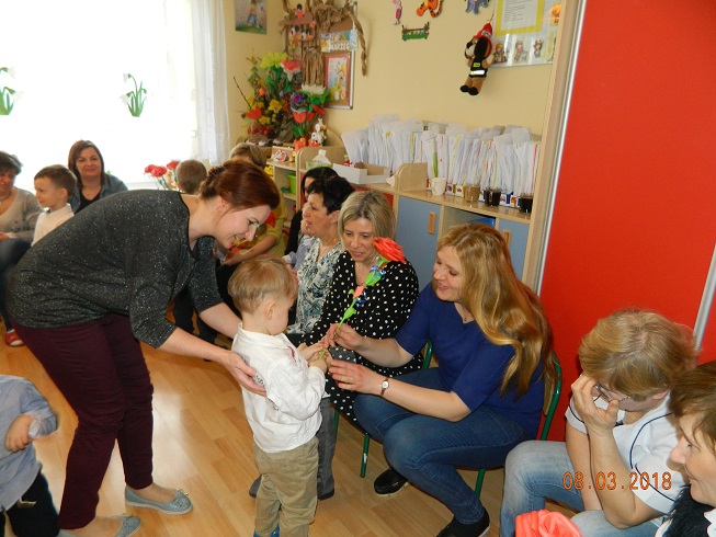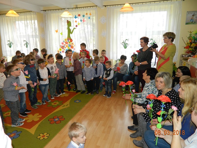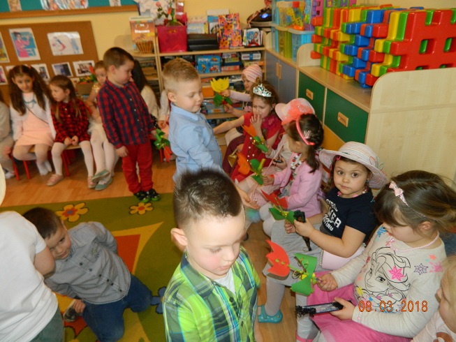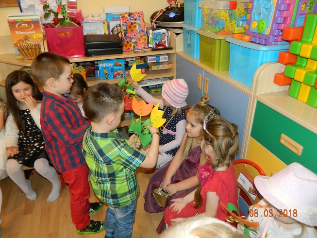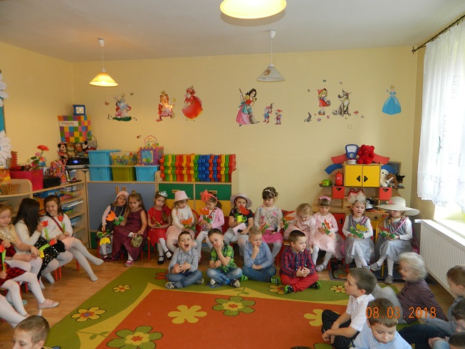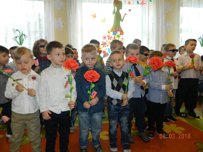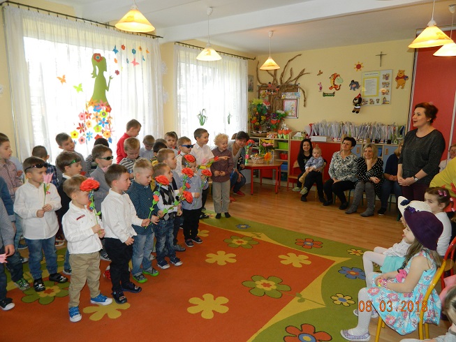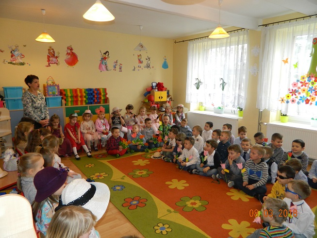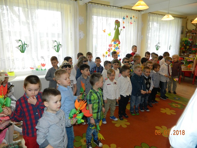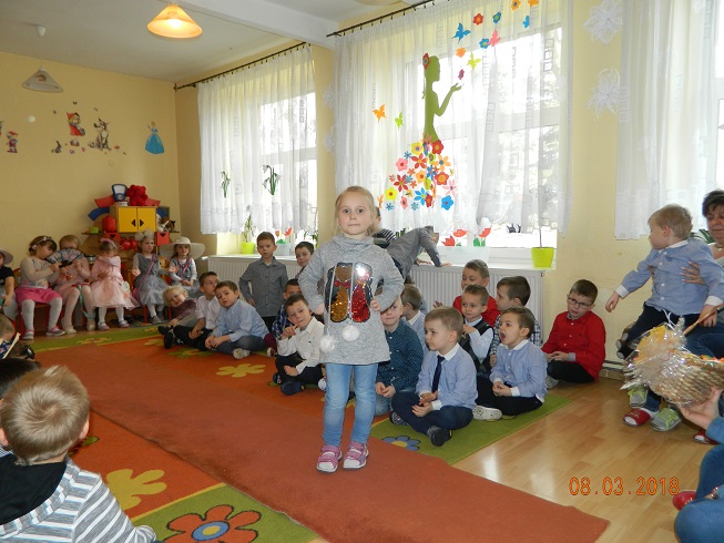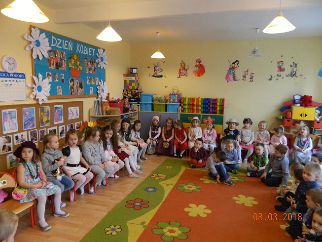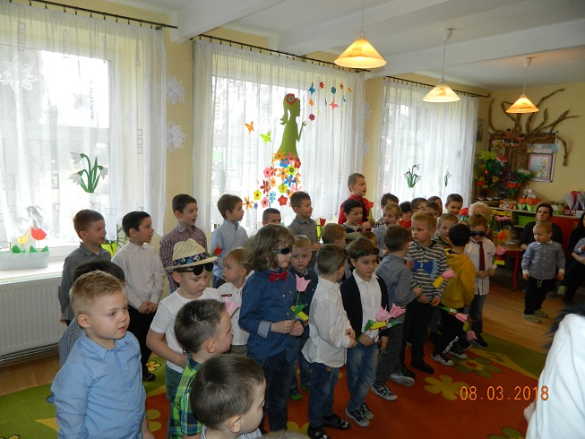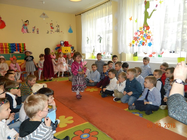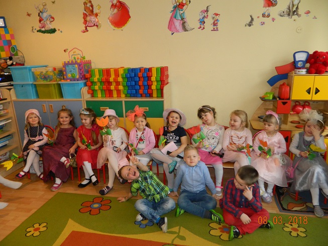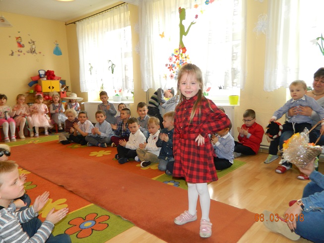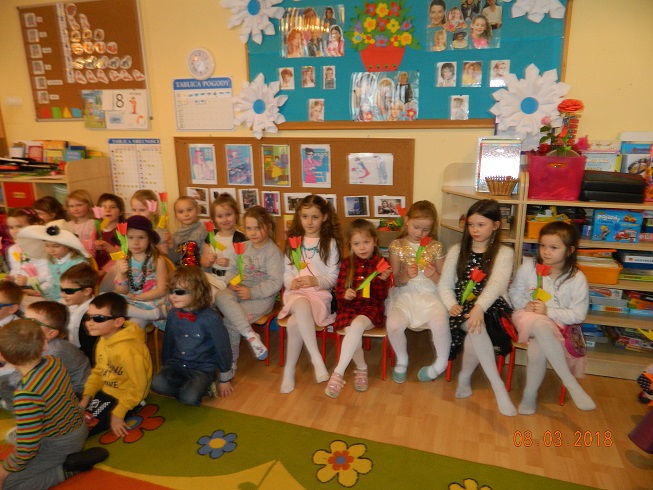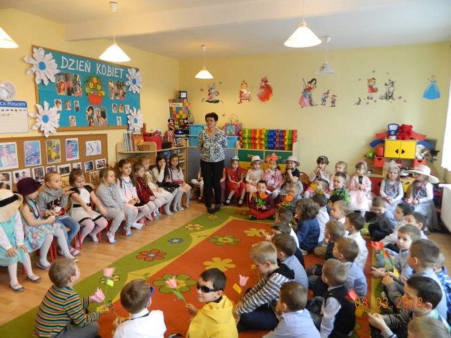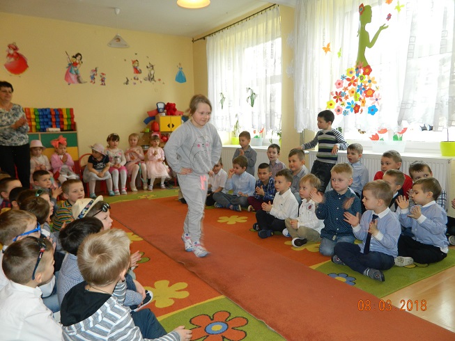 Święto Kobiet, które corocznie obchodzimy w naszym przedszkolu, to doskonały sposób do kształtowania u dzieci nawyku obdarowywania upominkami swoich najbliższych oraz sprawiania im radości. W tym dniu, chłopcy - mali dżentelmeni starannie przygotowali się do występu. Pięknie zaśpiewali i wyrecytowali wiersze o kobietach a następnie obdarowali swoje koleżanki oraz panie miłymi życzeniami i kwiatami. Nie zapomnieli także o swoich mamach, dla których również mieli przygotowaną niespodziankę. Wszystkie dziewczynki zamieniły się w piękne Damy. Wystrojone w kolorowe sukienki, kapelusze i różne inne błyskotki, dumnie prezentowały się na "Czerwonym Dywanie", otrzymując gromkie brawa. Dziewczynki nie kryły swojego zadowolenia, były szczęśliwe i uśmiechnięte.
