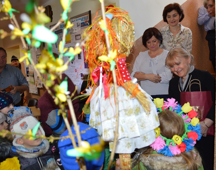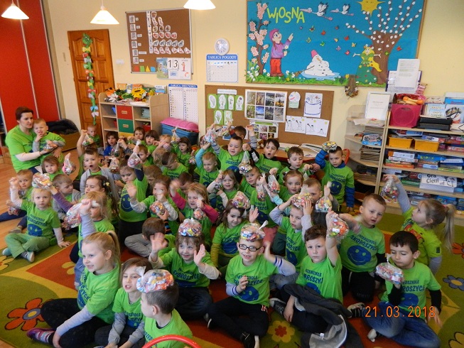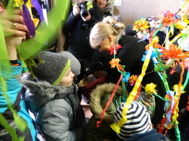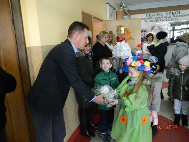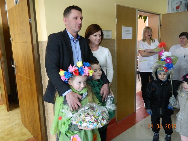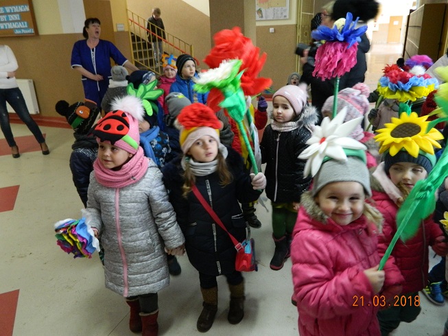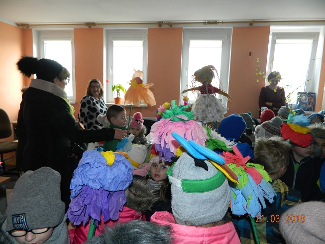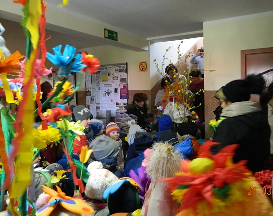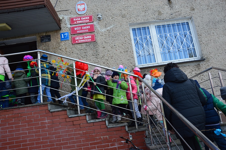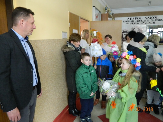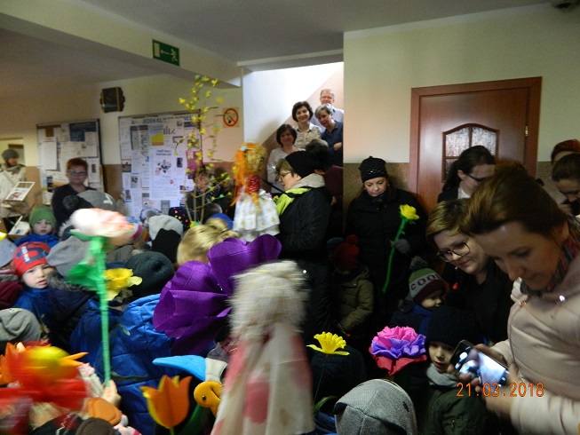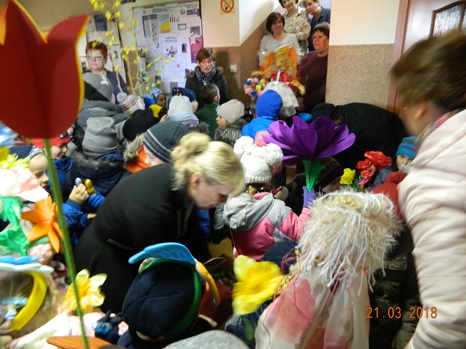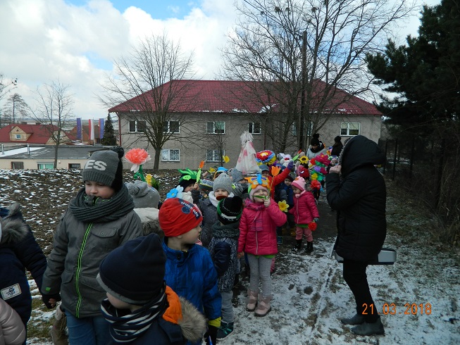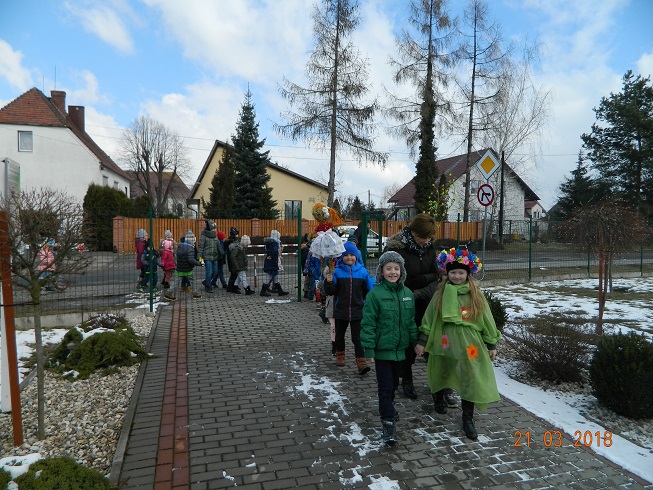 W środę 21 marca wszystkie dzieci z naszego przedszkola świętowały Pierwszy Dzień Wiosny. Aby podkreślić charakter tego dnia, przedszkolaki przyszły ubrane na zielono. Dzieci radośnie maszerowały w wiosennym pochodzie, na czele którego widniała Marzanna oraz wiosenny gaik. Z wiosennymi życzeniami i upominkiem od Pani Wiosny, odwiedziliśmy zakłady pracy rodziców oraz instytucje: Urząd Gminy Skoroszyce, GZEAiS oraz Zakład Oczyszczania i Wodociągów, Szkołę, sklep "Wimar" i "ABC", Zakład Fryzjerski oraz Zakład Skupu Złomu. Kolorowe kwiaty i bibułowe wstążki, niosły razem z wiatrem piosenki, głośne okrzyki i wiosenne nastroje roześmianych przedszkolaków. Jesteśmy pewni, że starania naszych wspaniałych podopiecznych sprawią, że Wiosna zawita do nas na dobre.