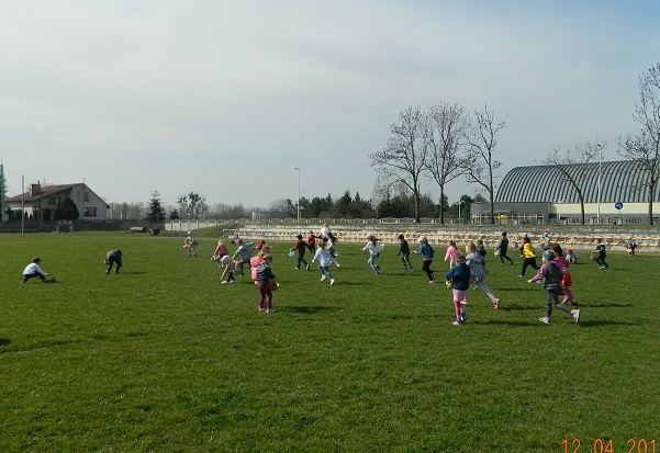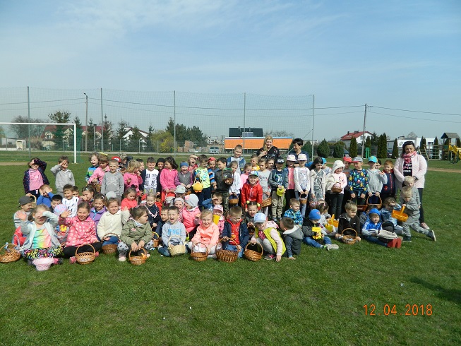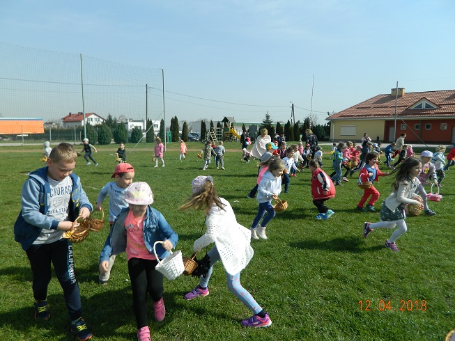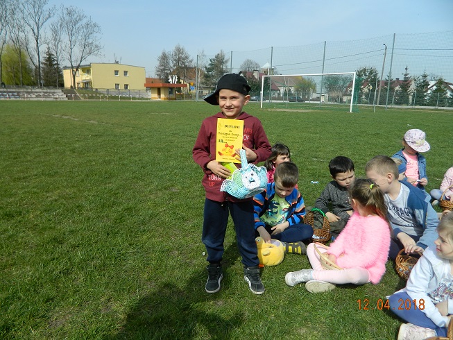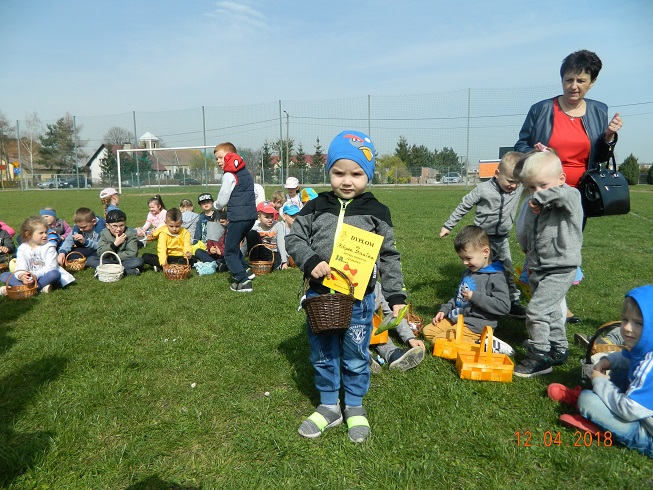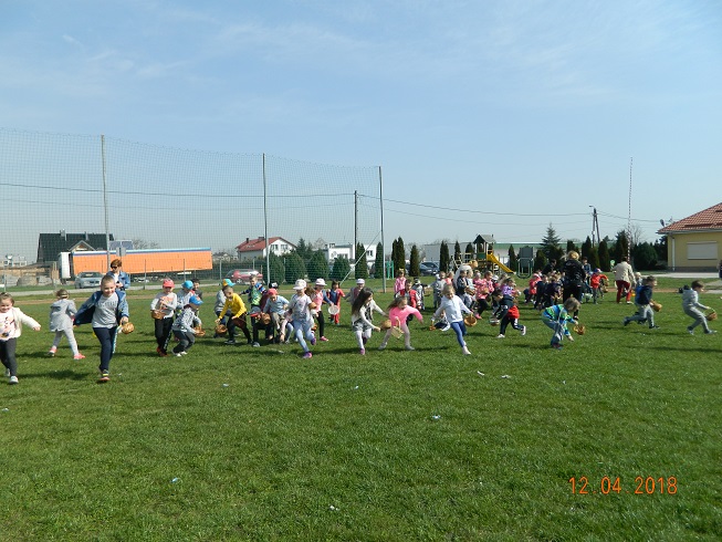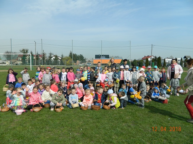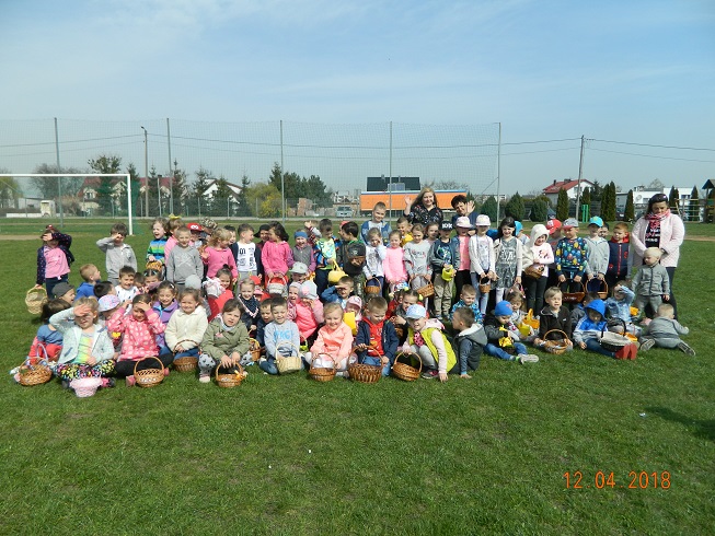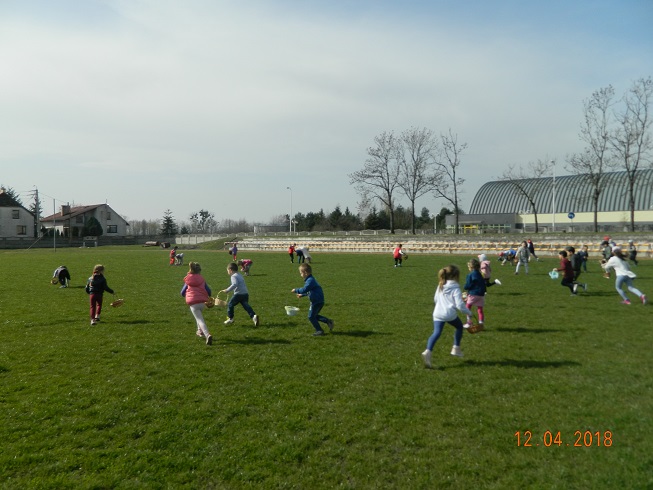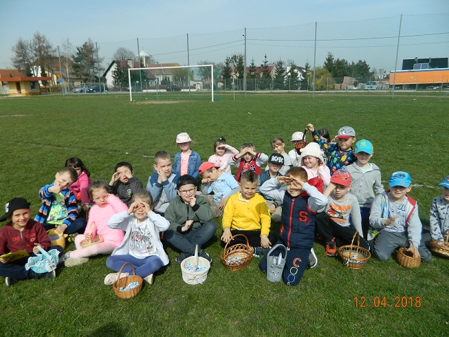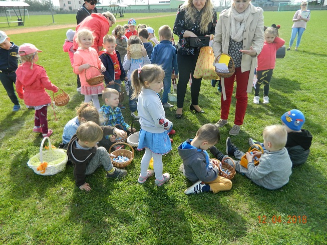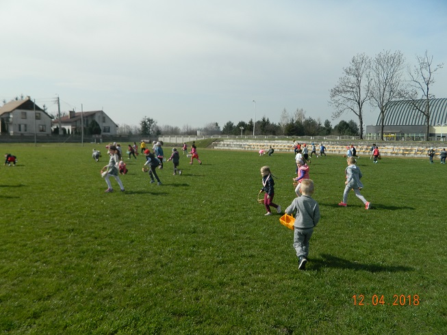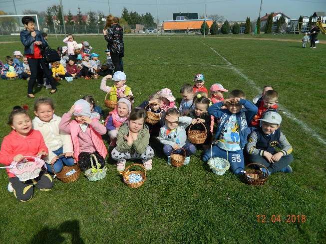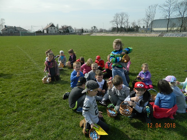 12 kwietnia dzieci z naszego przedszkola zostały zaproszone przez Ośrodek Kultury Gminy Skoroszyce do zabawy „W szukanie słodkości” ukrytych na murawie stadionu w Skoroszycach.