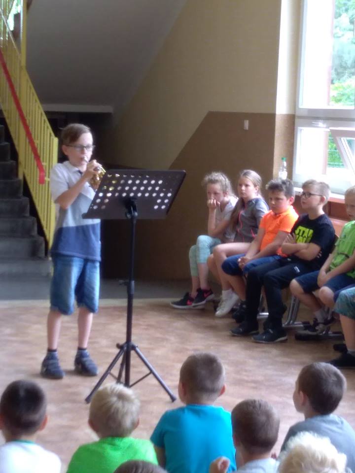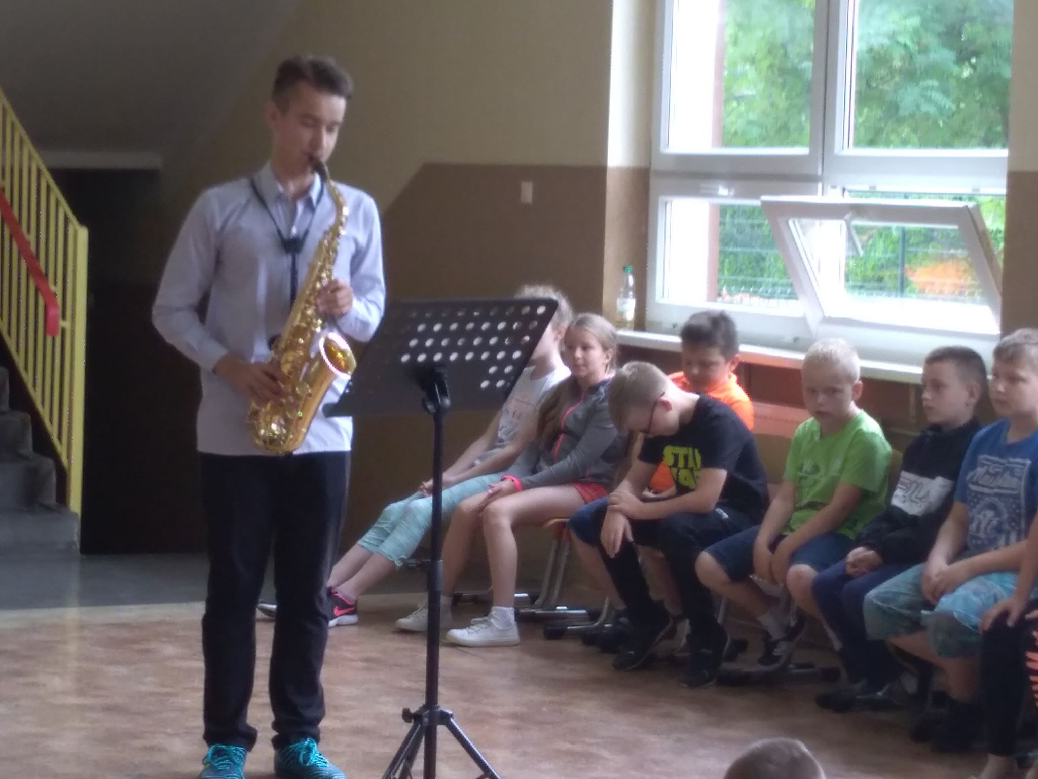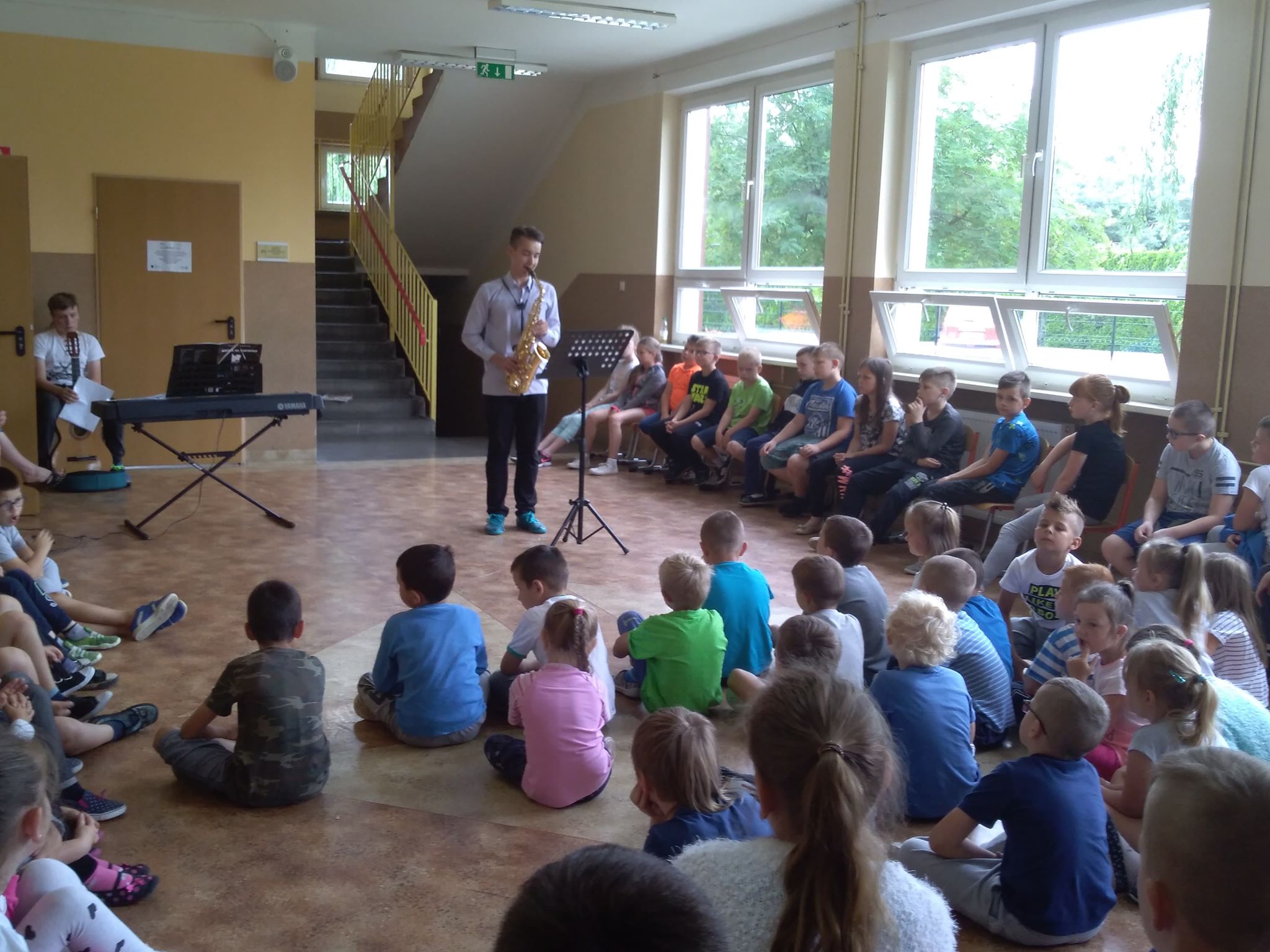 Dzieci z grupy IV – 6 latki miały możliwość wysłuchania koncertu instrumentalnego w wykonaniu uczniów naszej szkoły. Uczniowie pod opieką p. Beaty Murańskiej zaprezentowali swoje umiejętności gry na różnych instrumentach: Ola Zdunek - fortepian, Konstancja Murańska - skrzypce, Hubert Murański - trąbka, Nikodem Abram - gitara, Jakub Ciosmak - saksofon. Każdy uczeń opowiadał o sposobie gry na swoim instrumencie oraz pochodzeniu wykonanego utworu. Bardzo nam się podobało i muzycy nasi zostali nagrodzeni gromkimi brawami. Dziękujemy!!!