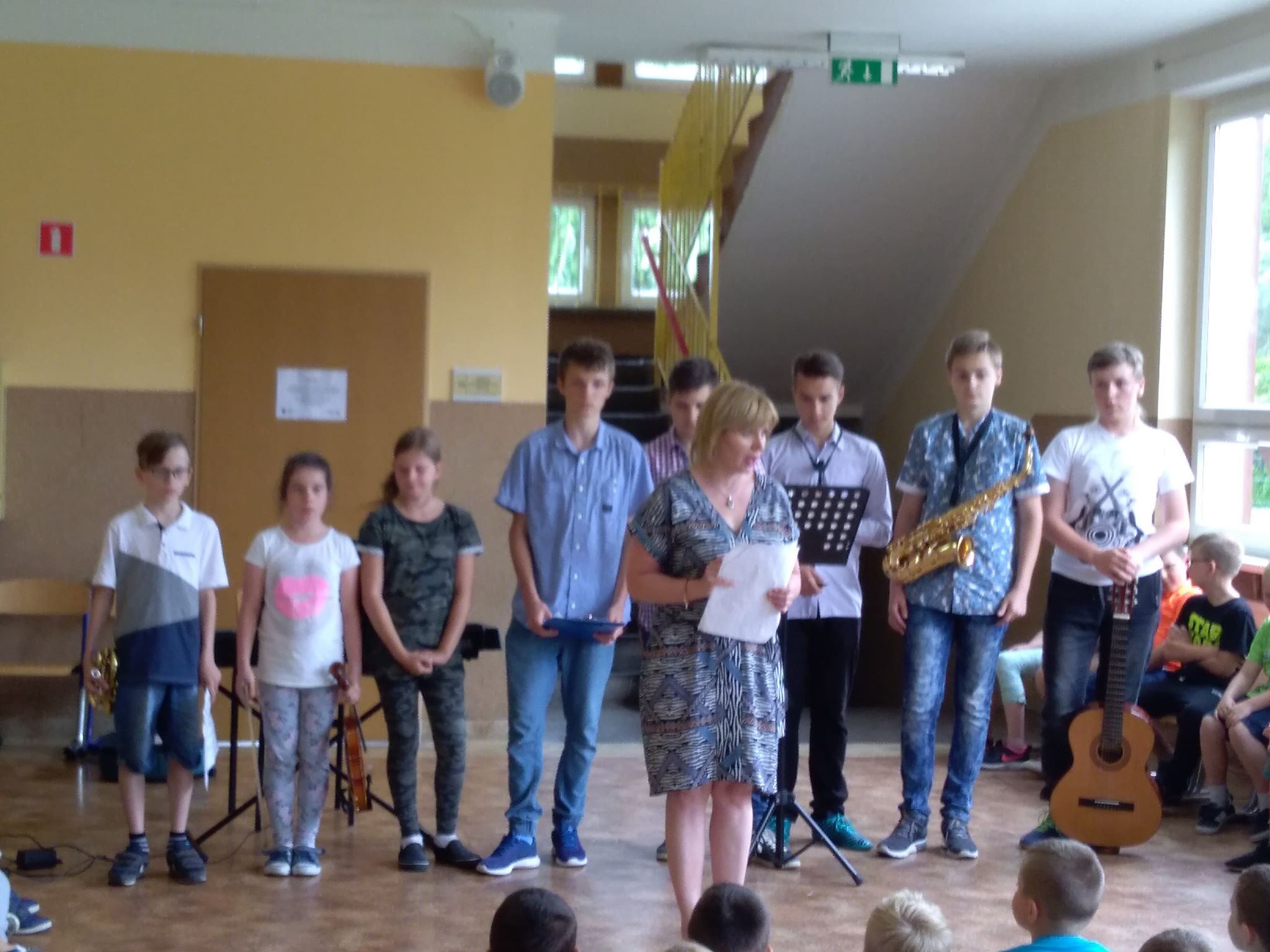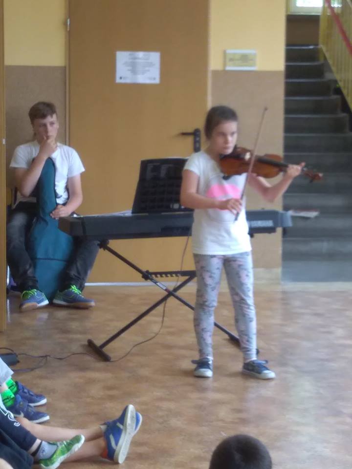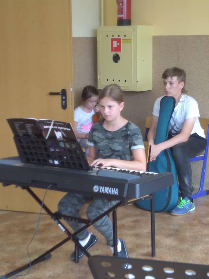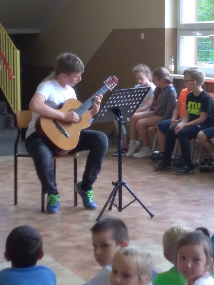 Dzieci z grupy IV – 6 latki miały możliwość wysłuchania koncertu instrumentalnego w wykonaniu uczniów naszej szkoły. Uczniowie pod opieką p. Beaty Murańskiej zaprezentowali swoje umiejętności gry na różnych instrumentach: Ola Zdunek - fortepian, Konstancja Murańska - skrzypce, Hubert Murański - trąbka, Nikodem Abram - gitara, Jakub Ciosmak - saksofon. Każdy uczeń opowiadał o sposobie gry na swoim instrumencie oraz pochodzeniu wykonanego utworu. Bardzo nam się podobało i muzycy nasi zostali nagrodzeni gromkimi brawami. Dziękujemy!!!