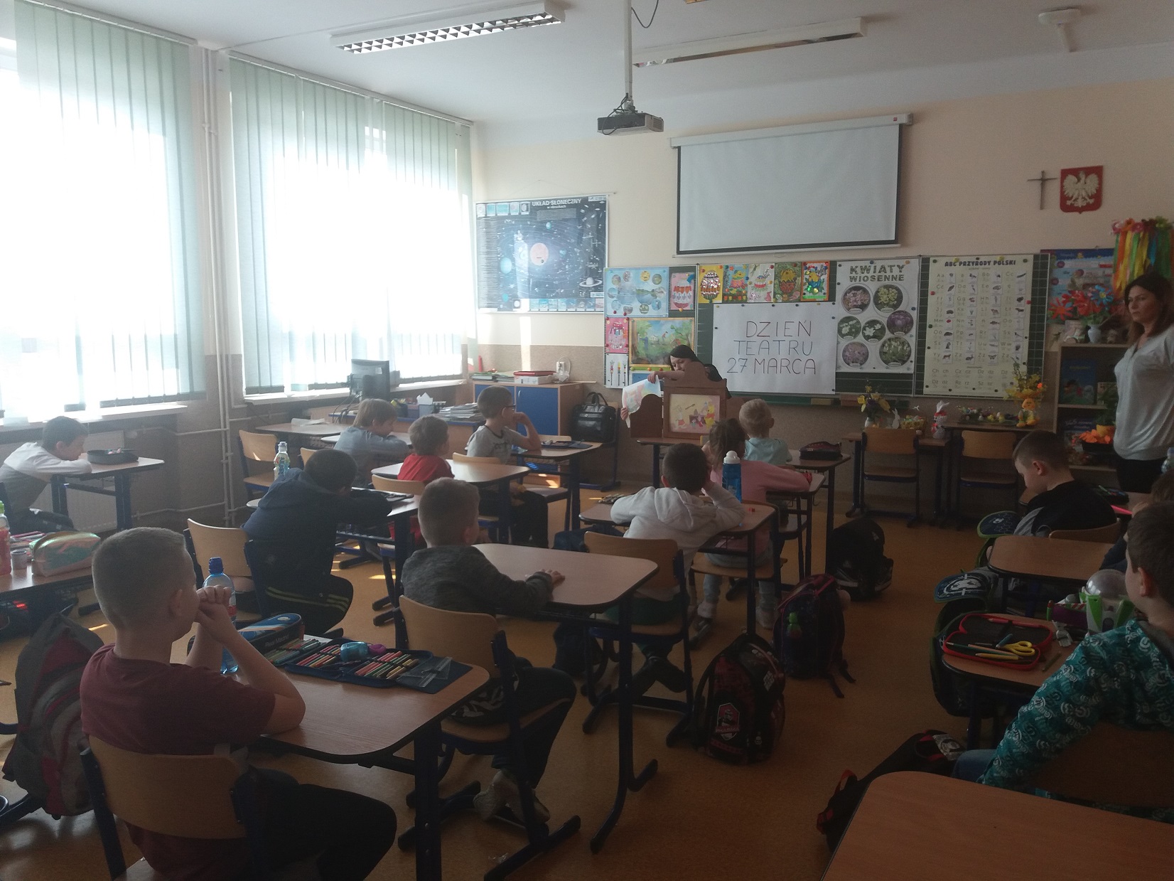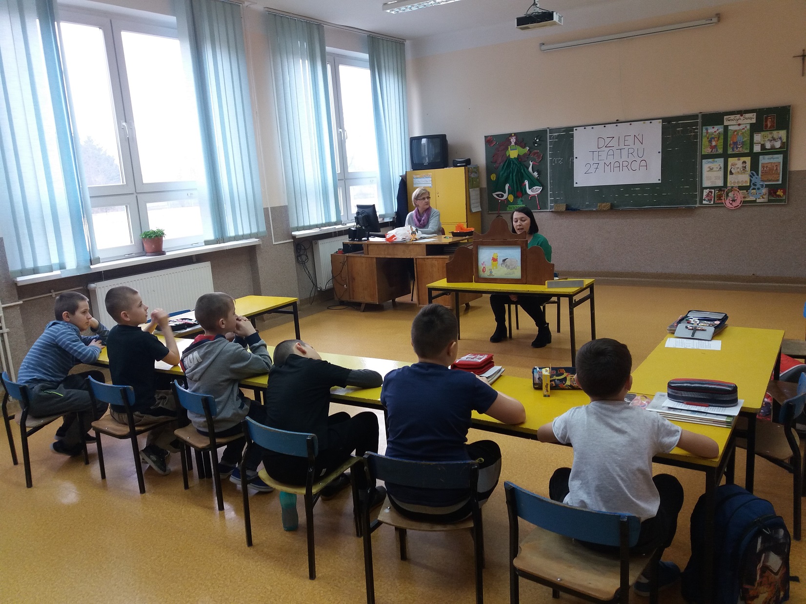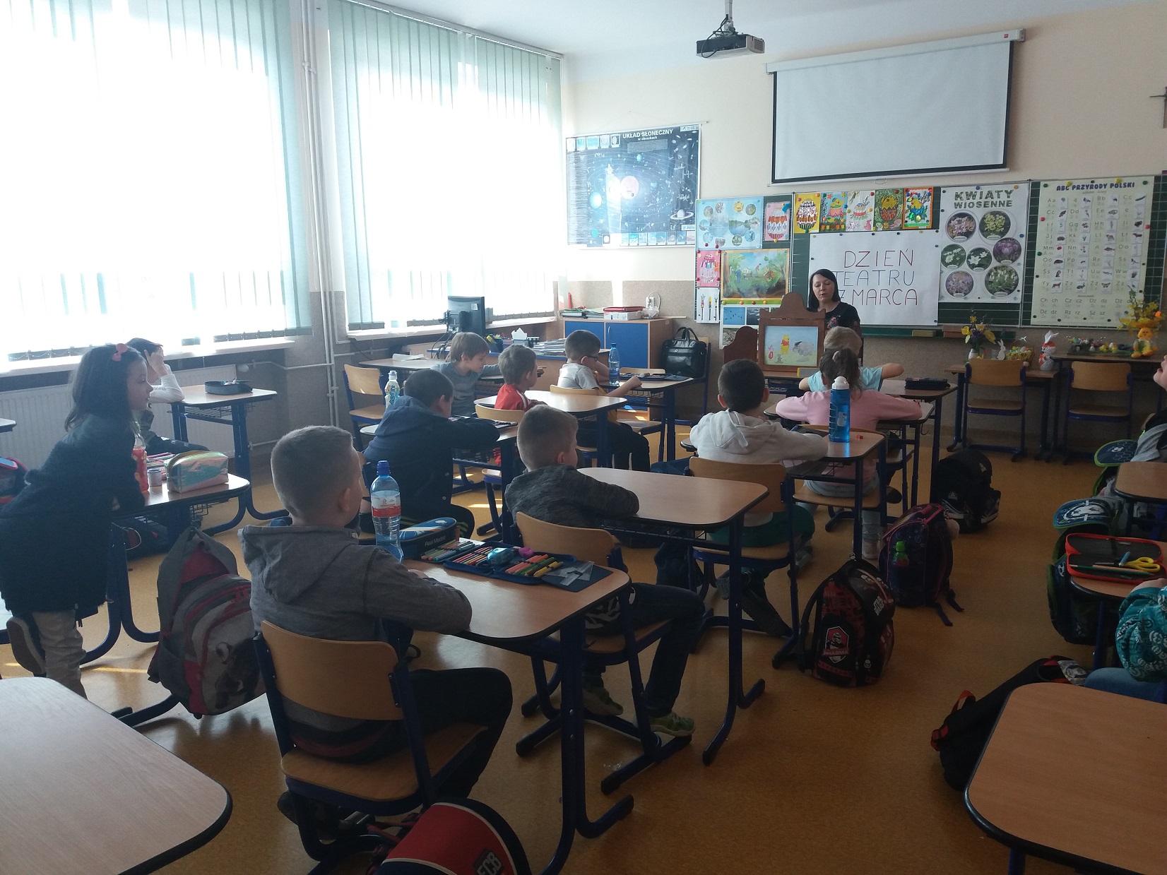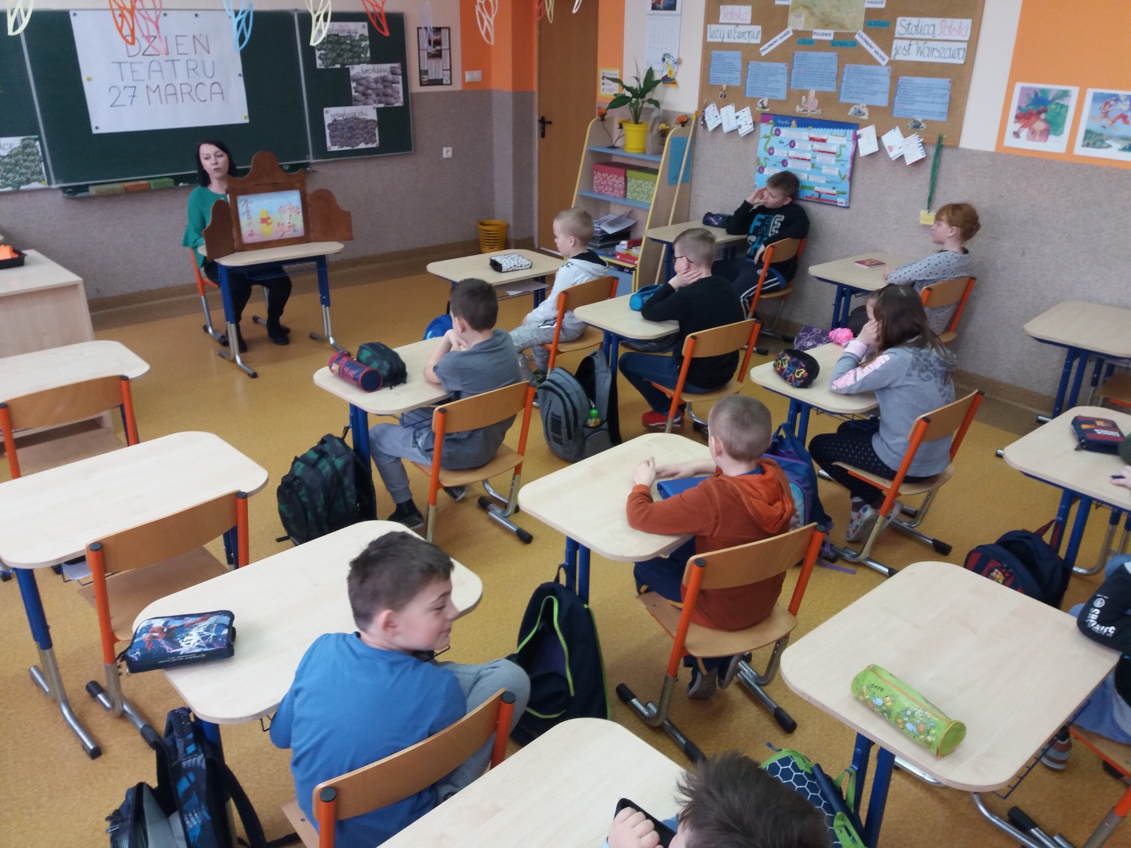 Z okazji przypadającego 27 marca Dnia Teatru nauczycielka biblioteki szkolnej pani Violetta Kusz zorganizowała dla swoich najmłodszych czytelników teatrzyk kamishibai pt. ”Kubuś Puchatek – Dzień Przyjaźni”.