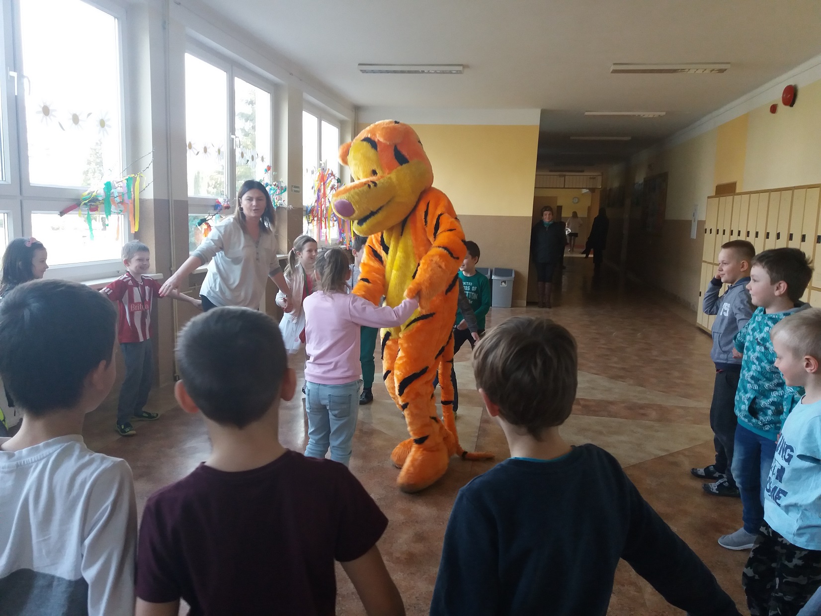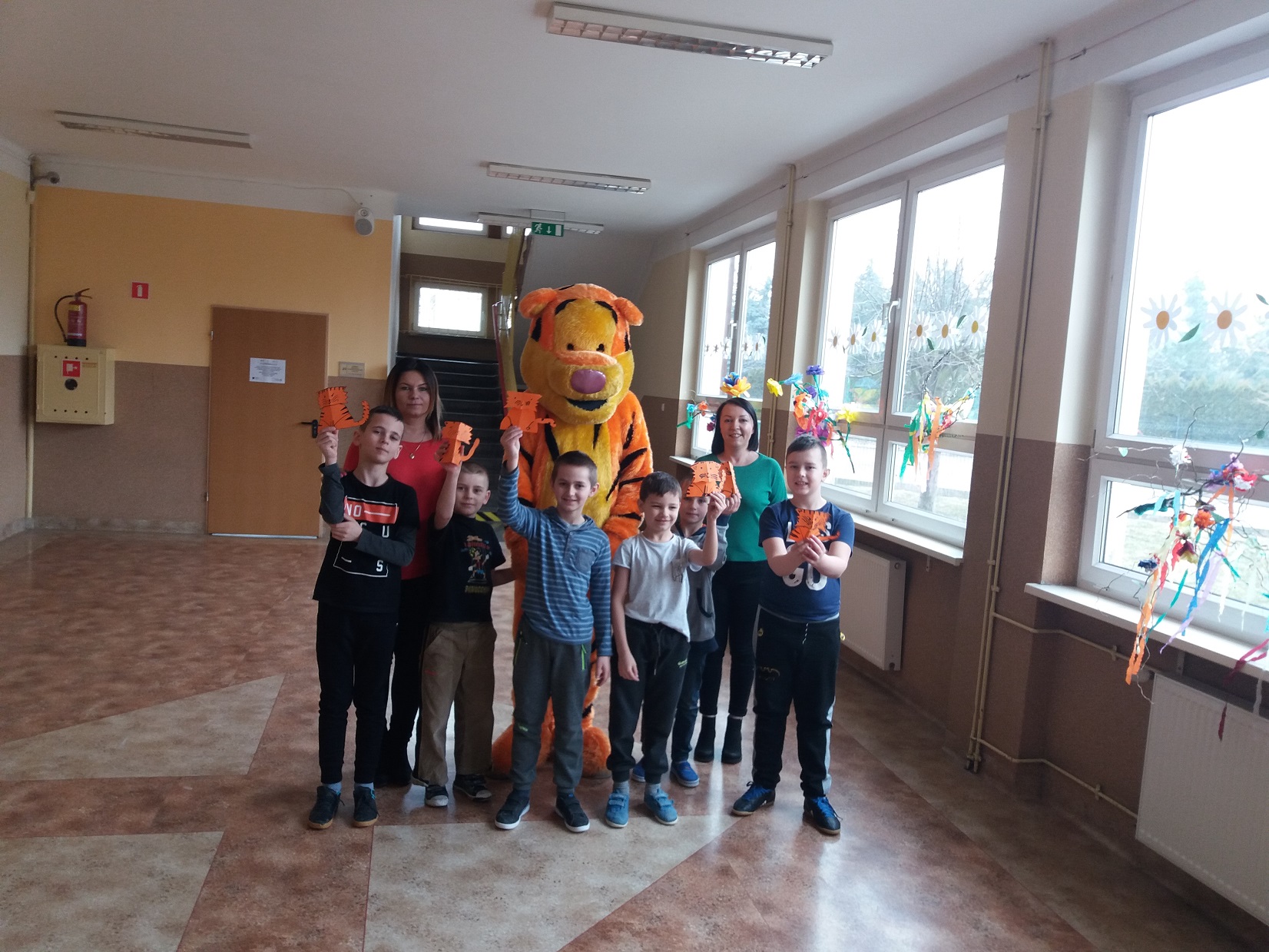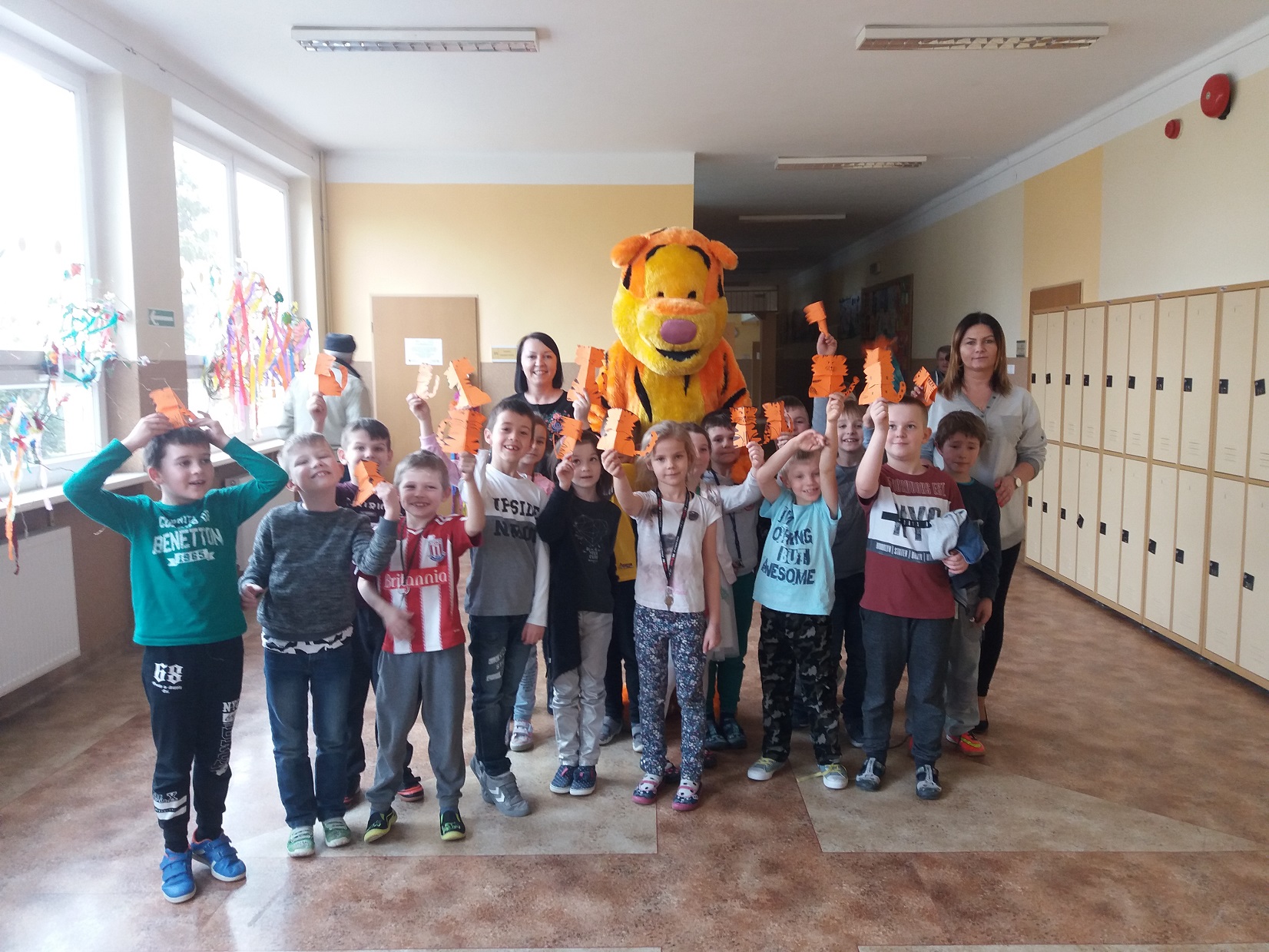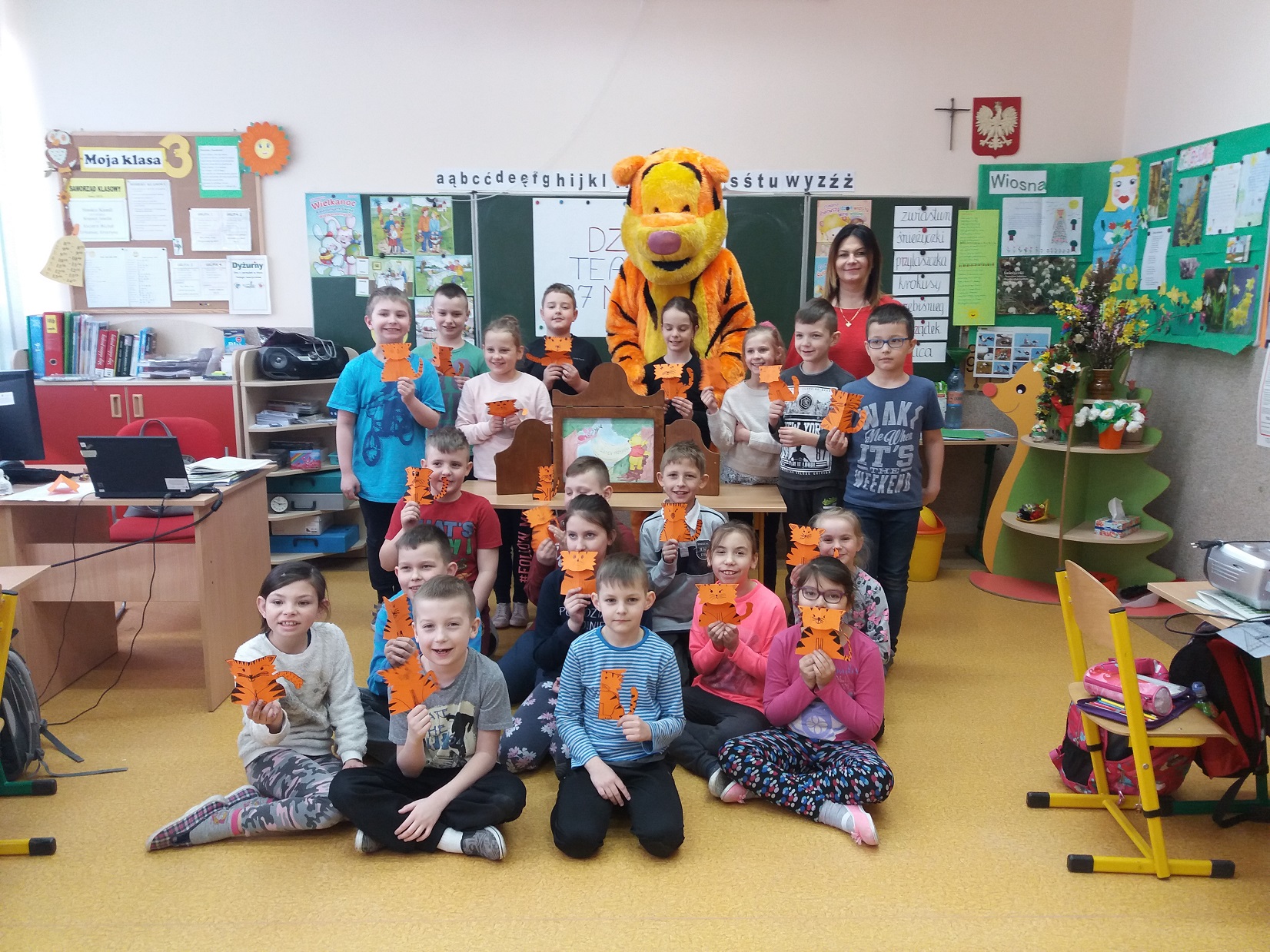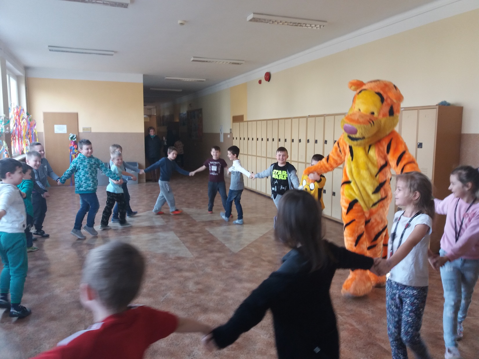 Uczniowie klas 1 – 3 szkoły podstawowej wysłuchali przygody Kubusia Puchatka o przyjaźni w oparciu o teatrzyk Kamishibai. Po wysłuchaniu bajki dzieci pokolorowały kolorowankę Tygryska przygotowaną przez panią pedagog Joannę Gniewczyńską. Następnie na uczniów czekała kolejna niespodzianka. Na zaproszenie pani pedagog do naszej szkoły przybył gość specjalny – Tygrysek, jeden z bohaterów bajki Kubusia Puchatka. Uczniowie mieli okazję zapoznać się Tygryskiem i wspólnie z nim zatańczyć.