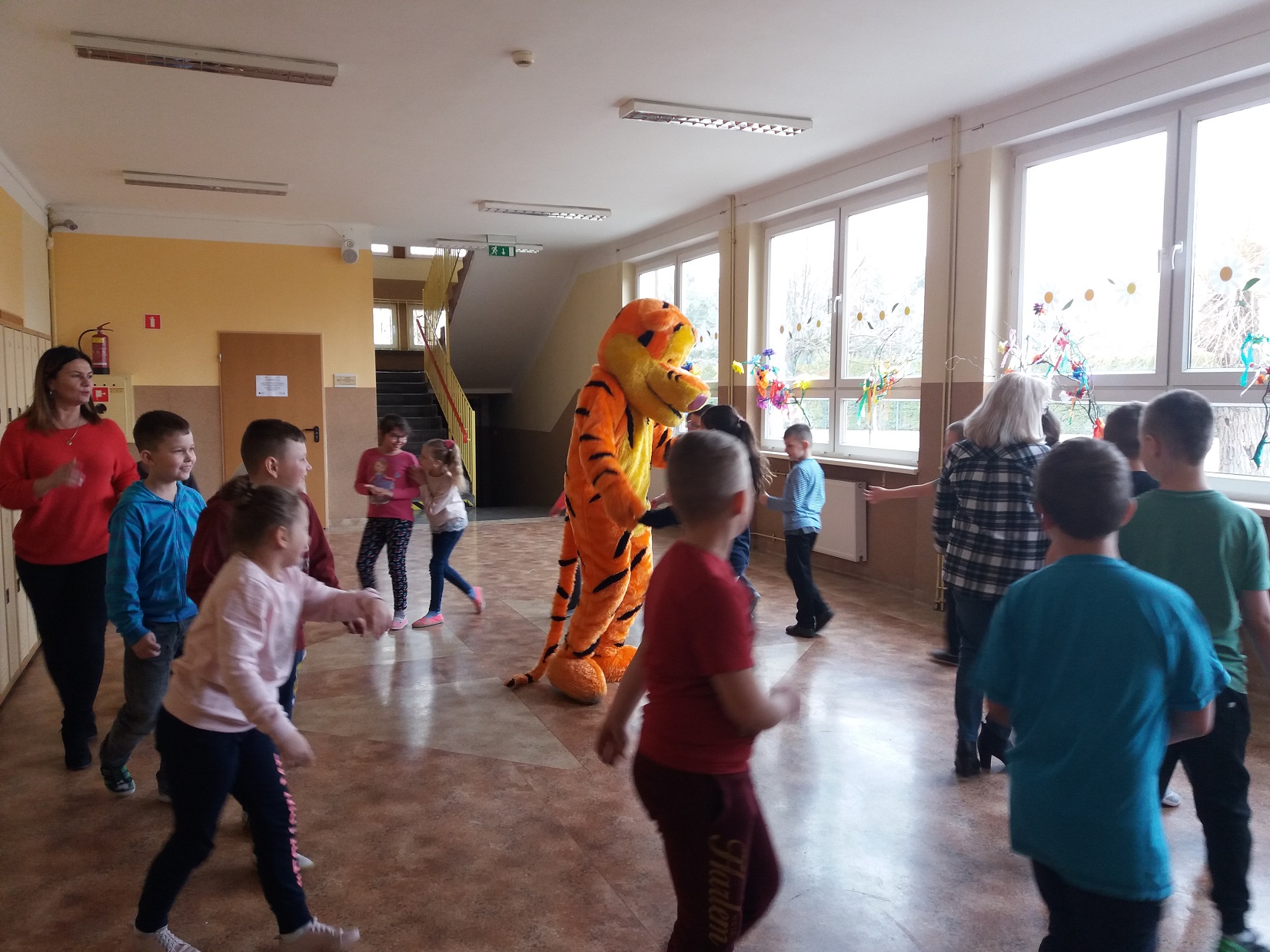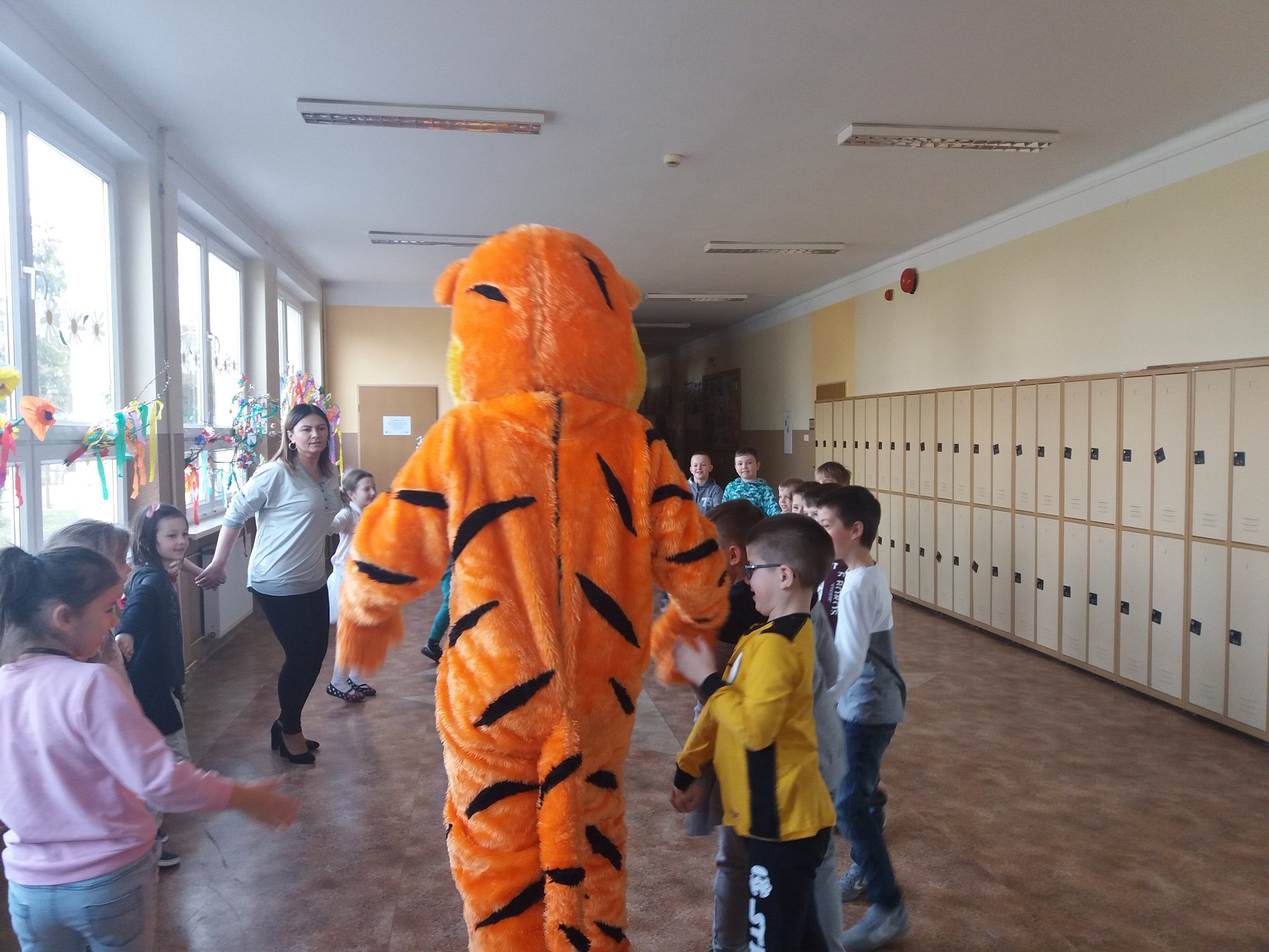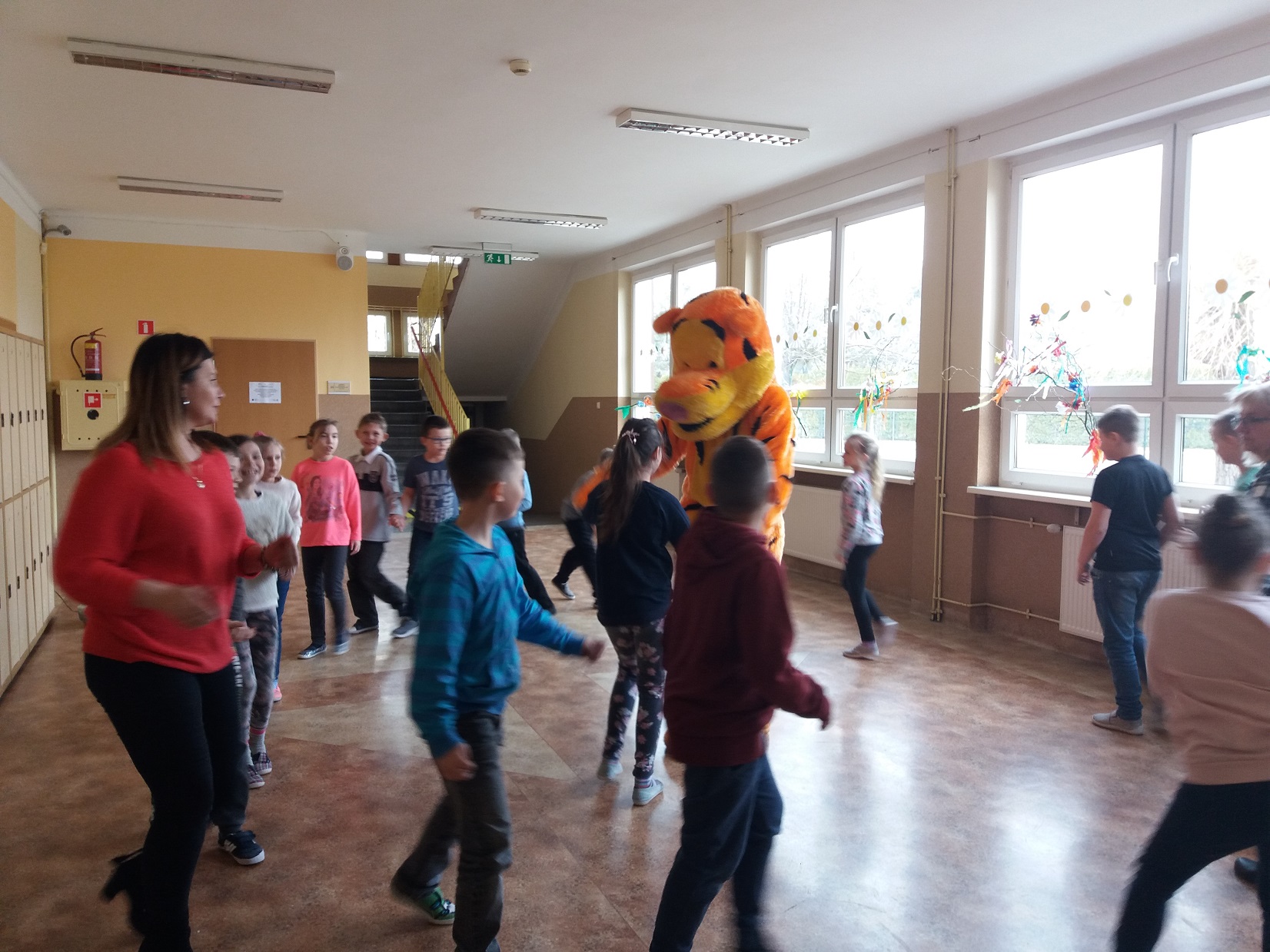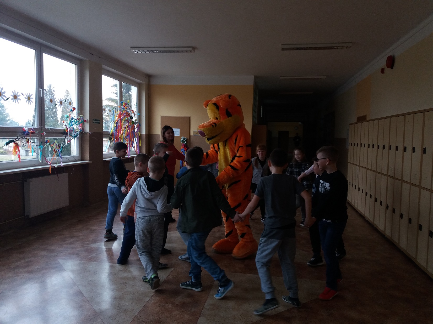 Uczniowie klas 1 – 3 szkoły podstawowej wysłuchali przygody Kubusia Puchatka o przyjaźni w oparciu o teatrzyk Kamishibai. Po wysłuchaniu bajki dzieci pokolorowały kolorowankę Tygryska przygotowaną przez panią pedagog Joannę Gniewczyńską. Następnie na uczniów czekała kolejna niespodzianka. Na zaproszenie pani pedagog do naszej szkoły przybył gość specjalny – Tygrysek, jeden z bohaterów bajki Kubusia Puchatka. Uczniowie mieli okazję zapoznać się Tygryskiem i wspólnie z nim zatańczyć.