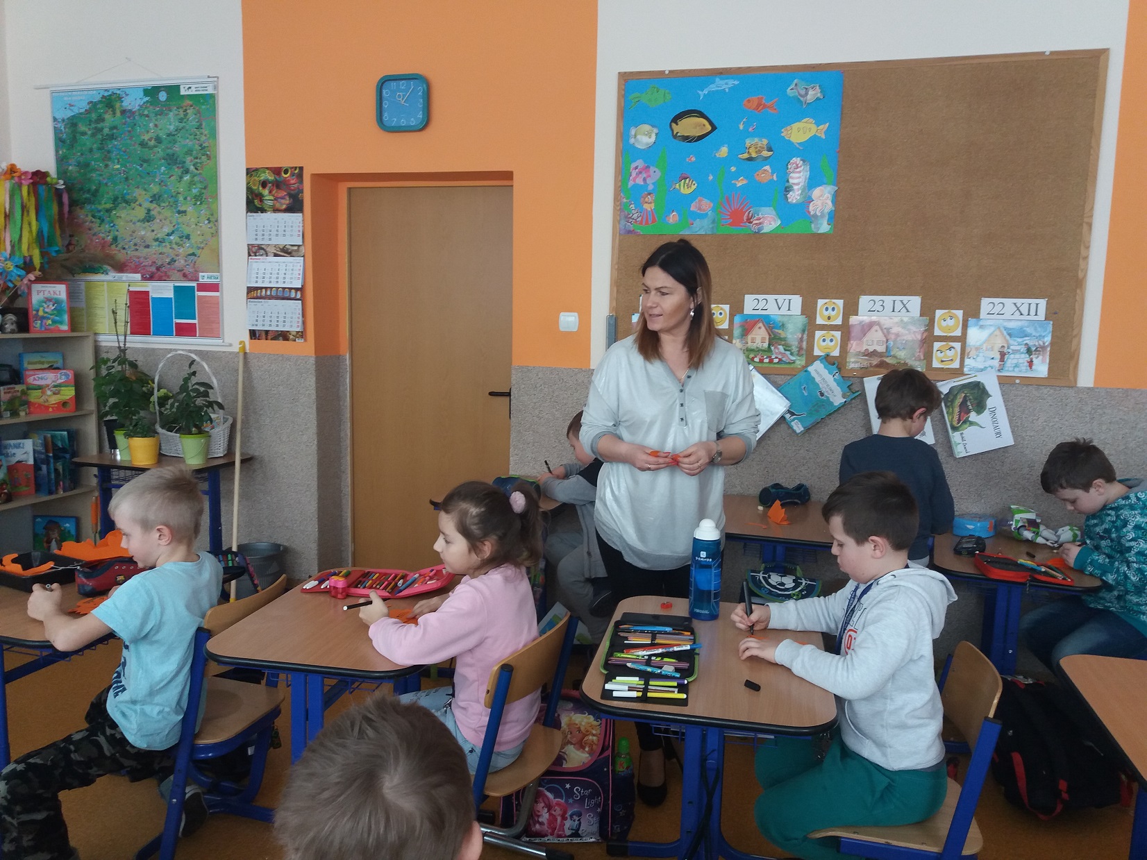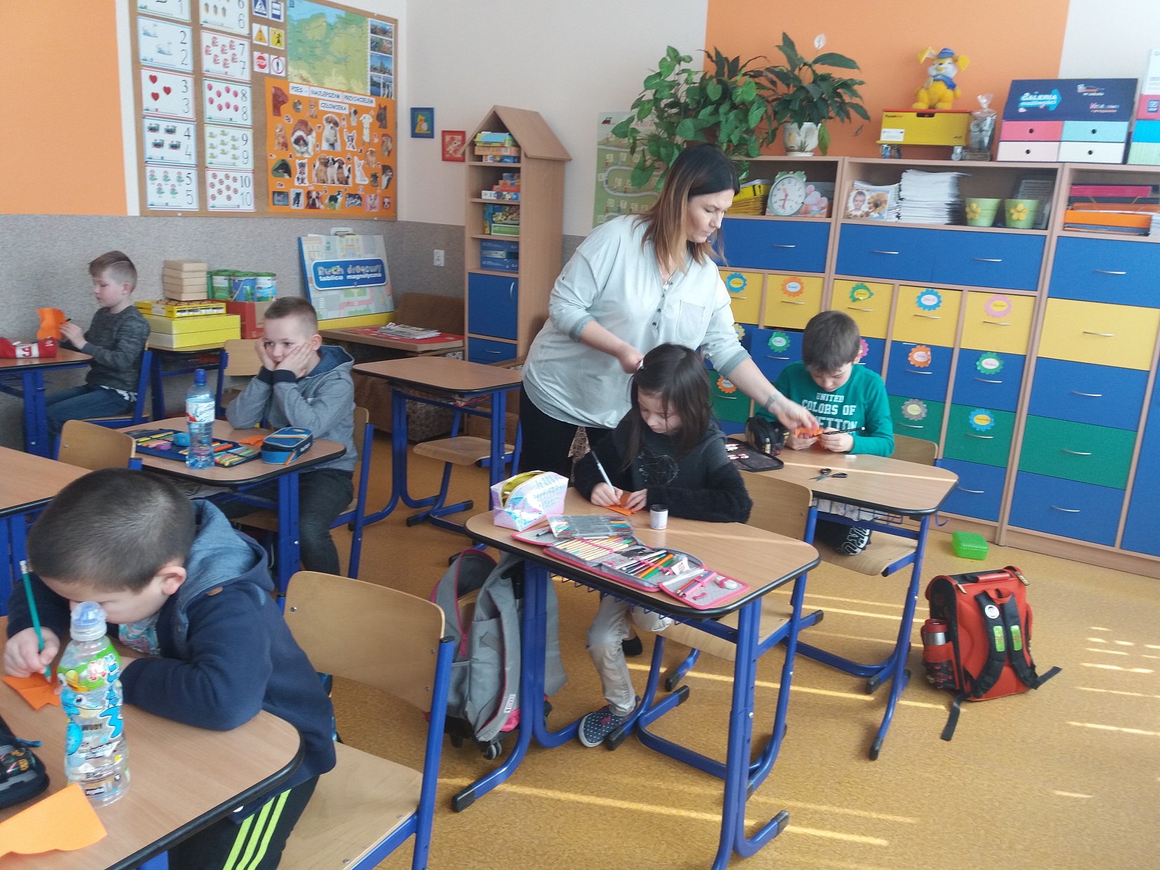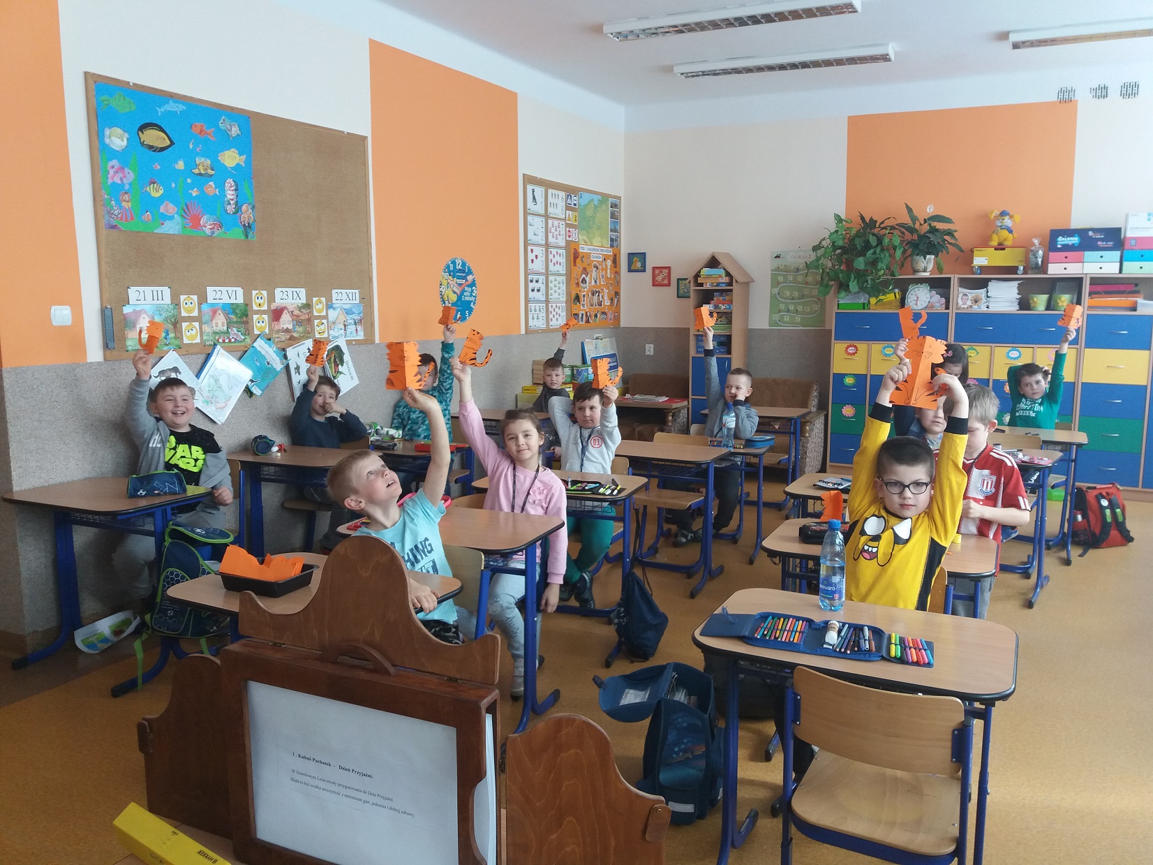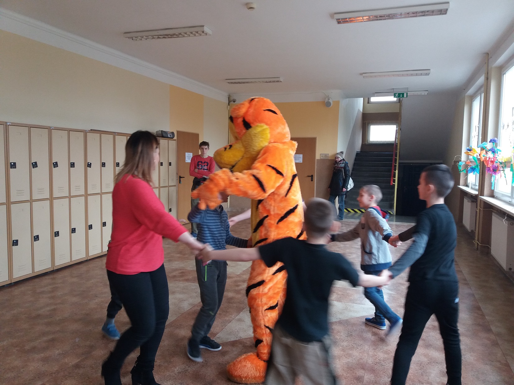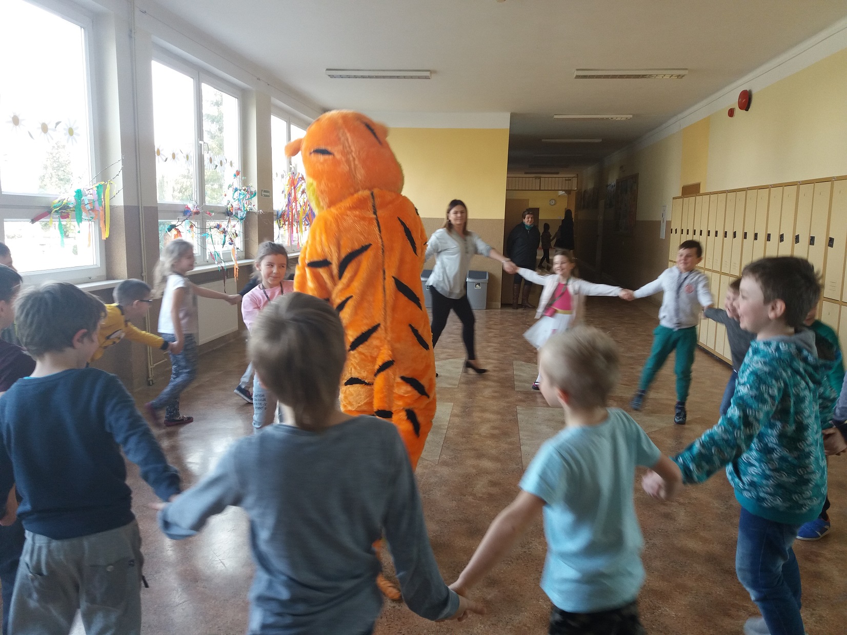 Uczniowie klas 1 – 3 szkoły podstawowej wysłuchali przygody Kubusia Puchatka o przyjaźni w oparciu o teatrzyk Kamishibai. Po wysłuchaniu bajki dzieci pokolorowały kolorowankę Tygryska przygotowaną przez panią pedagog Joannę Gniewczyńską. Następnie na uczniów czekała kolejna niespodzianka. Na zaproszenie pani pedagog do naszej szkoły przybył gość specjalny – Tygrysek, jeden z bohaterów bajki Kubusia Puchatka. Uczniowie mieli okazję zapoznać się Tygryskiem i wspólnie z nim zatańczyć.