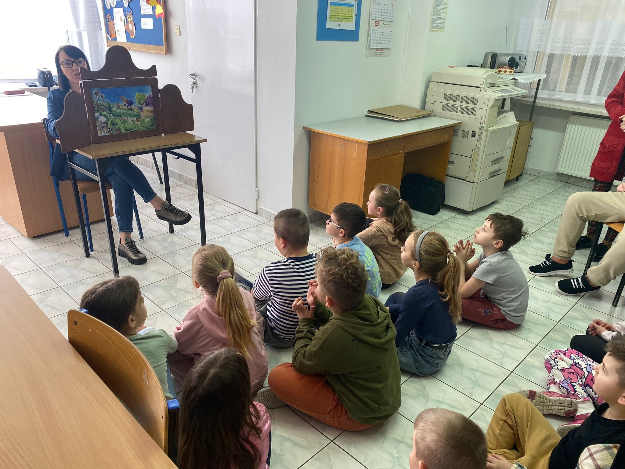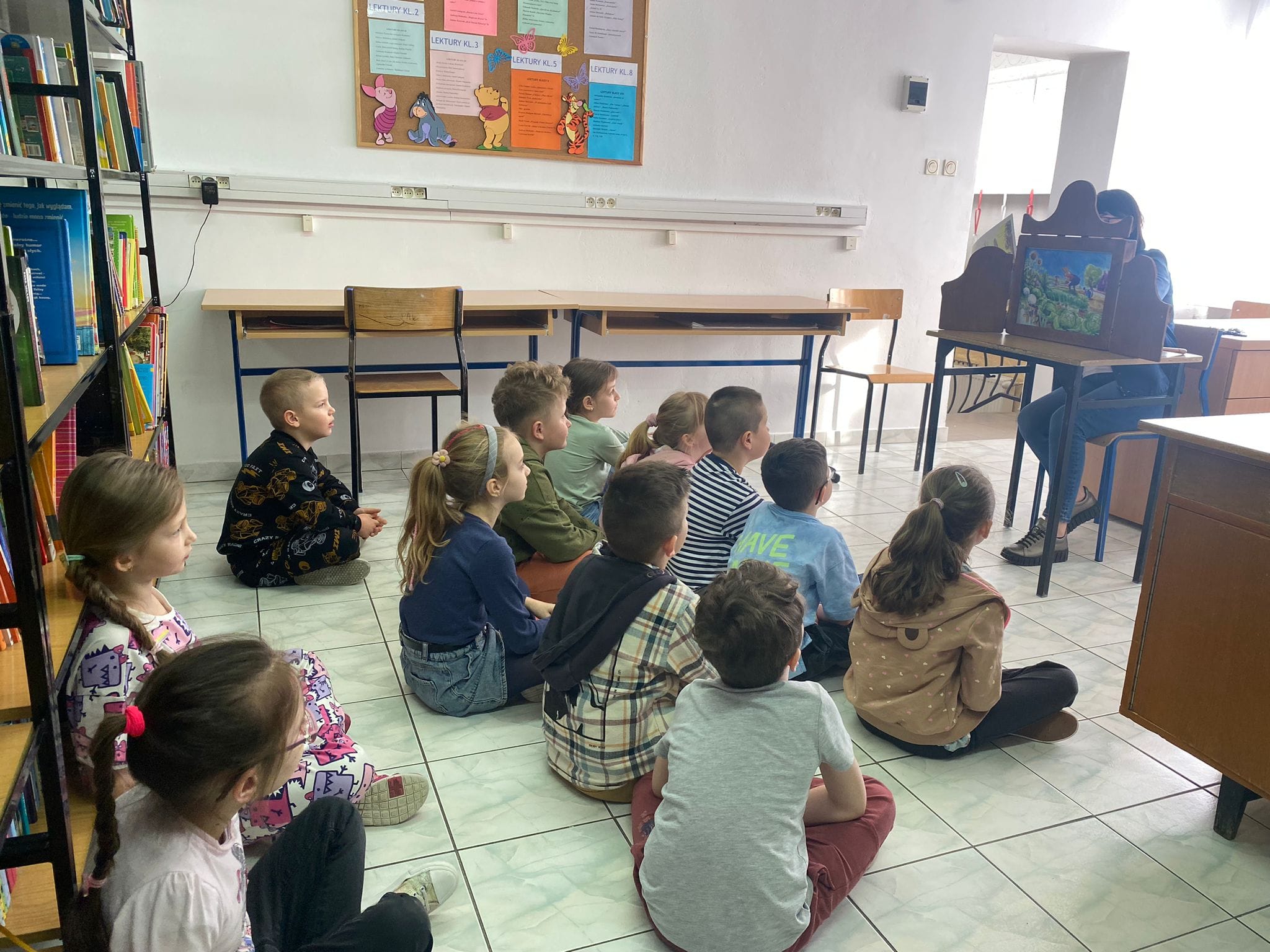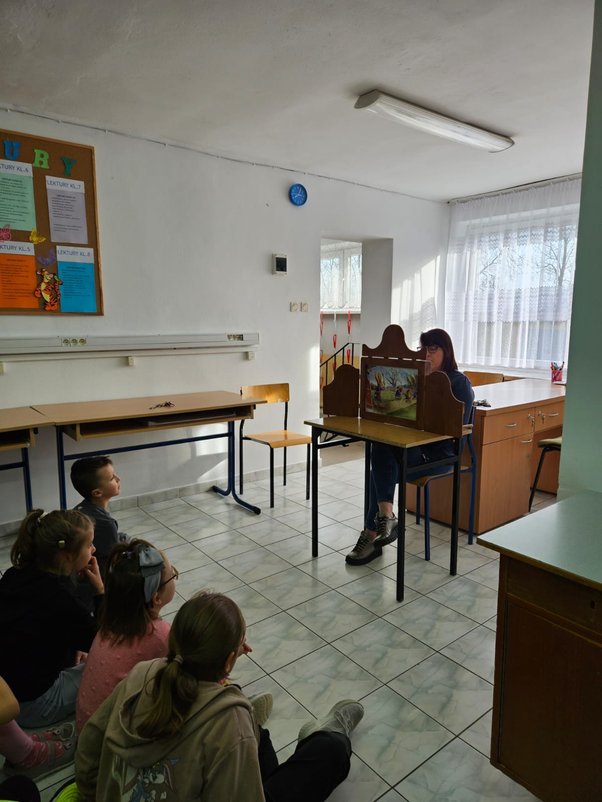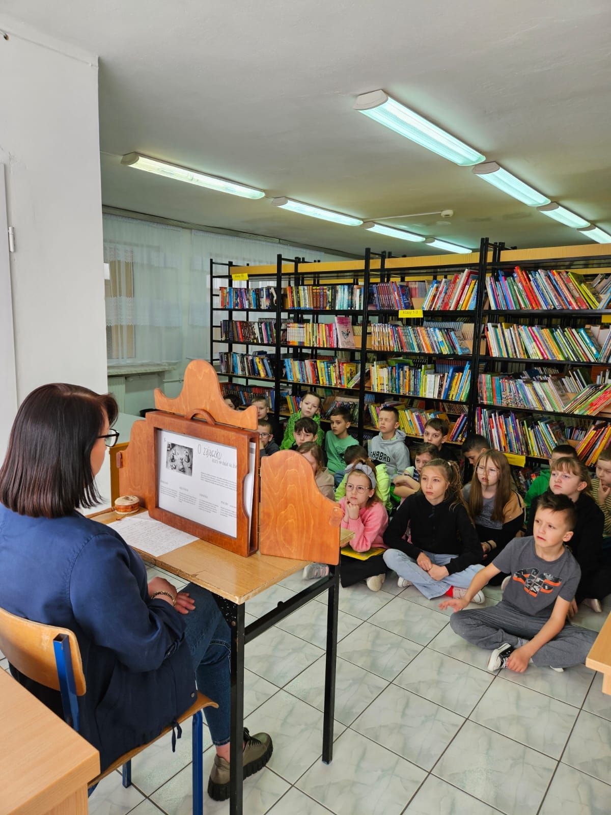 27 marca - Międzynarodowy Dzień Teatru. Z tej okazji uczniowie klas 1, 2a i 2b odwiedzili bibliotekę szkolna. Wysłuchali bajki w formie Teatrzyku Kamishibai "O zajączku, który nie chciał się dzielić".